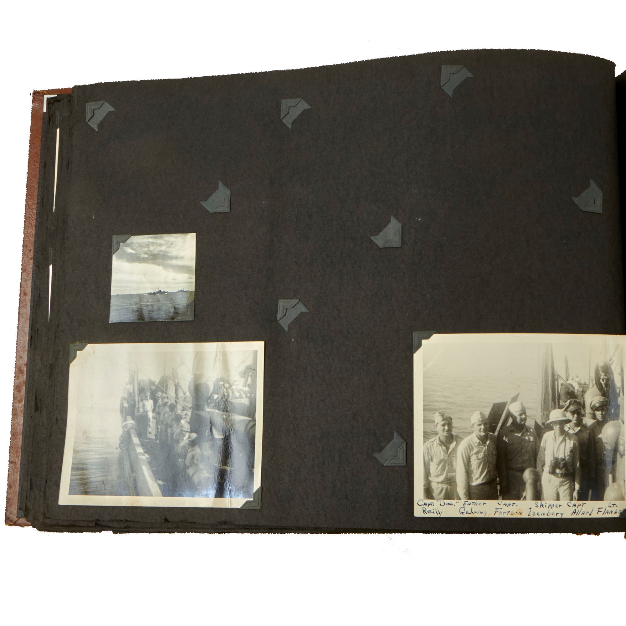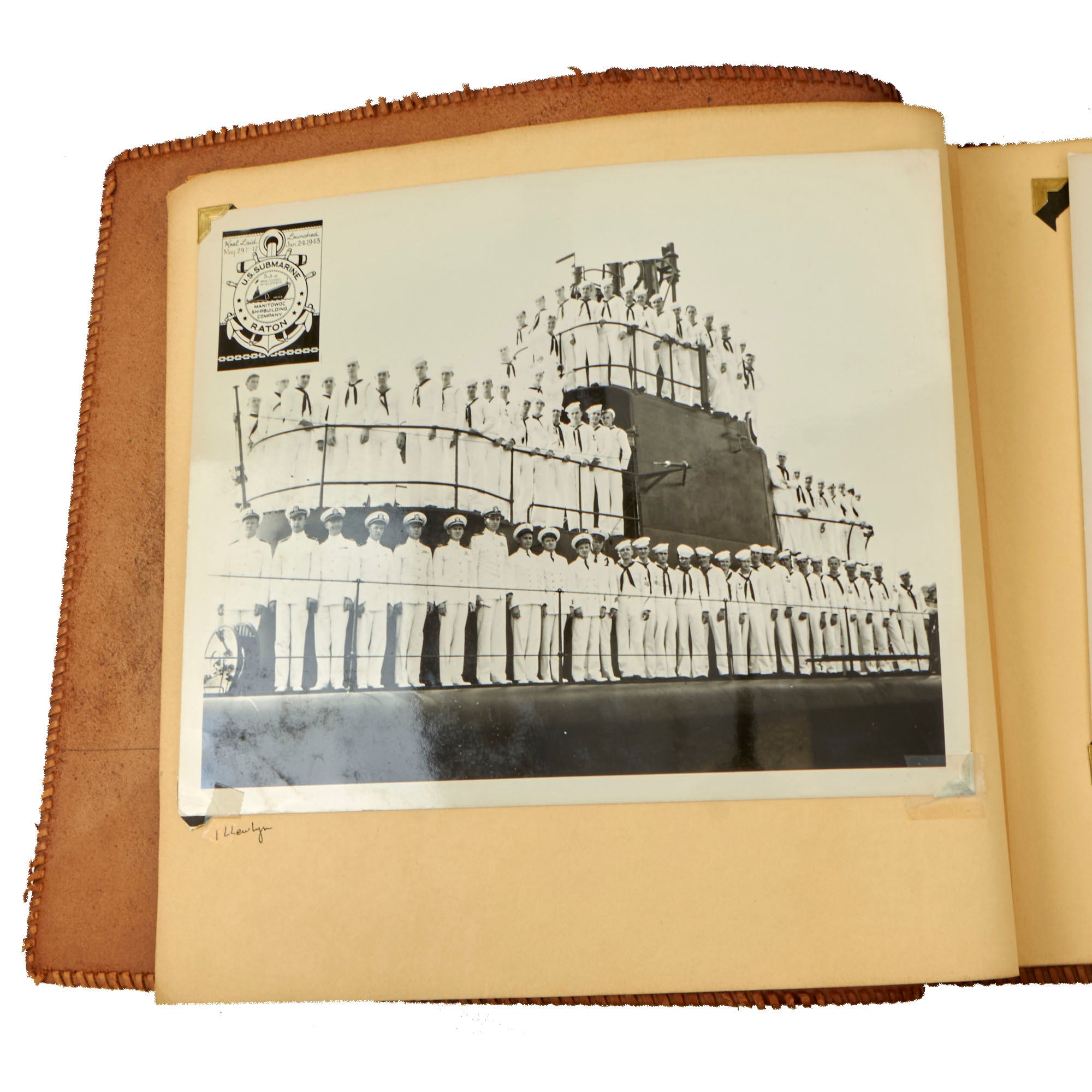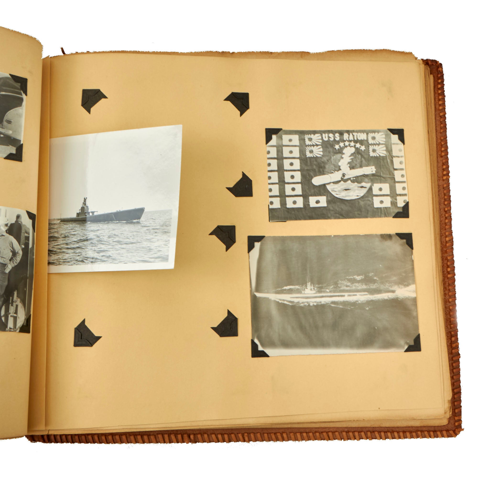 Original Items. One-of-a-Kind Group. These are the outstanding photo albums of Navy Captain D.J. Mooney, who served aboard the USS Raton, a Gato-class submarine which saw extensive service in the Asitatic Theater during World War II. There is a modern tag on the interior naming it to a Capt. D.J. Mooney, who we couldn’t find in the rosters, but in one album is a sleeve with a portrait of Lieutenant D. W. Sencenbaugh, the communications officer aboard the USS Raton, who we believe is more likely to be the owner. Both albums together contain a staggering 346 photographs, with many photos aboard the submarine, some photos of its battle flag, and an outstanding photograph of a Japanese merchant ship going down which was used in a newspaper article shown on the following page!