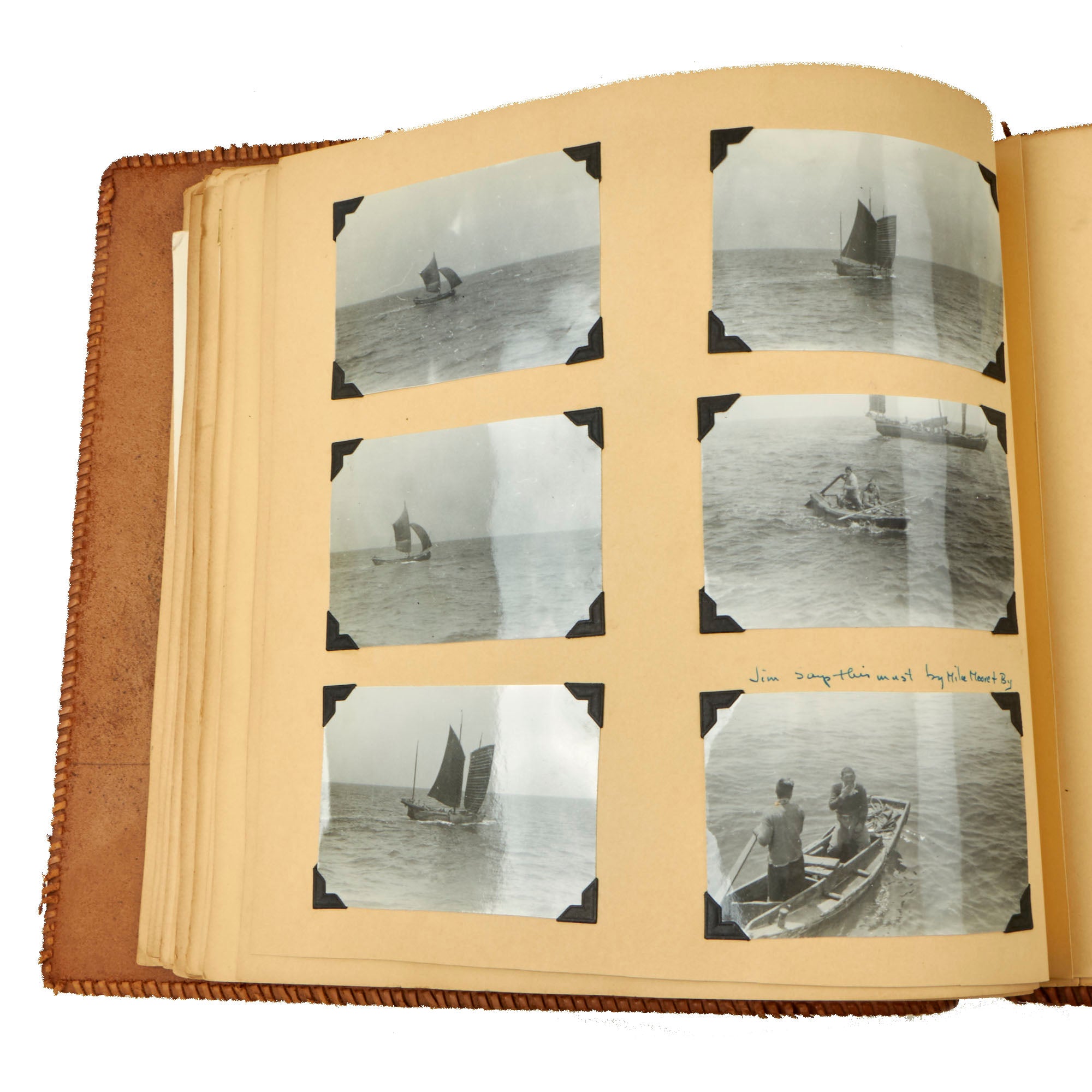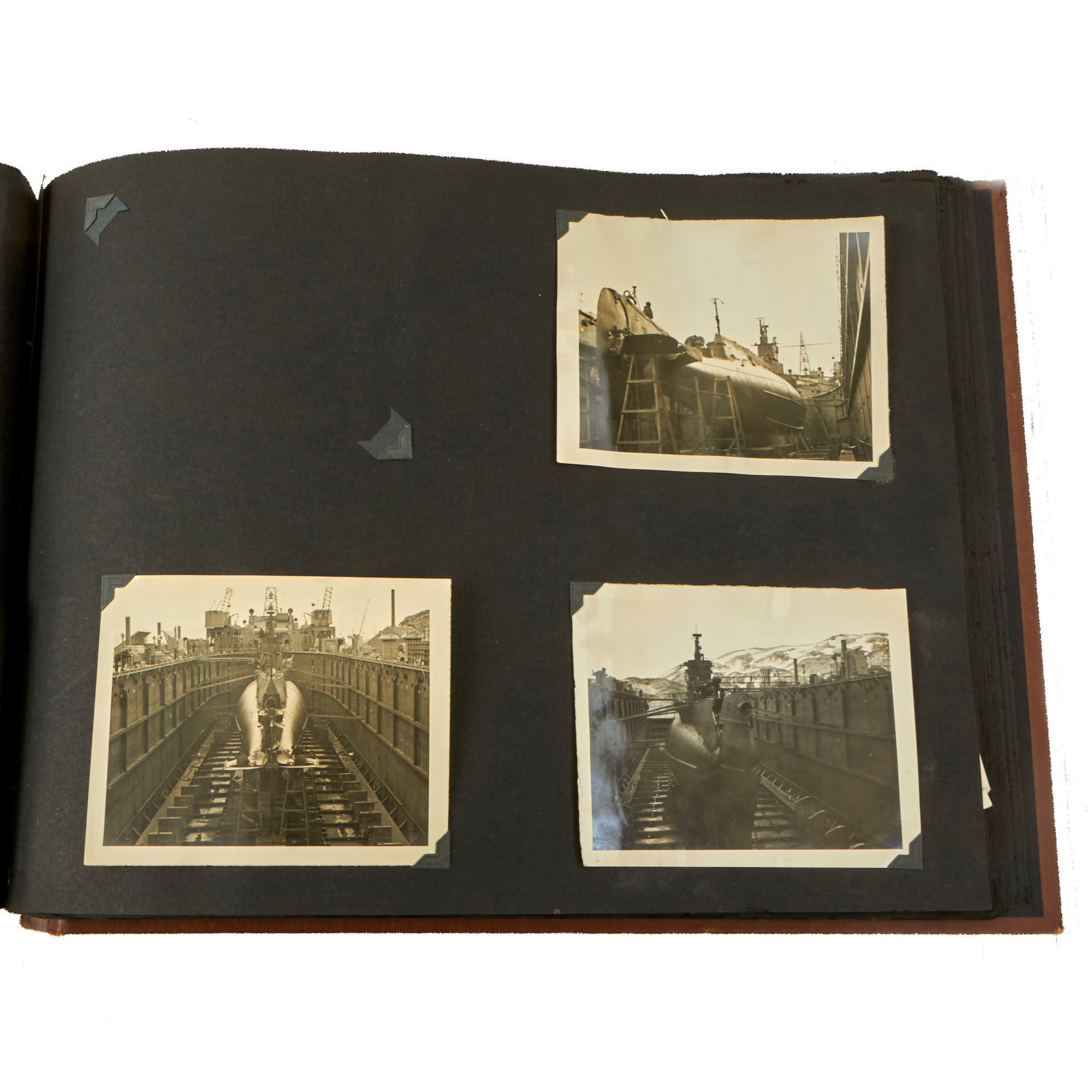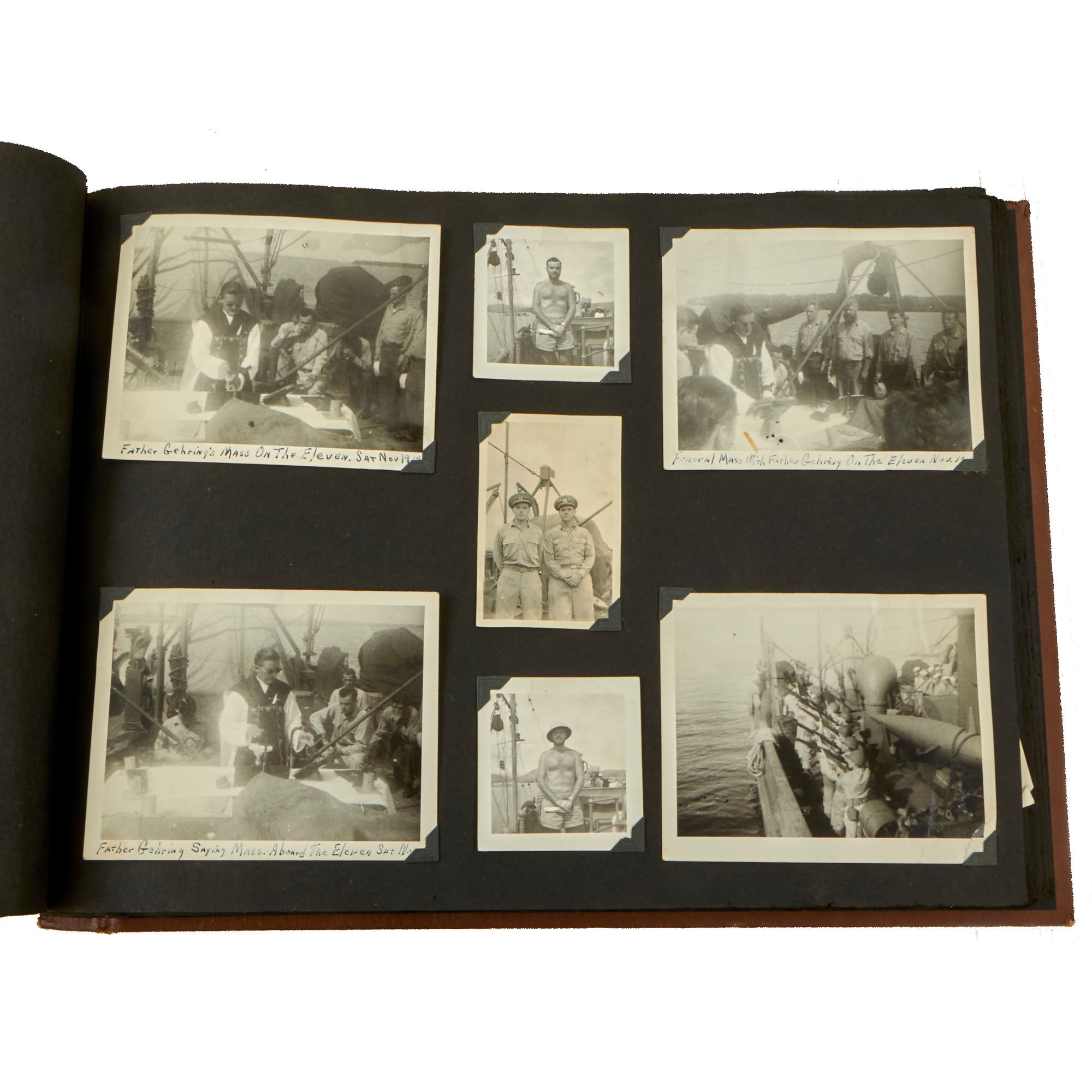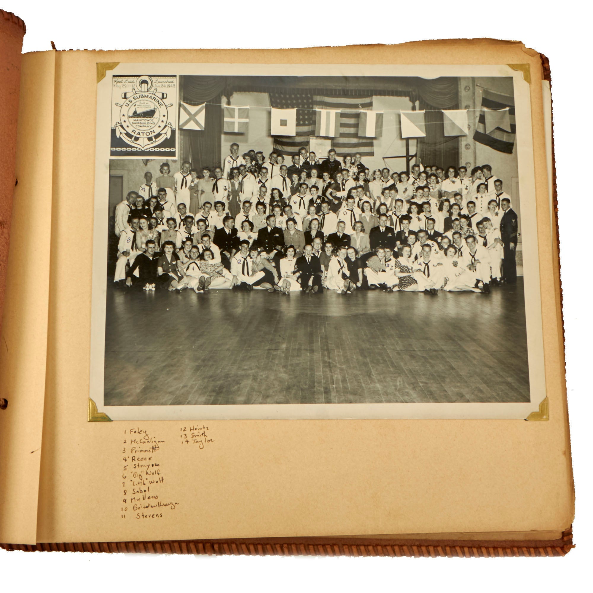 Original Items. One-of-a-Kind Group. These are the outstanding photo albums of Navy Captain D.J. Mooney, who served aboard the USS Raton, a Gato-class submarine which saw extensive service in the Asitatic Theater during World War II. There is a modern tag on the interior naming it to a Capt. D.J. Mooney, who we couldn’t find in the rosters, but in one album is a sleeve with a portrait of Lieutenant D. W. Sencenbaugh, the communications officer aboard the USS Raton, who we believe is more likely to be the owner. Both albums together contain a staggering 346 photographs, with many photos aboard the submarine, some photos of its battle flag, and an outstanding photograph of a Japanese merchant ship going down which was used in a newspaper article shown on the following page!