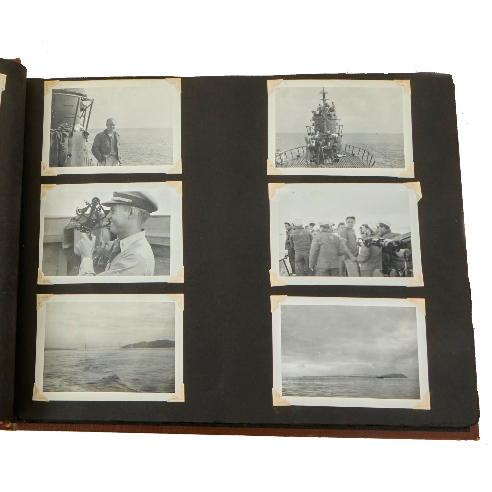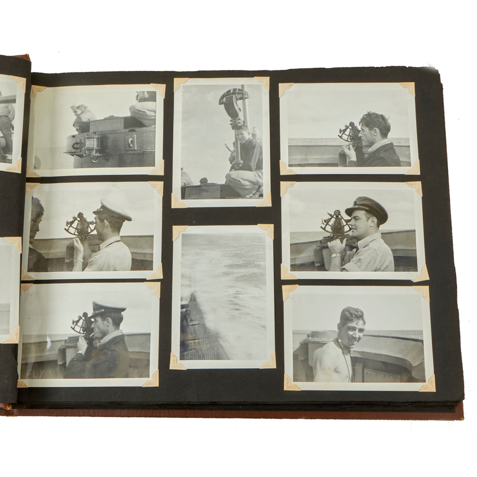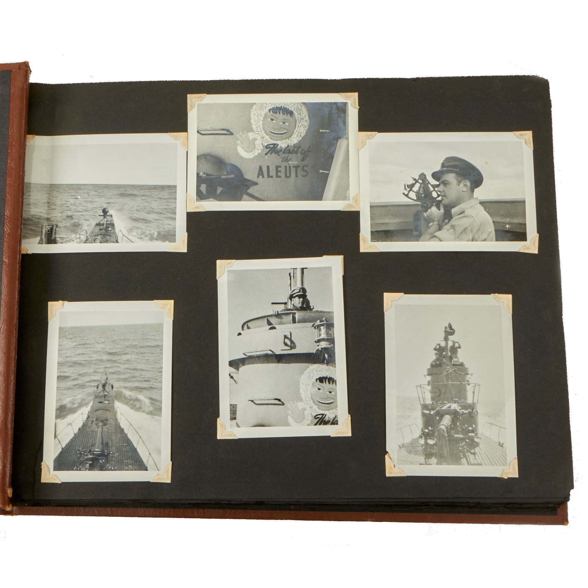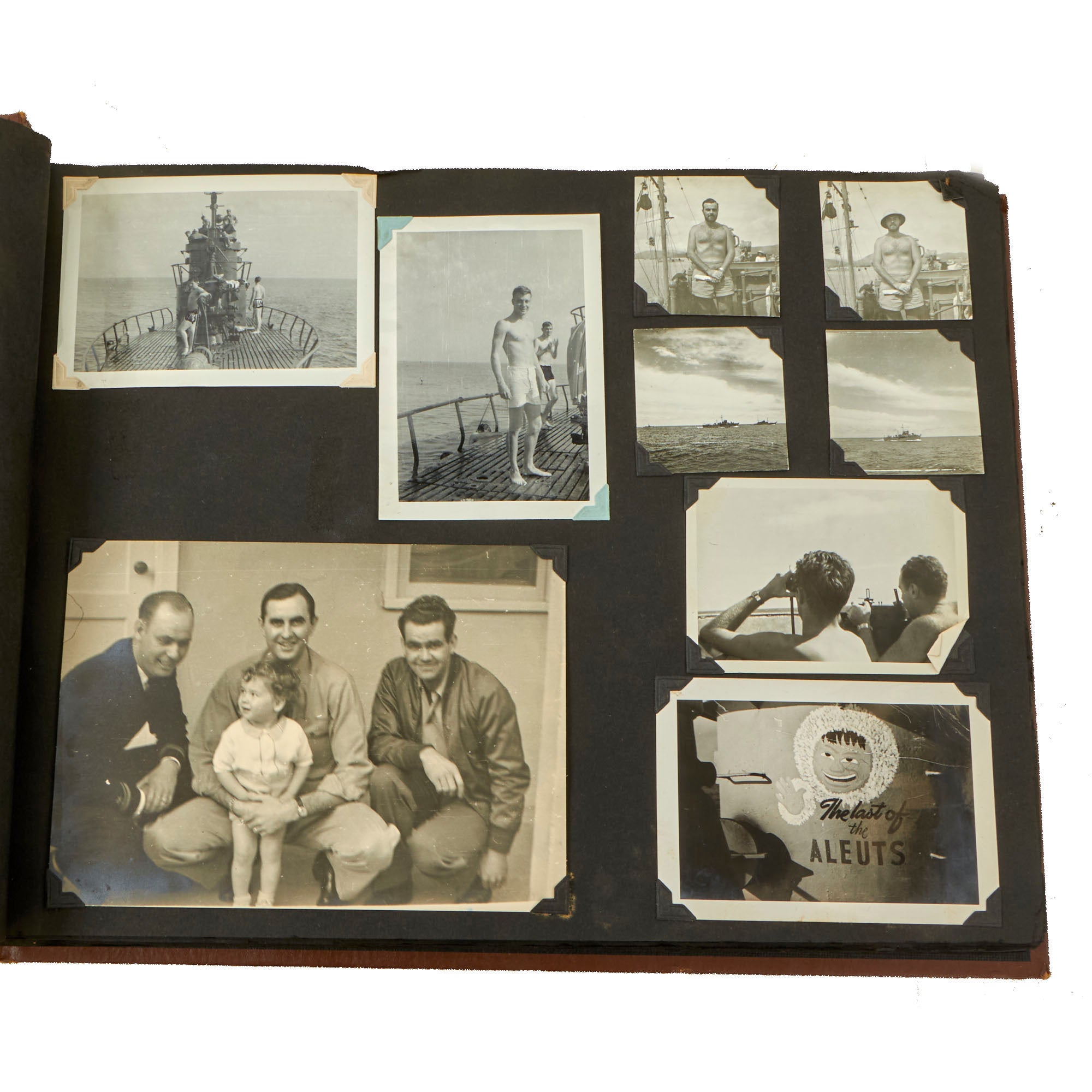 The first album, which is the larger 11½ x 15½” album, contains 225 photographs. These include photos of men aboard the Raton, with “The Last of the Aleuts” painted on the side, an interesting reference. There are many photos of men using a sextant, looking towards the land, many photos of the open sea through the spyglass of the submarine, photos of the tropical places they visited, places they stayed on leave, photos of officers and women in the places they visited. There are photos of the submarine on a dry dock, and some larger photos of officers and crew.