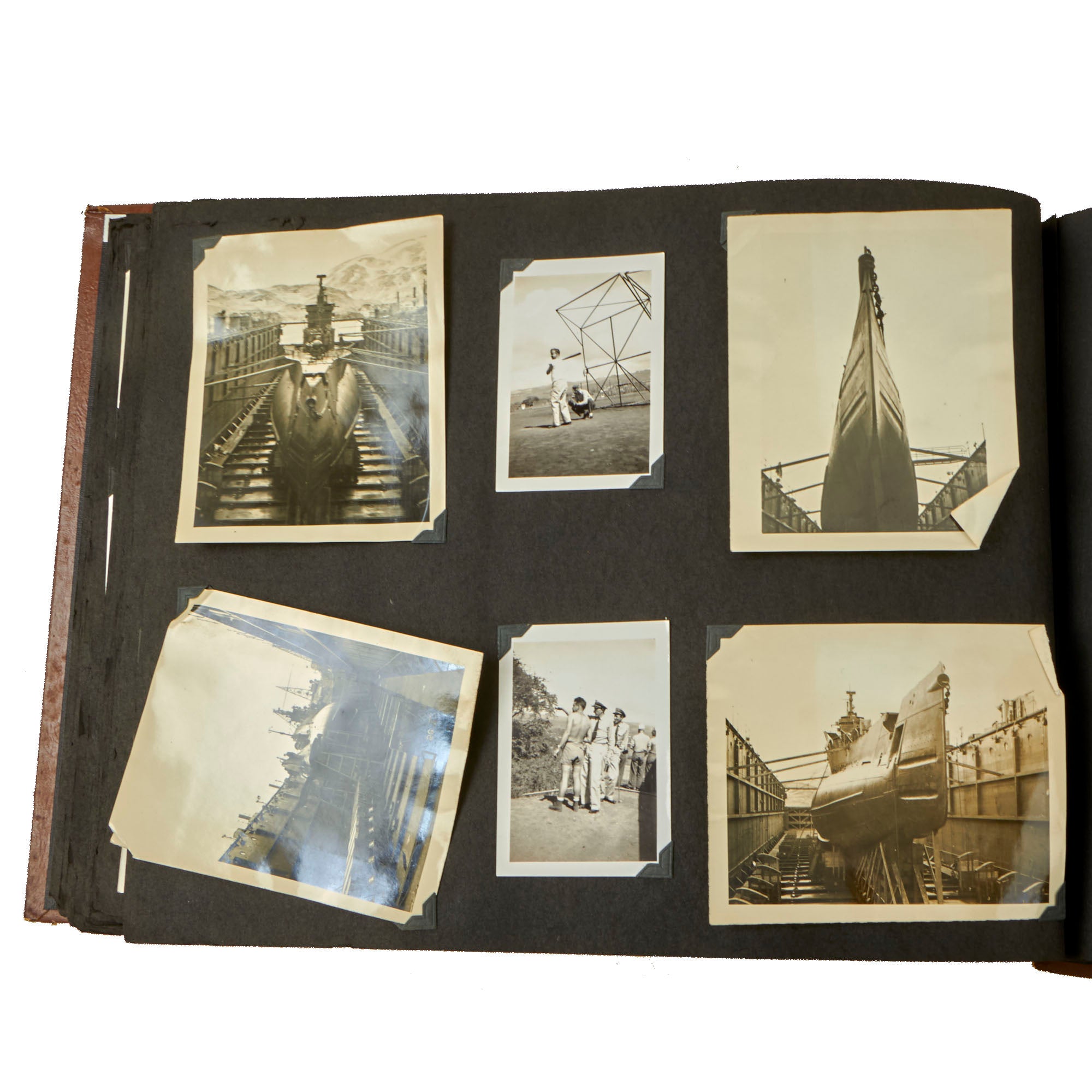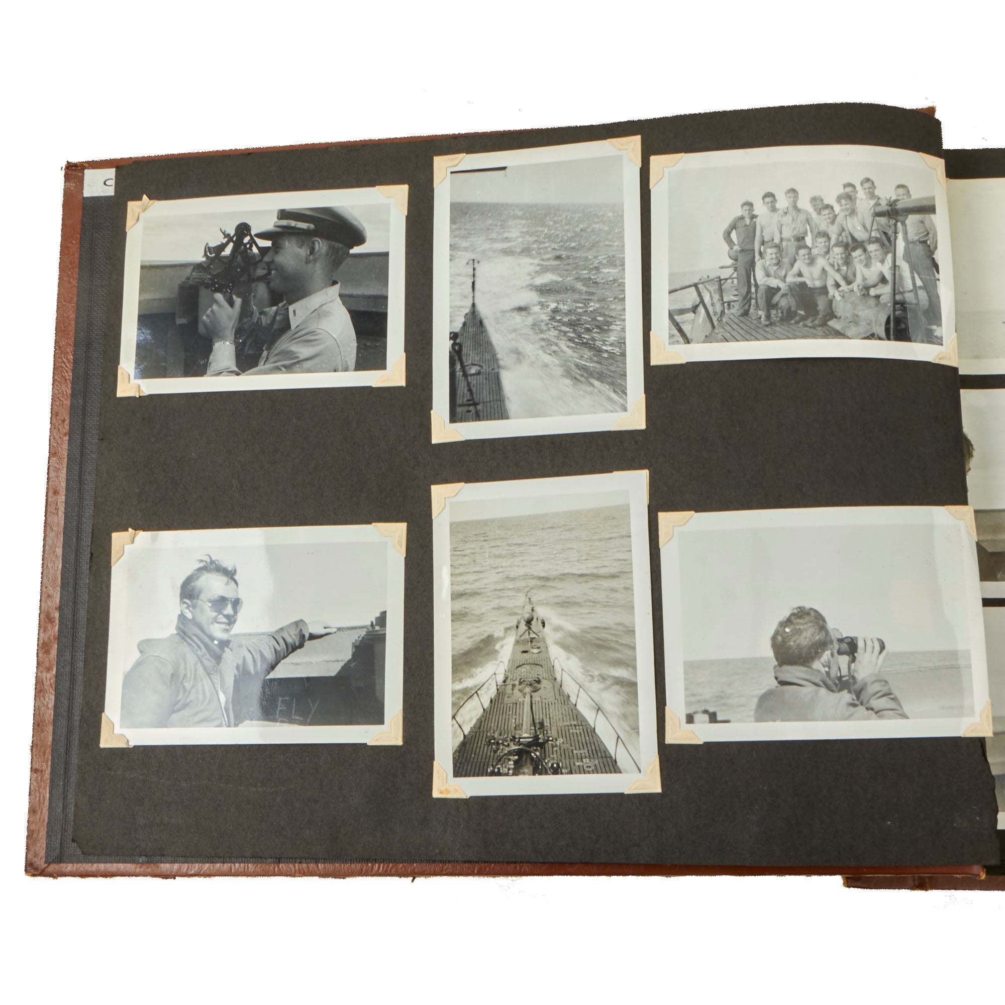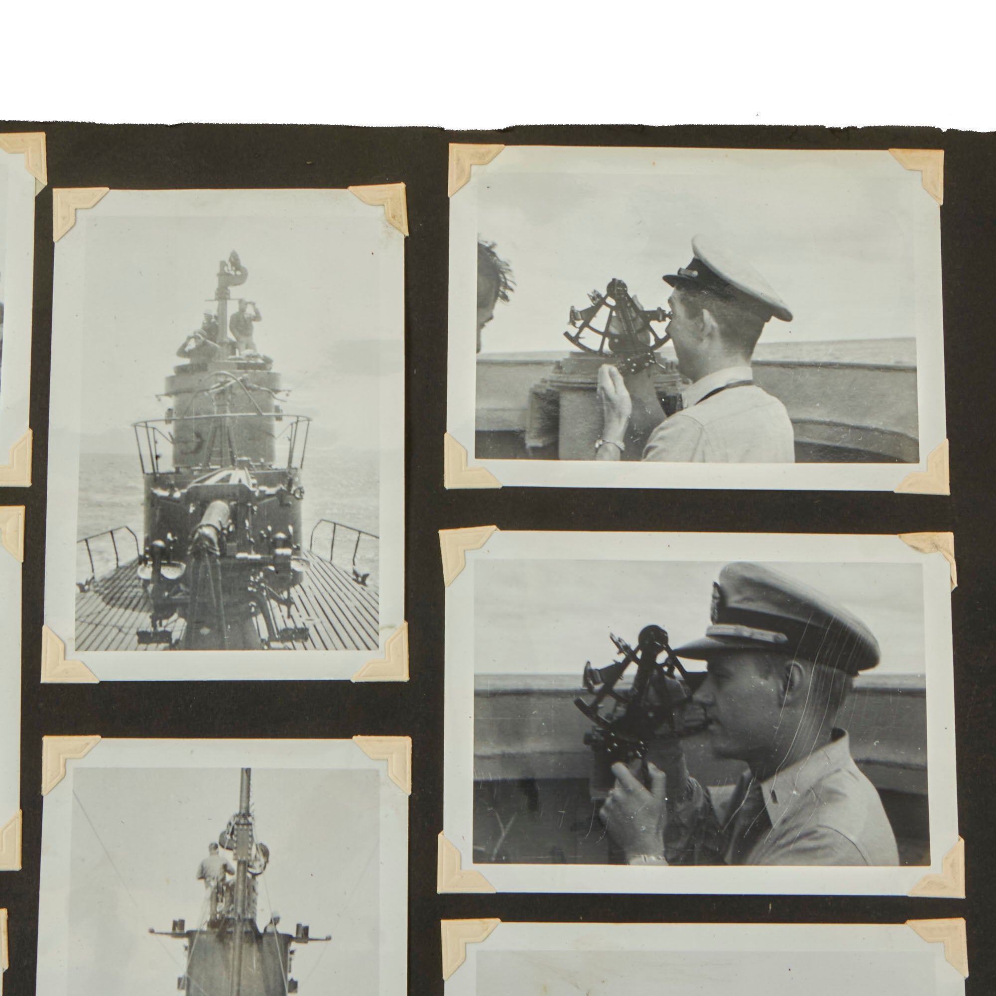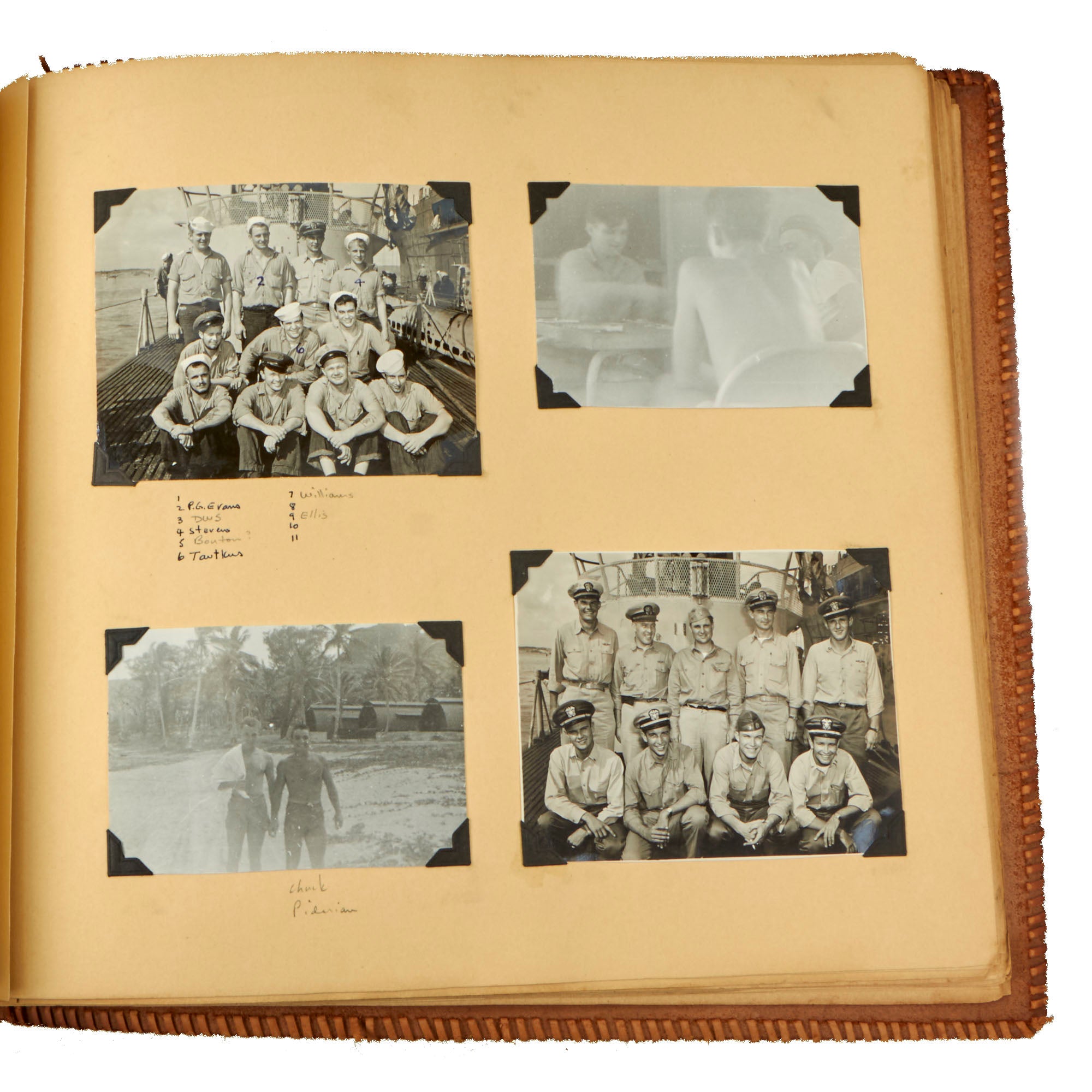 The first album, which is the larger 11½ x 15½” album, contains 225 photographs. These include photos of men aboard the Raton, with “The Last of the Aleuts” painted on the side, an interesting reference. There are many photos of men using a sextant, looking towards the land, many photos of the open sea through the spyglass of the submarine, photos of the tropical places they visited, places they stayed on leave, photos of officers and women in the places they visited. There are photos of the submarine on a dry dock, and some larger photos of officers and crew.