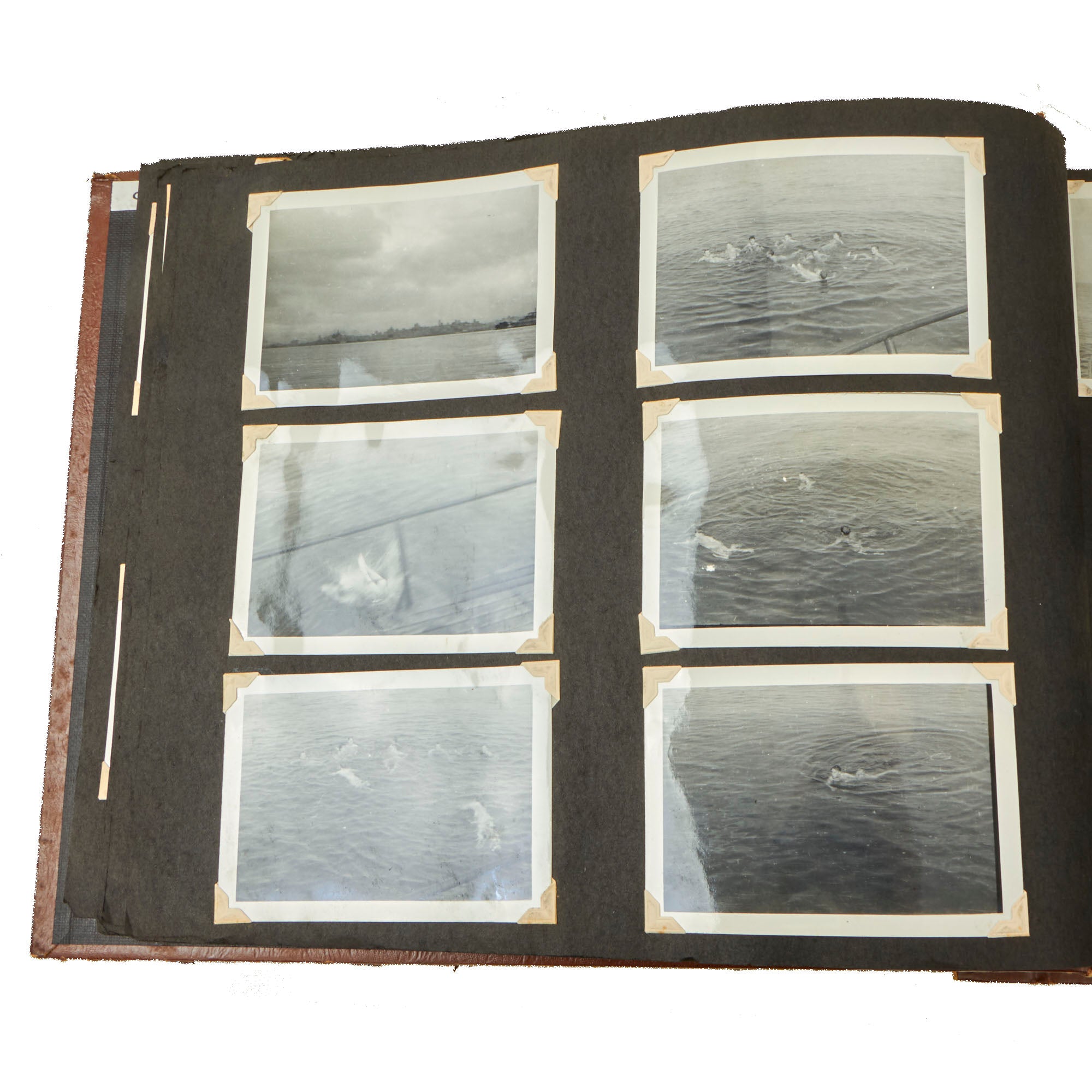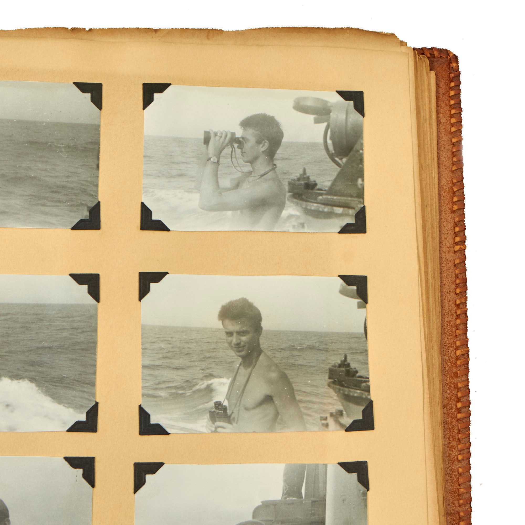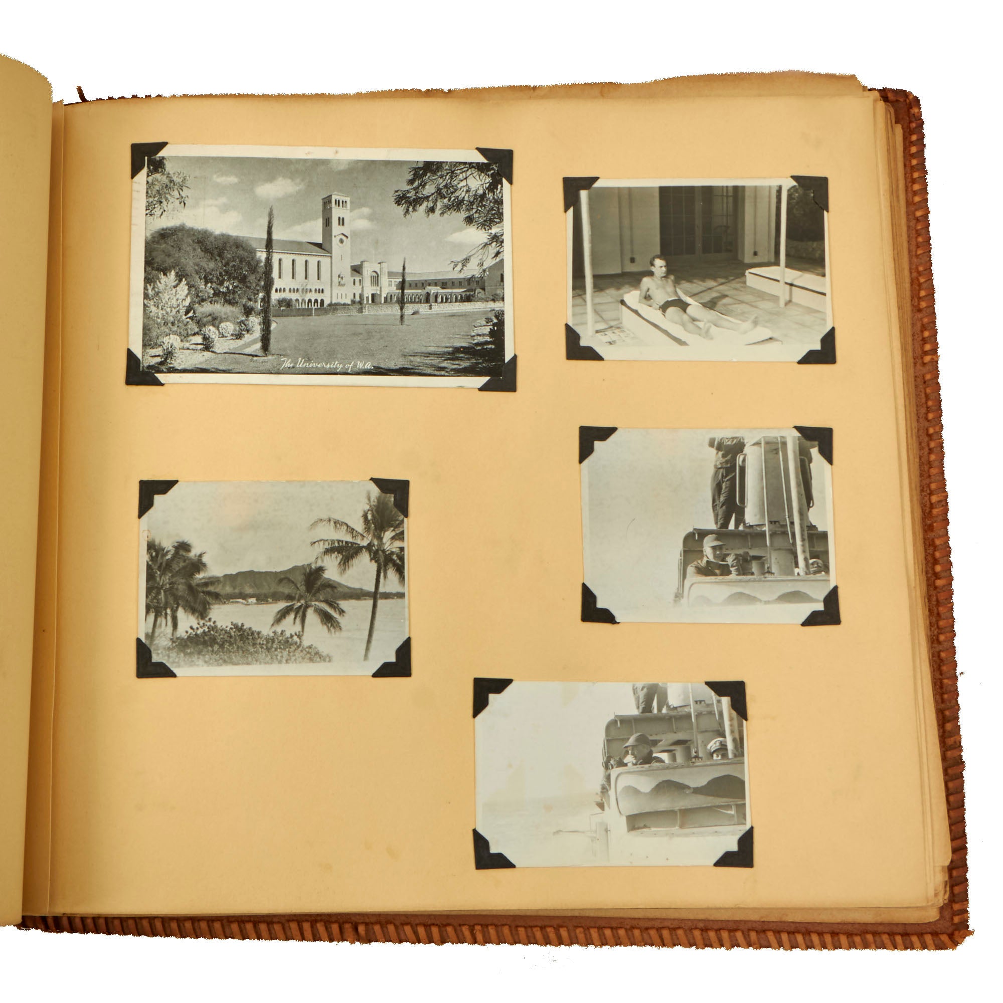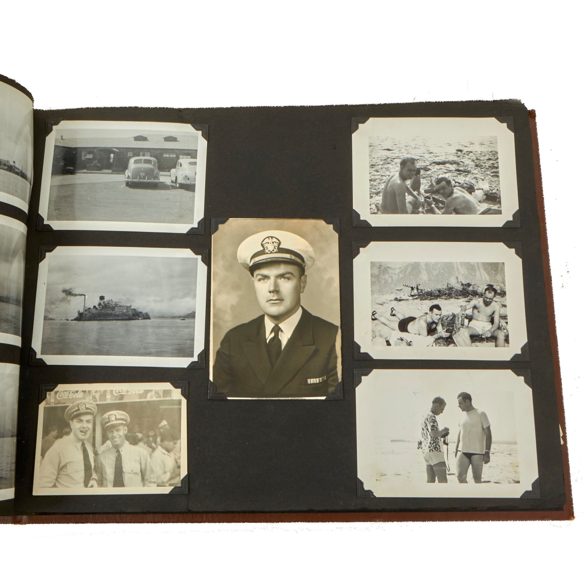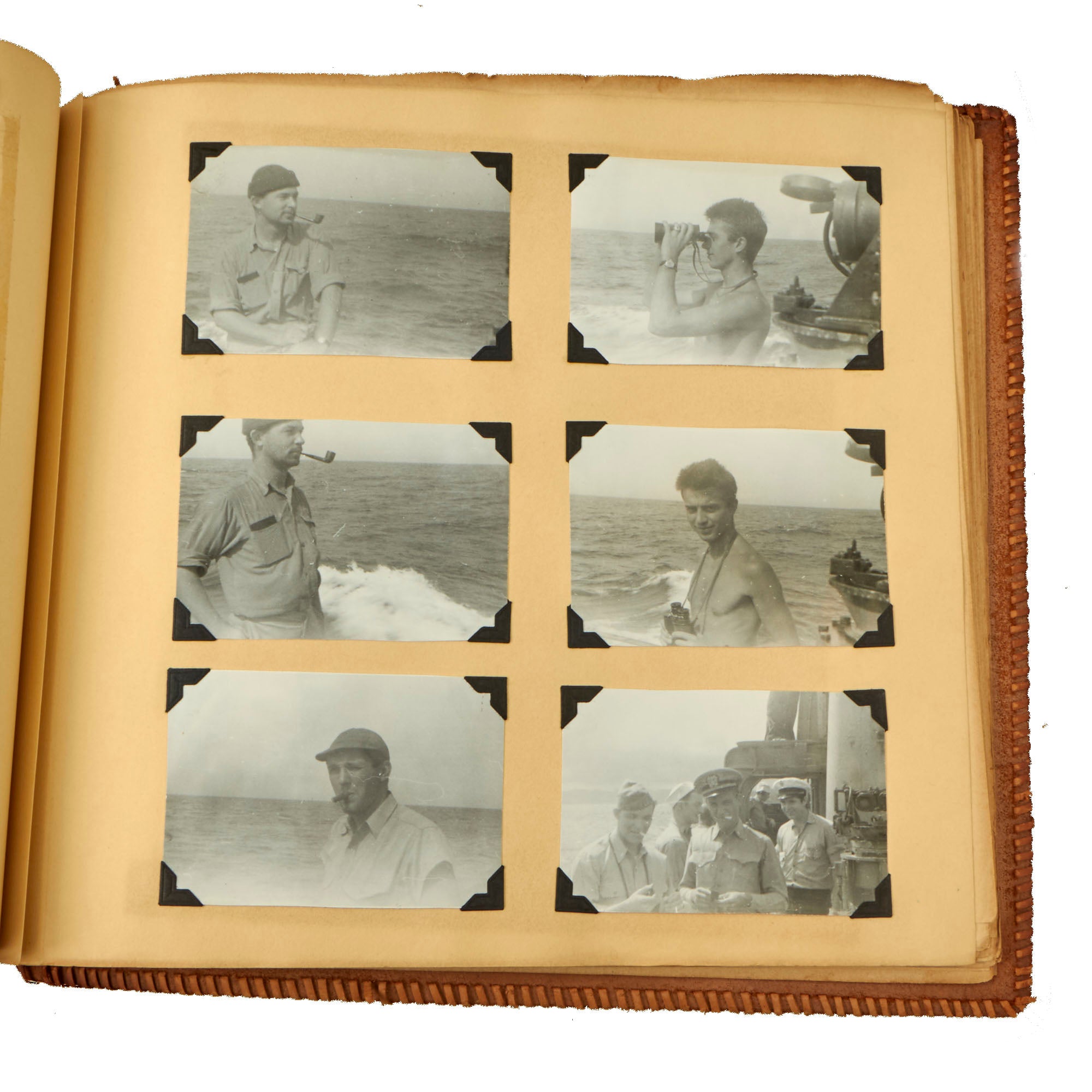 The first album, which is the larger 11½ x 15½” album, contains 225 photographs. These include photos of men aboard the Raton, with “The Last of the Aleuts” painted on the side, an interesting reference. There are many photos of men using a sextant, looking towards the land, many photos of the open sea through the spyglass of the submarine, photos of the tropical places they visited, places they stayed on leave, photos of officers and women in the places they visited. There are photos of the submarine on a dry dock, and some larger photos of officers and crew.