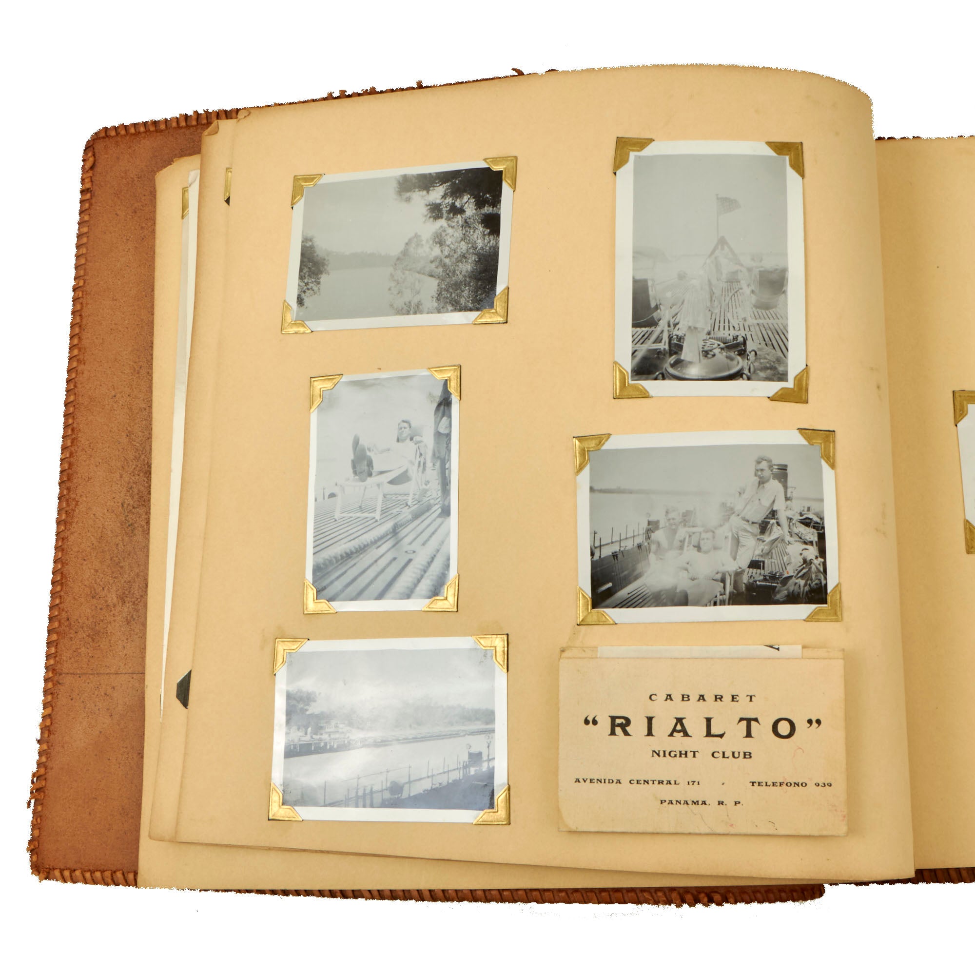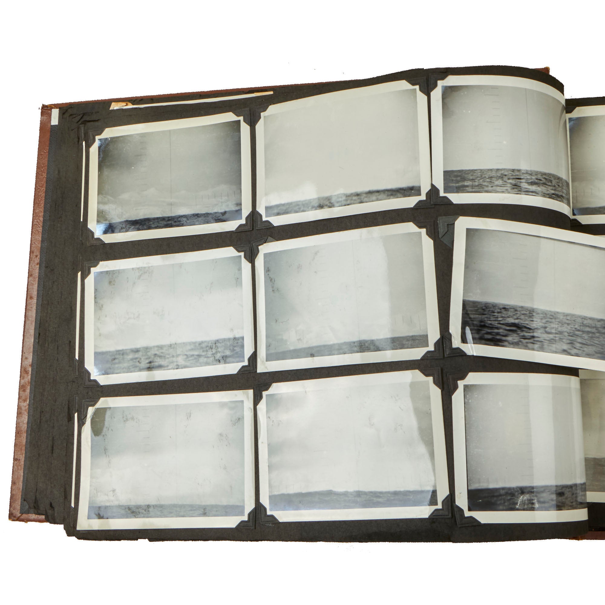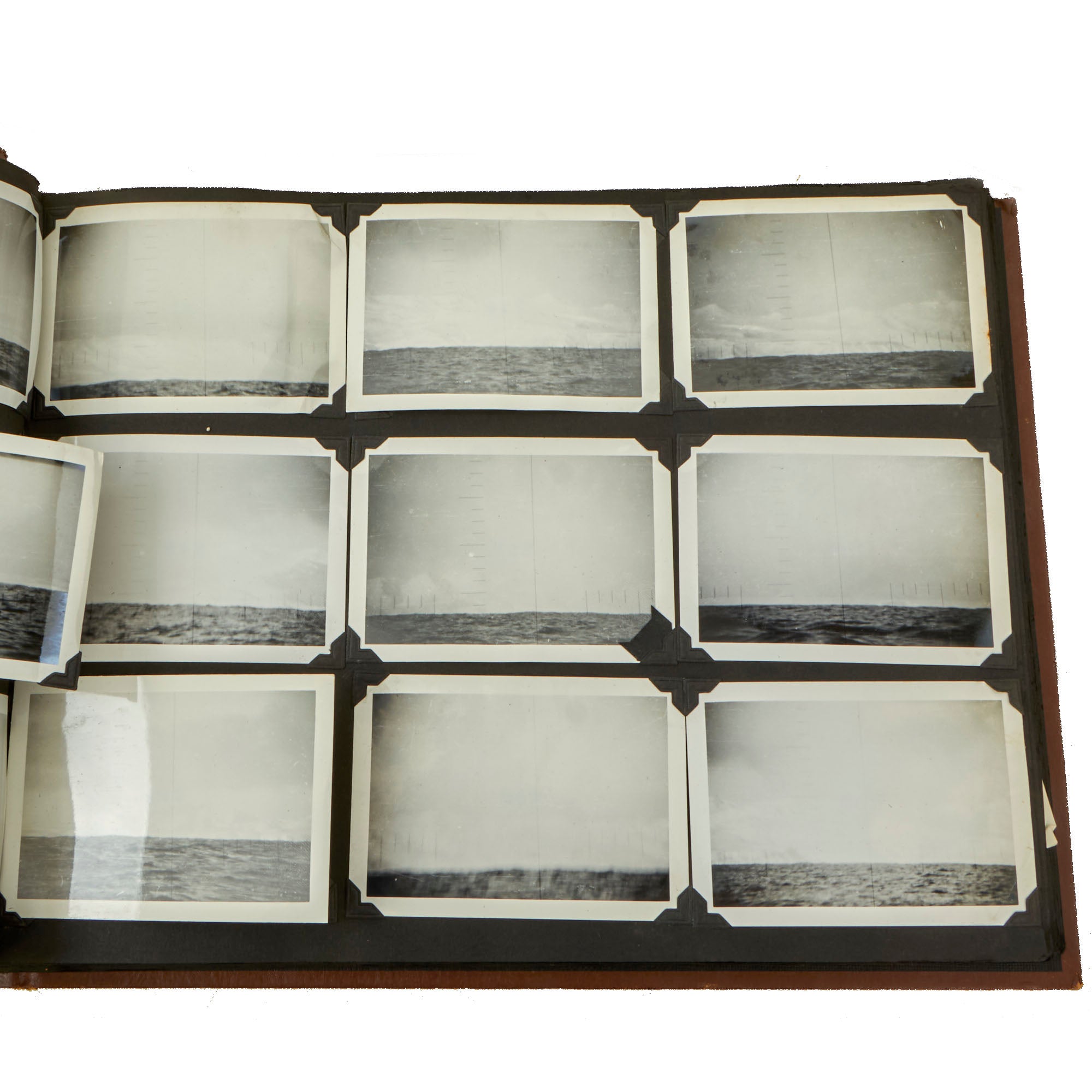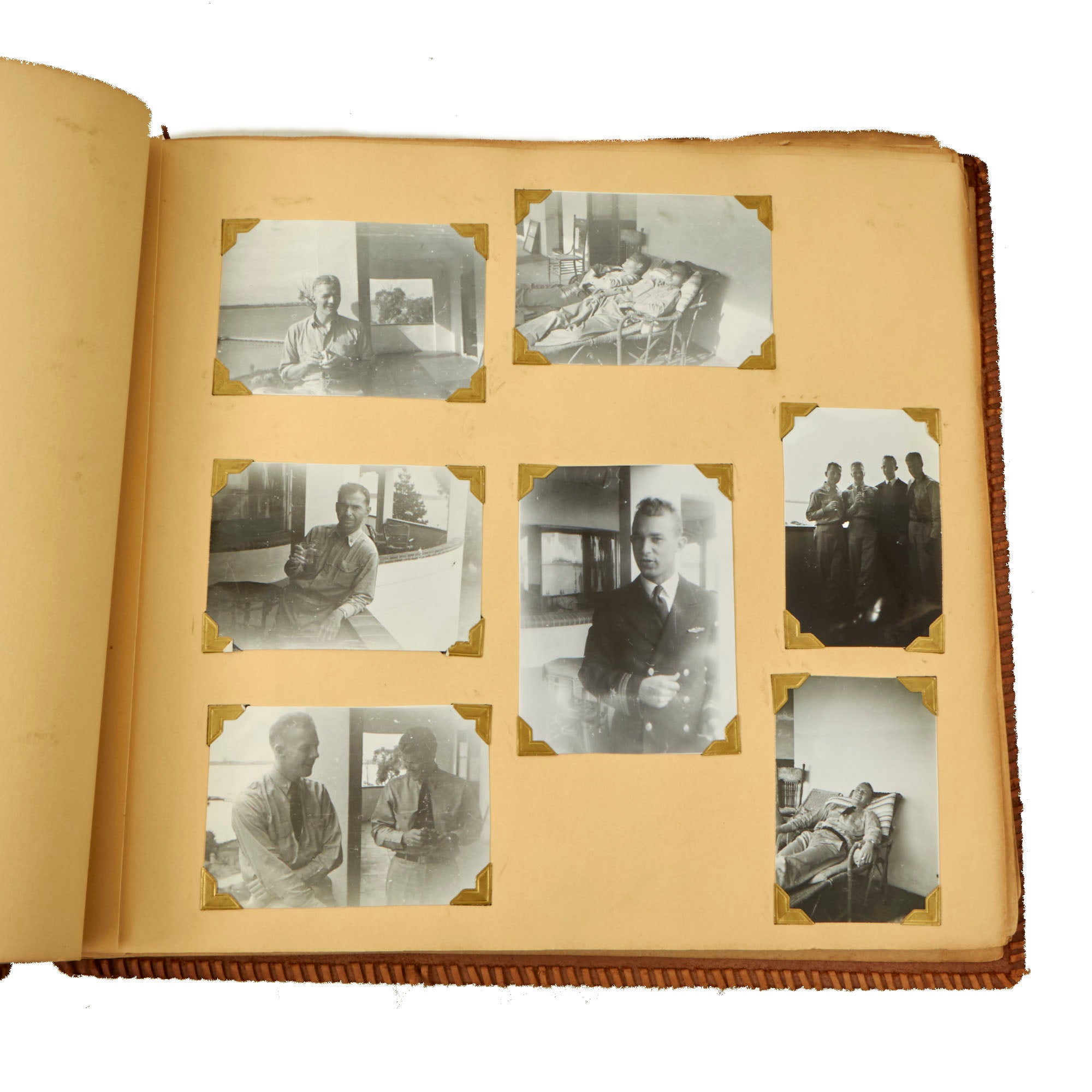 The first album, which is the larger 11½ x 15½” album, contains 225 photographs. These include photos of men aboard the Raton, with “The Last of the Aleuts” painted on the side, an interesting reference. There are many photos of men using a sextant, looking towards the land, many photos of the open sea through the spyglass of the submarine, photos of the tropical places they visited, places they stayed on leave, photos of officers and women in the places they visited. There are photos of the submarine on a dry dock, and some larger photos of officers and crew.