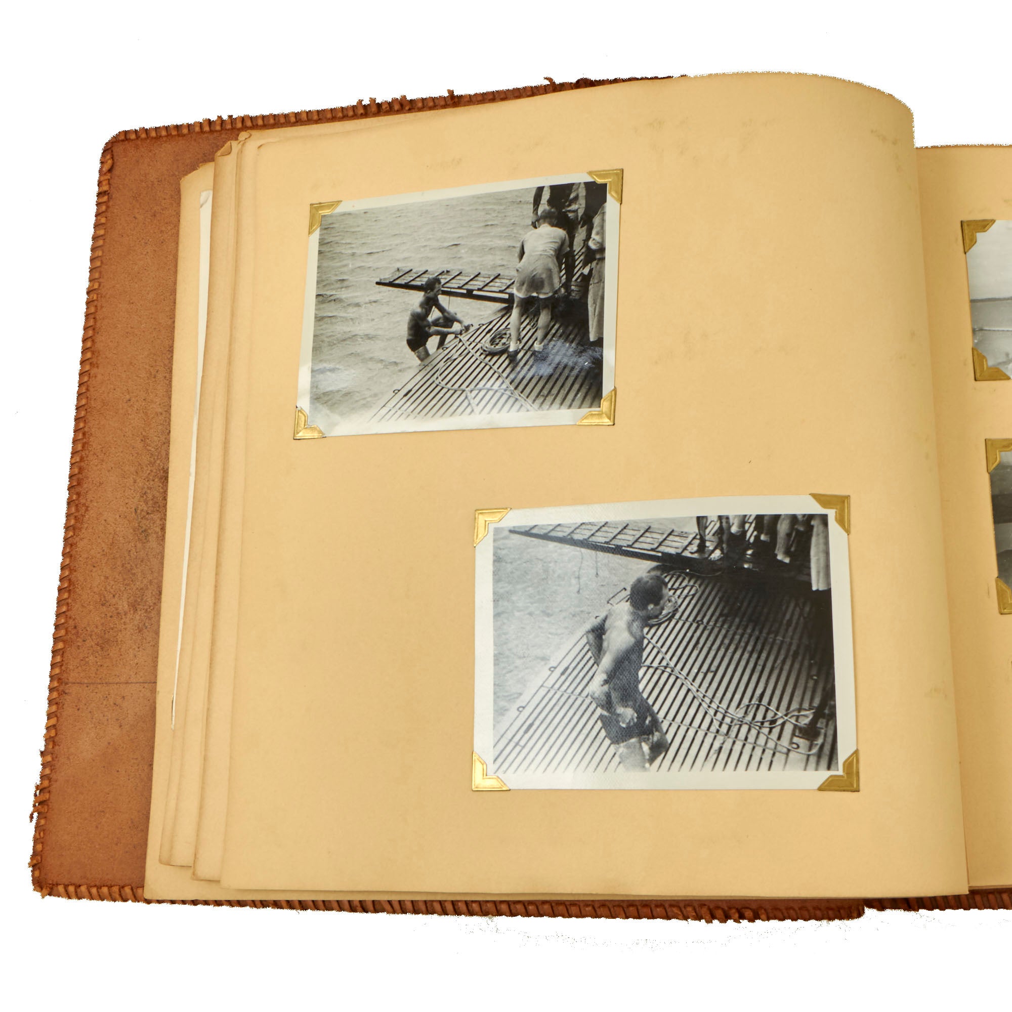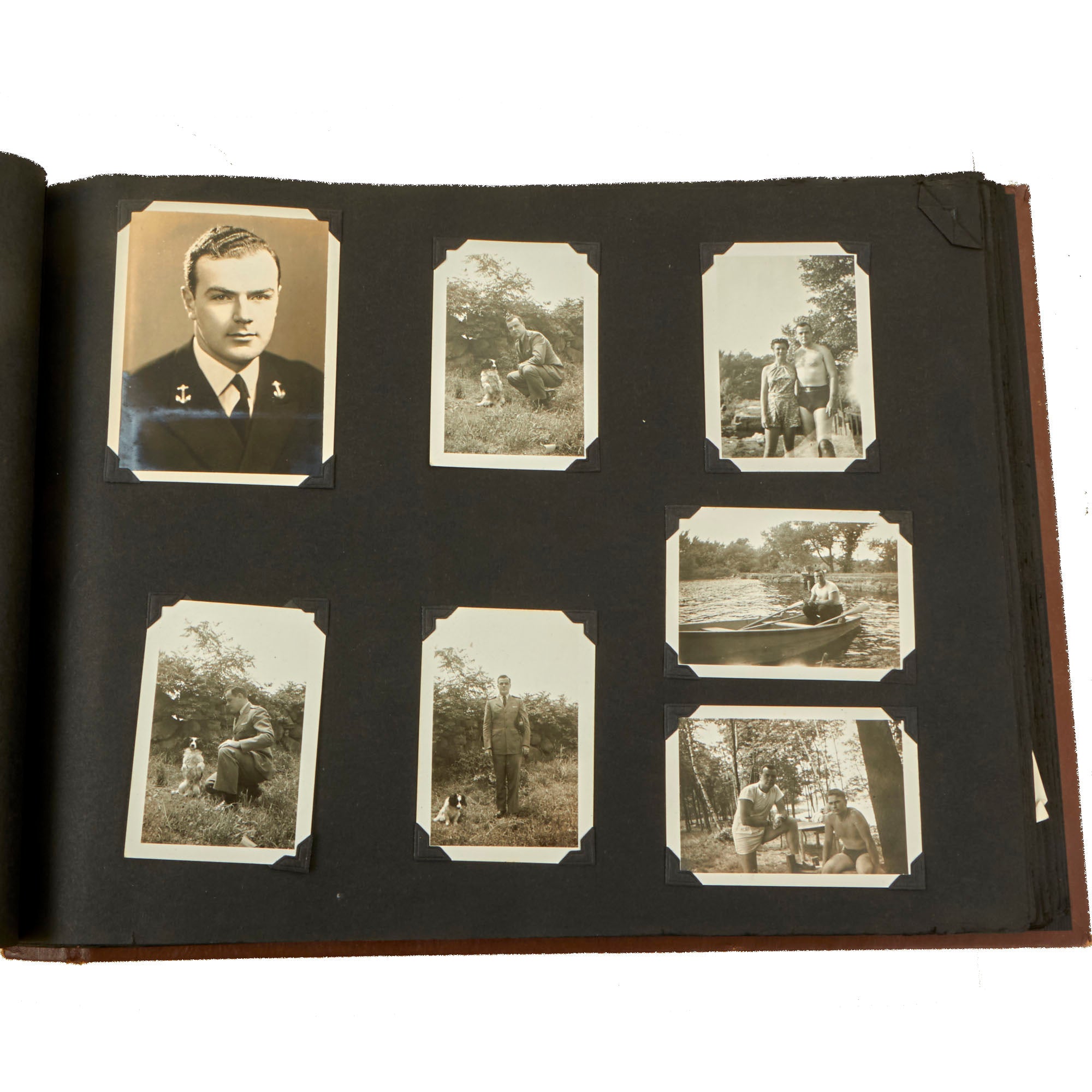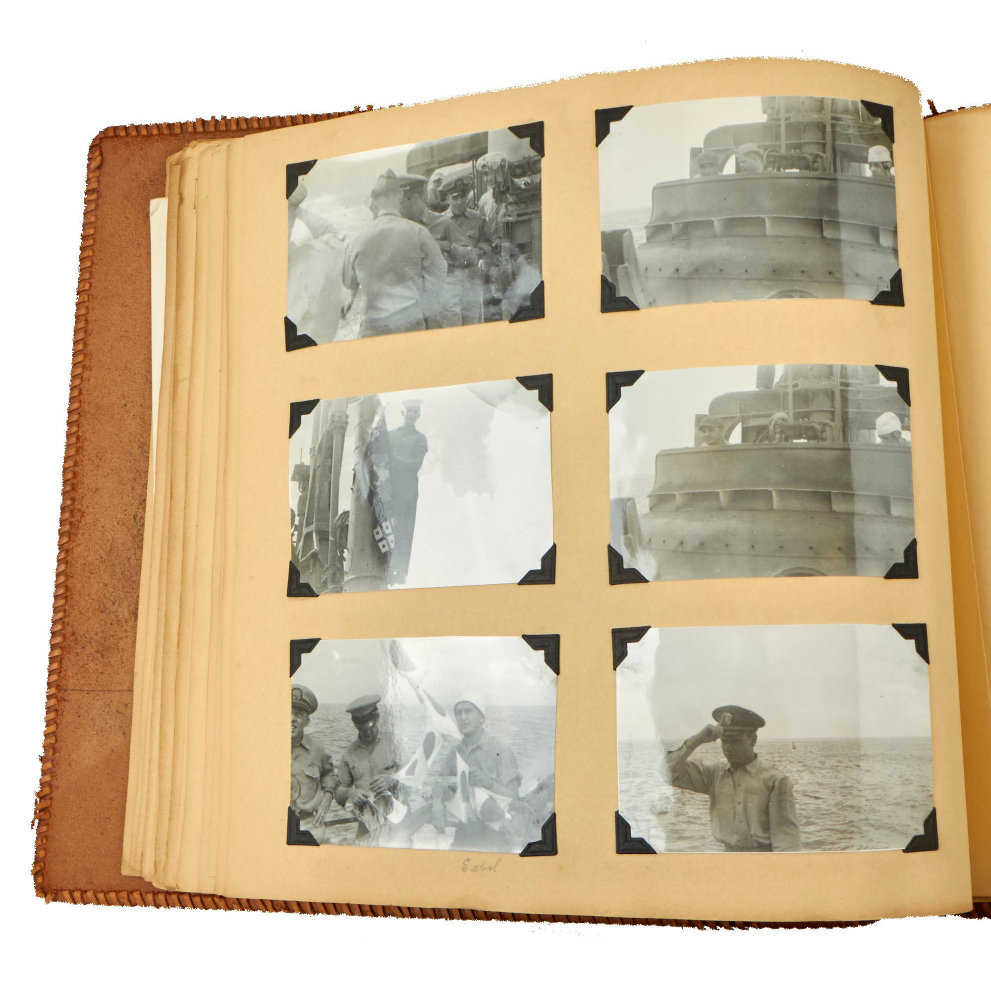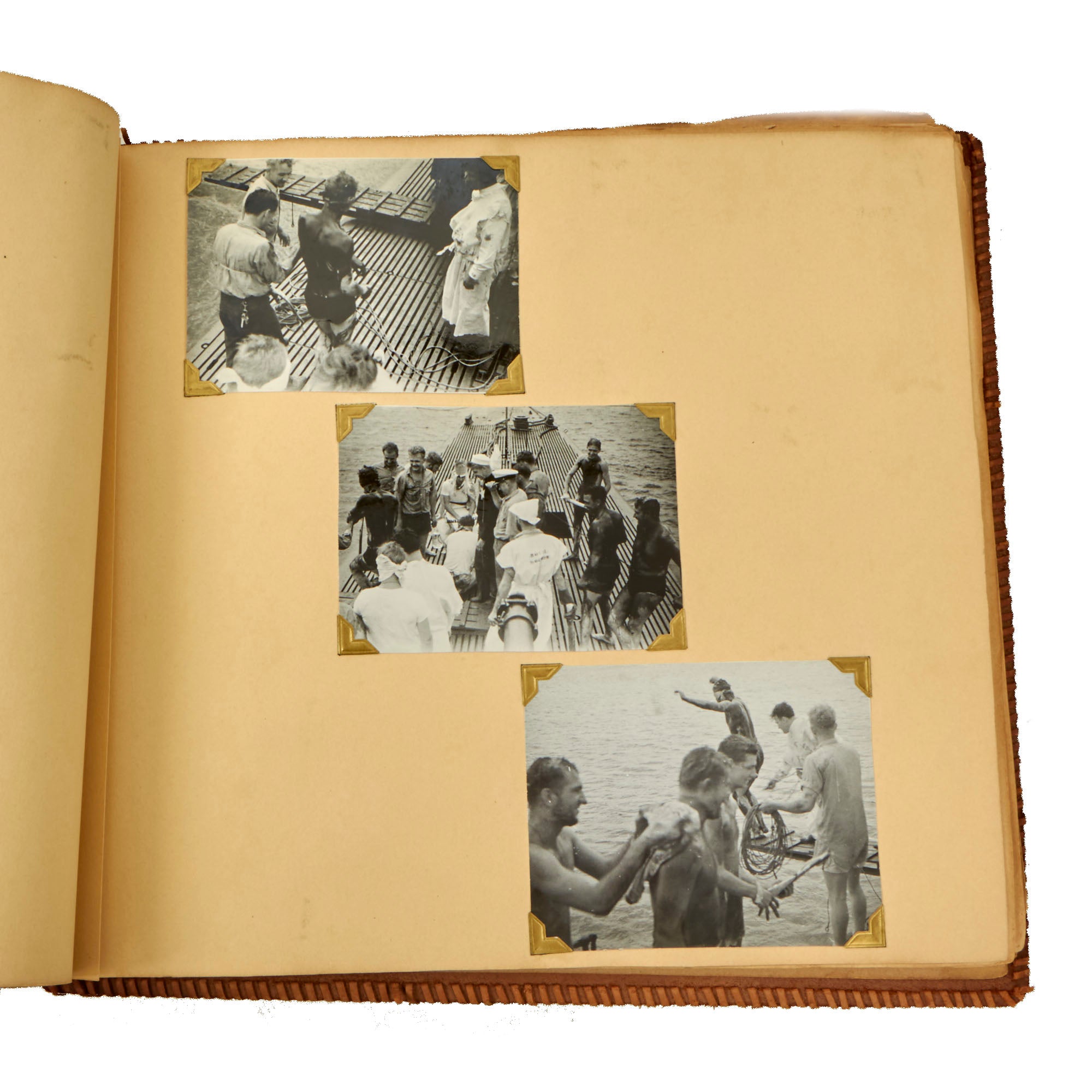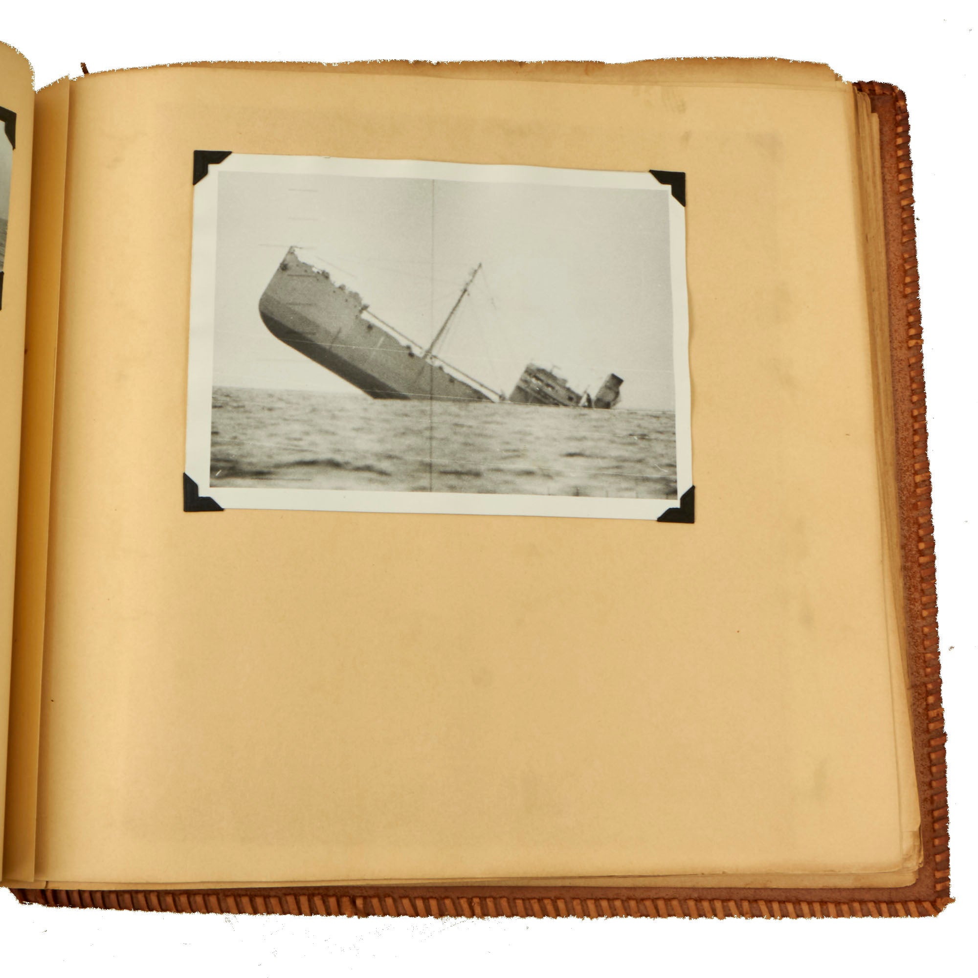 The second album, the smaller 12 x 13½” album, is a fantastic hand-made leather-bound album with the Walt Disney designed insignia of the USS Raton carved into the front cover. The back cover has the US Naval Academy insignia carved into it, a fantastic bit of detailing. This album contains a great deal of ephemera on top of 121 photographs. This album contains photographs of the USS Raton’s battle flag, showing the ships she sunk, along with an outstanding photograph of a Japanese merchant ship with its bow pointed diagonally, as it is in the process of sinking. The back of this photo notes that it is an Official USN Photograph, and the very next page has a fold-out newspaper article with this exact photograph! The first photo of this album is a page-size group photo of the crew and builders of the USS Raton, with 14 men numbered and named. There are photos of men and sailors aboard the submarine, men on leave or just relaxing on the top deck, and a great shot of the painted insignia of the USS Raton, with the Walt Disney signature visible at the bottom! Some of the photos in this album have some names written below with numbers corresponding to them, but there are not many like this.