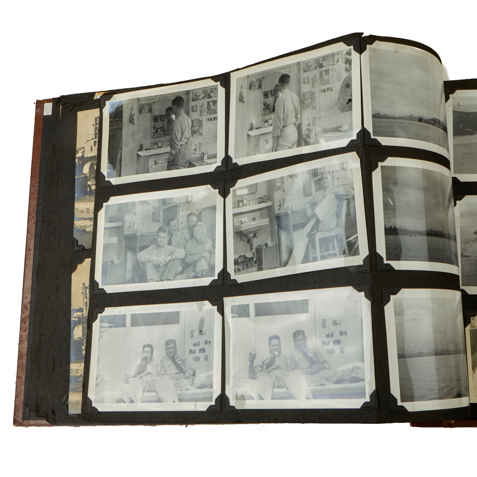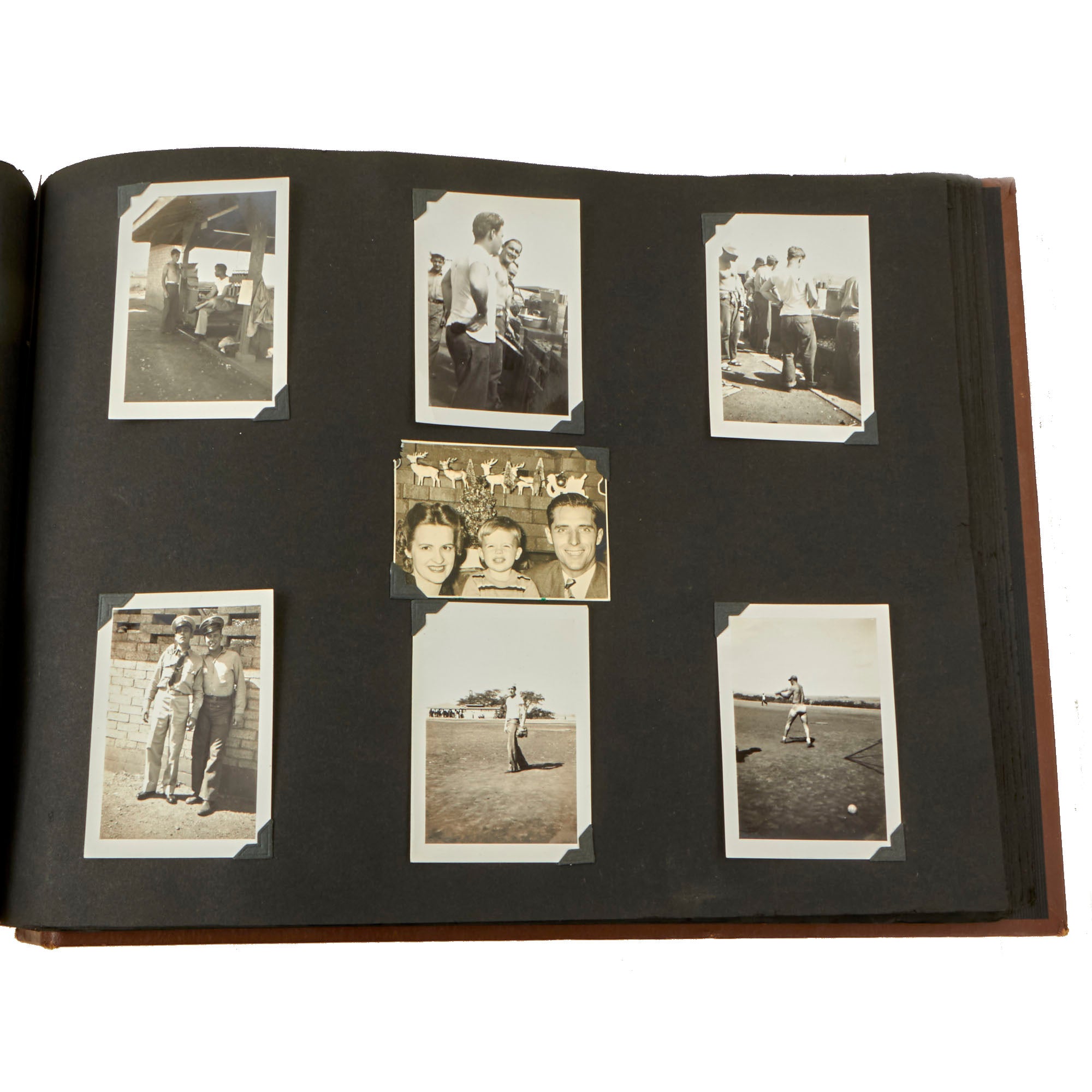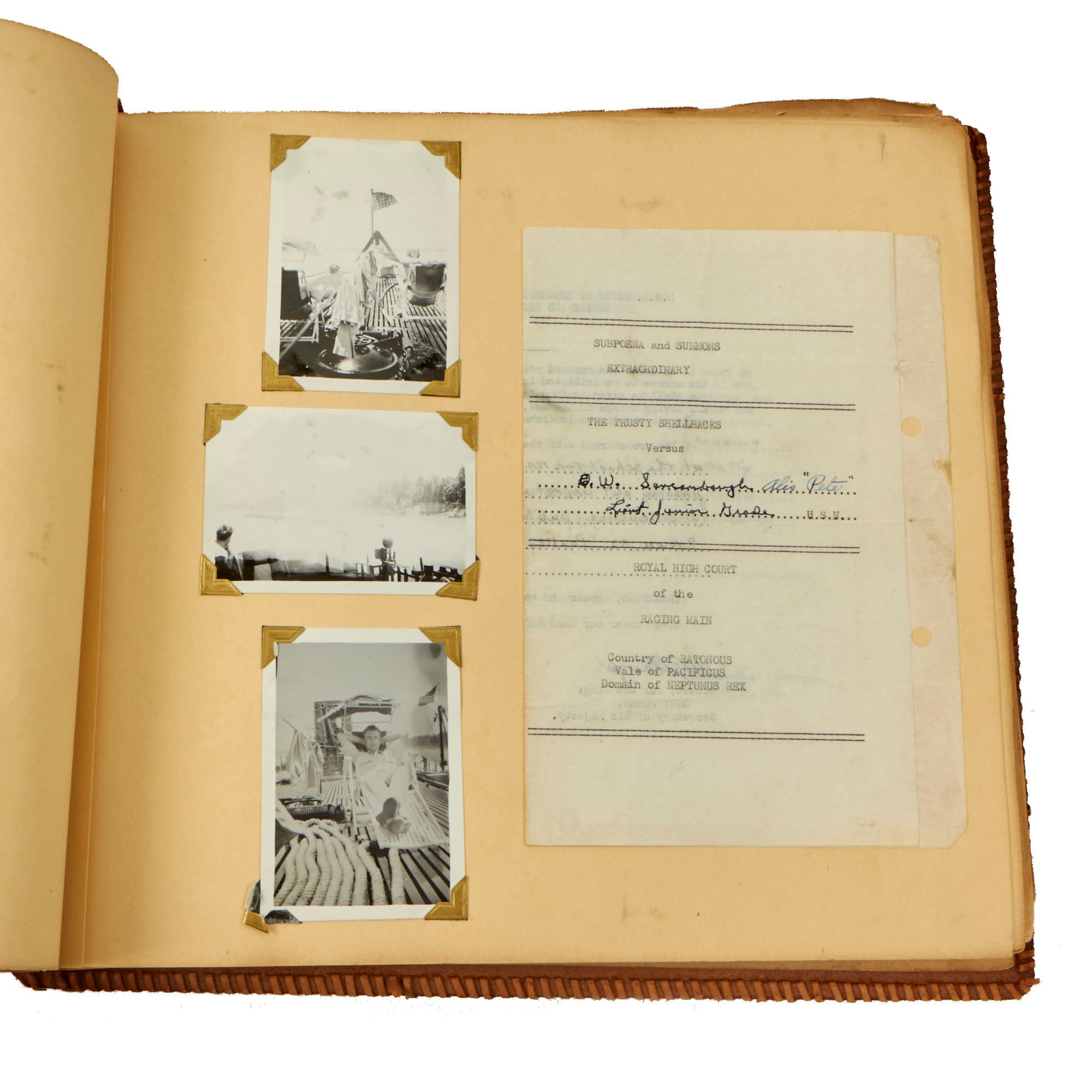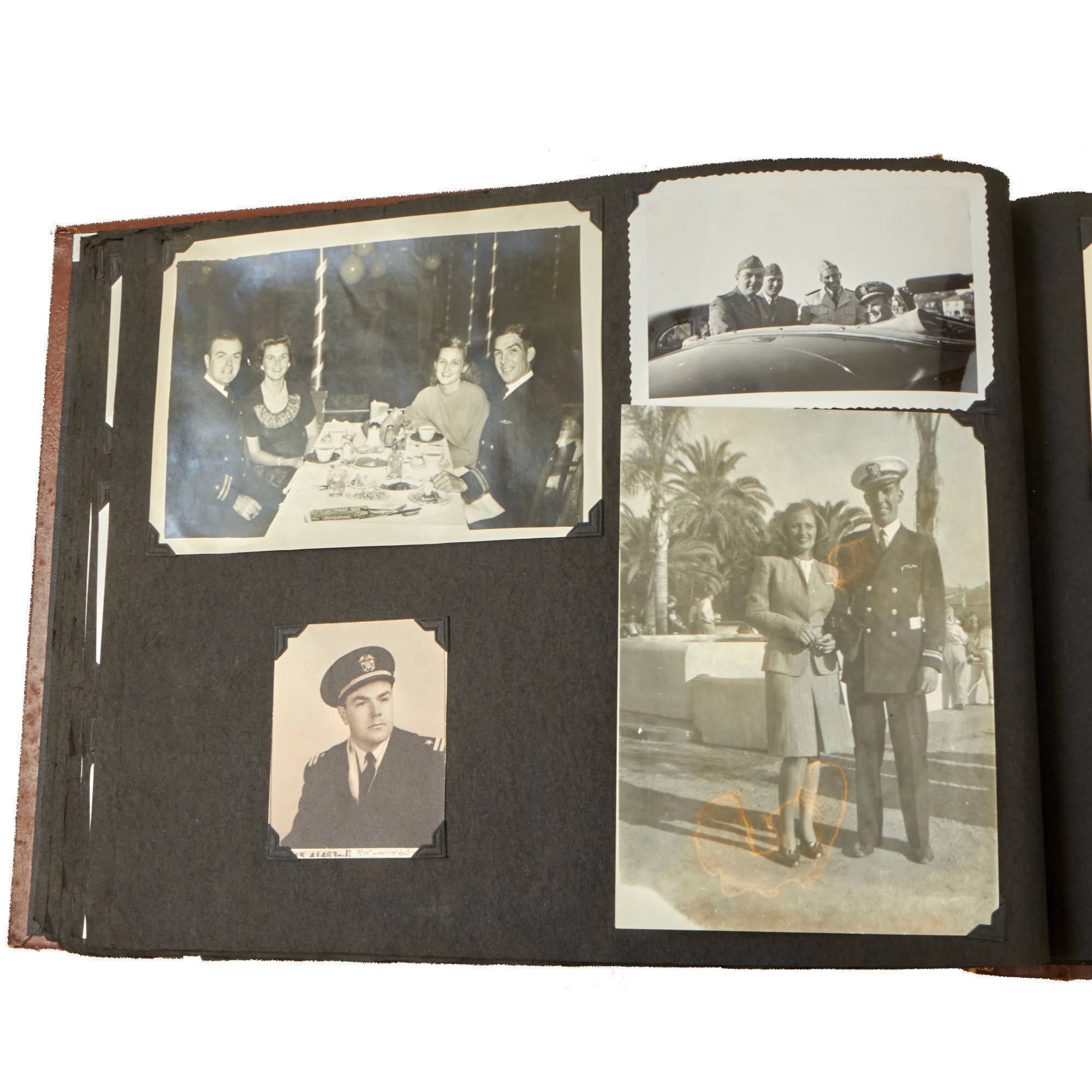 The second album, the smaller 12 x 13½” album, is a fantastic hand-made leather-bound album with the Walt Disney designed insignia of the USS Raton carved into the front cover. The back cover has the US Naval Academy insignia carved into it, a fantastic bit of detailing. This album contains a great deal of ephemera on top of 121 photographs. This album contains photographs of the USS Raton’s battle flag, showing the ships she sunk, along with an outstanding photograph of a Japanese merchant ship with its bow pointed diagonally, as it is in the process of sinking. The back of this photo notes that it is an Official USN Photograph, and the very next page has a fold-out newspaper article with this exact photograph! The first photo of this album is a page-size group photo of the crew and builders of the USS Raton, with 14 men numbered and named. There are photos of men and sailors aboard the submarine, men on leave or just relaxing on the top deck, and a great shot of the painted insignia of the USS Raton, with the Walt Disney signature visible at the bottom! Some of the photos in this album have some names written below with numbers corresponding to them, but there are not many like this.