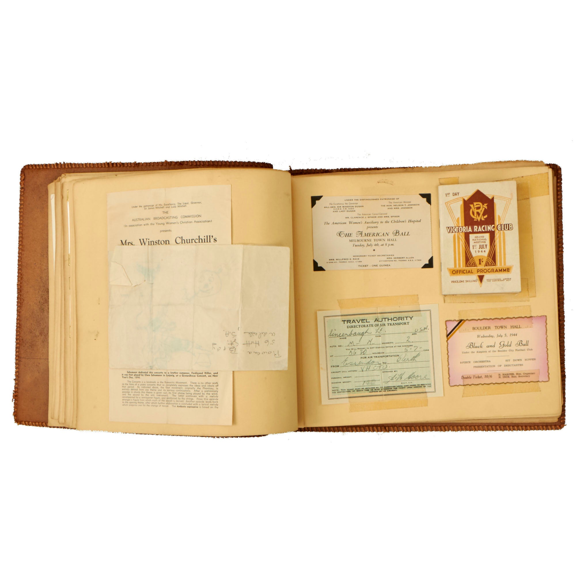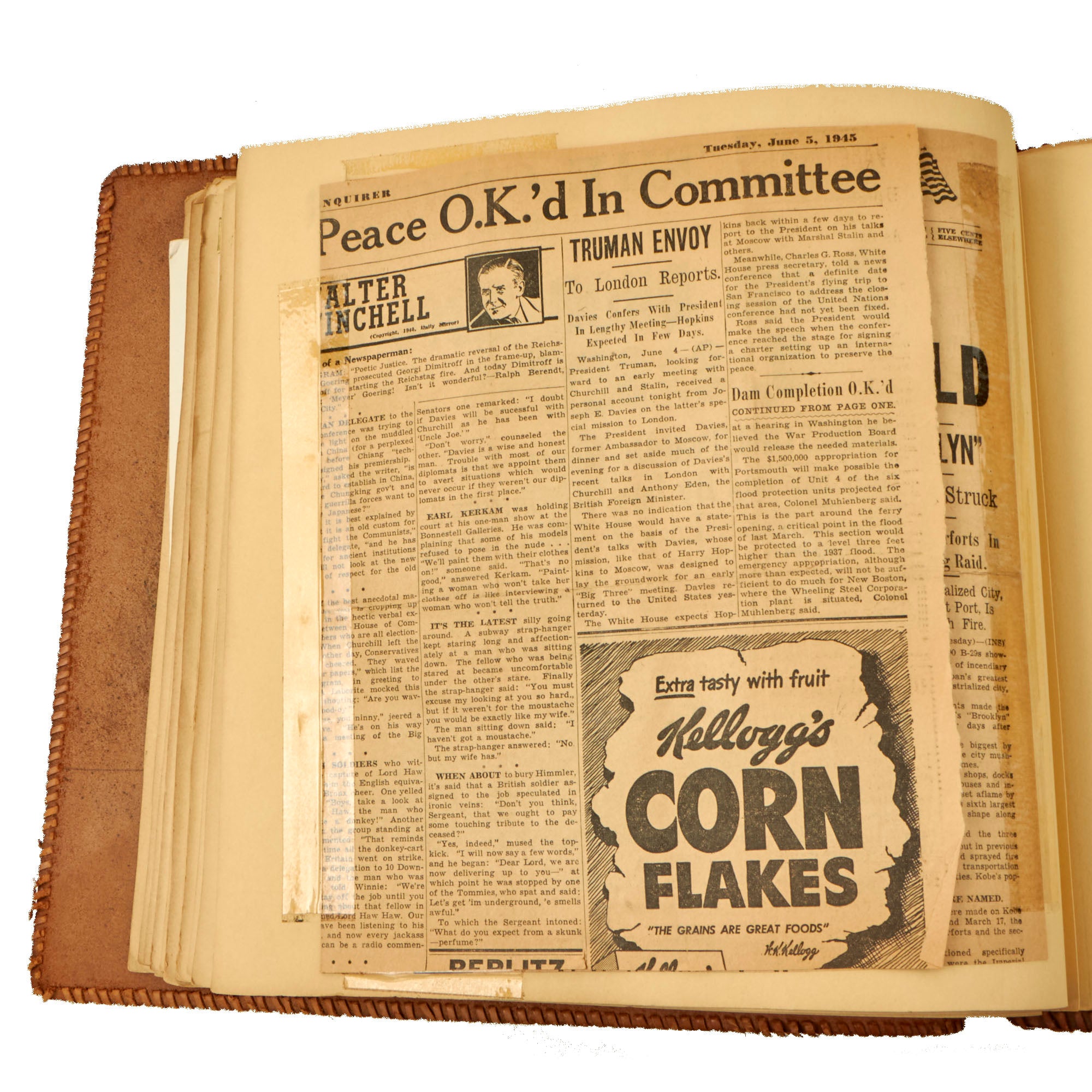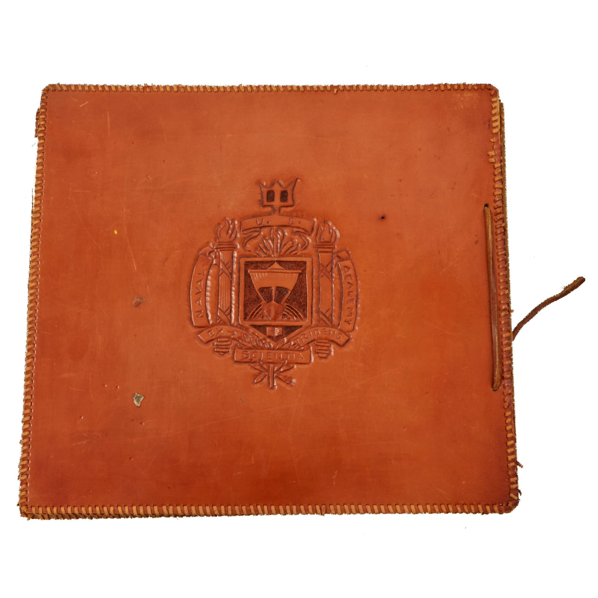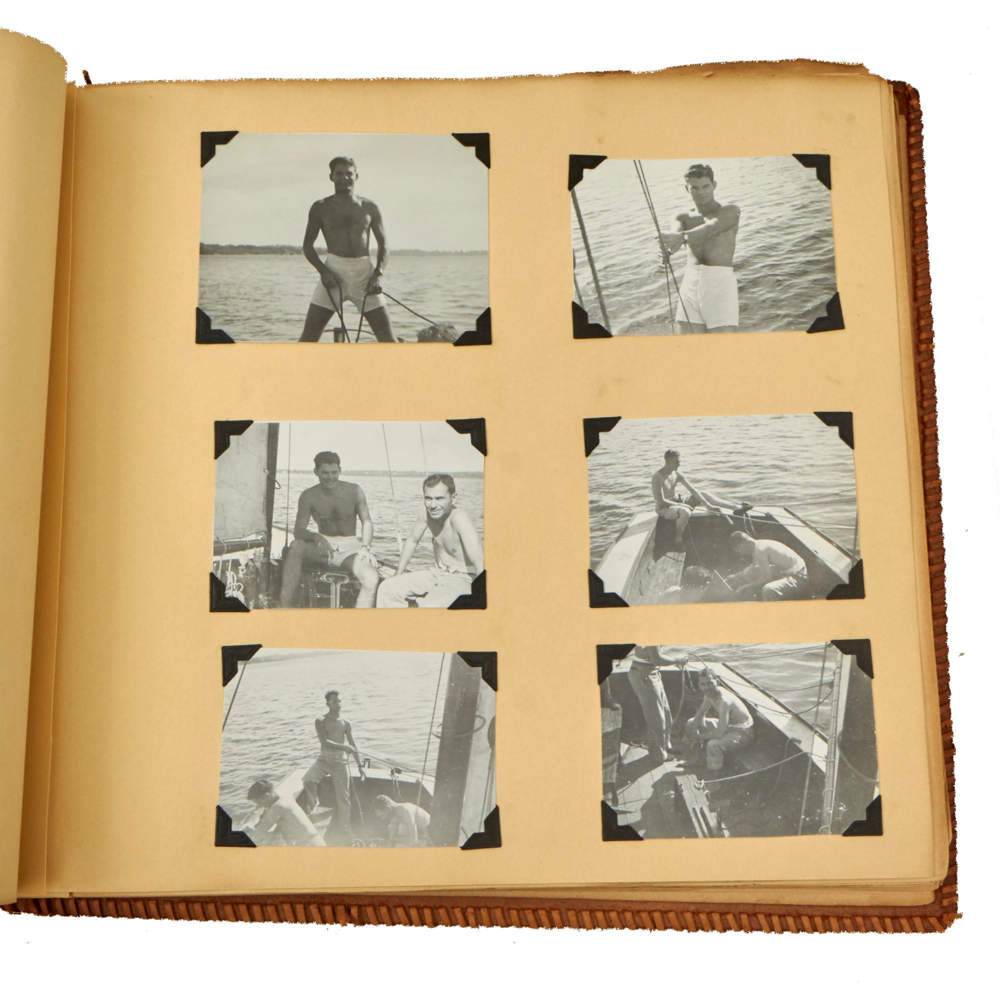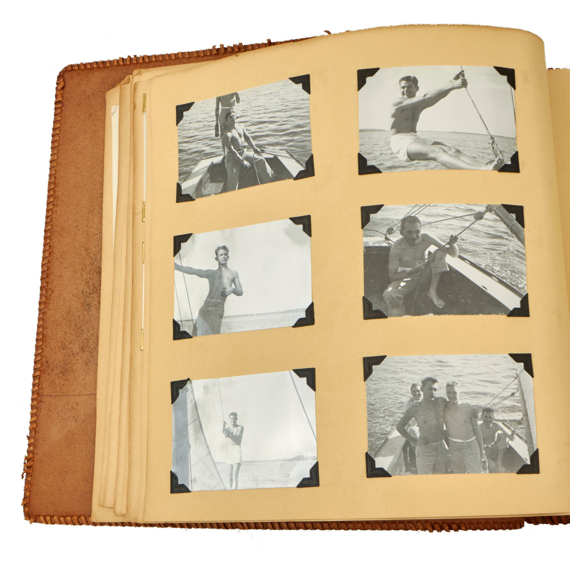 The second album, the smaller 12 x 13½” album, is a fantastic hand-made leather-bound album with the Walt Disney designed insignia of the USS Raton carved into the front cover. The back cover has the US Naval Academy insignia carved into it, a fantastic bit of detailing. This album contains a great deal of ephemera on top of 121 photographs. This album contains photographs of the USS Raton’s battle flag, showing the ships she sunk, along with an outstanding photograph of a Japanese merchant ship with its bow pointed diagonally, as it is in the process of sinking. The back of this photo notes that it is an Official USN Photograph, and the very next page has a fold-out newspaper article with this exact photograph! The first photo of this album is a page-size group photo of the crew and builders of the USS Raton, with 14 men numbered and named. There are photos of men and sailors aboard the submarine, men on leave or just relaxing on the top deck, and a great shot of the painted insignia of the USS Raton, with the Walt Disney signature visible at the bottom! Some of the photos in this album have some names written below with numbers corresponding to them, but there are not many like this.