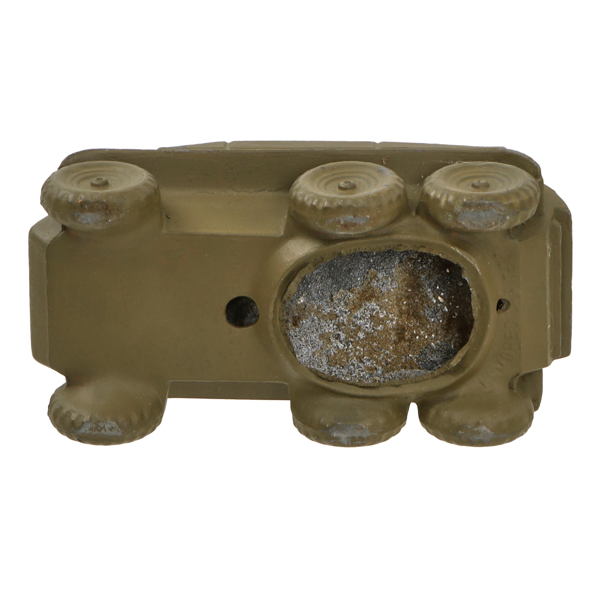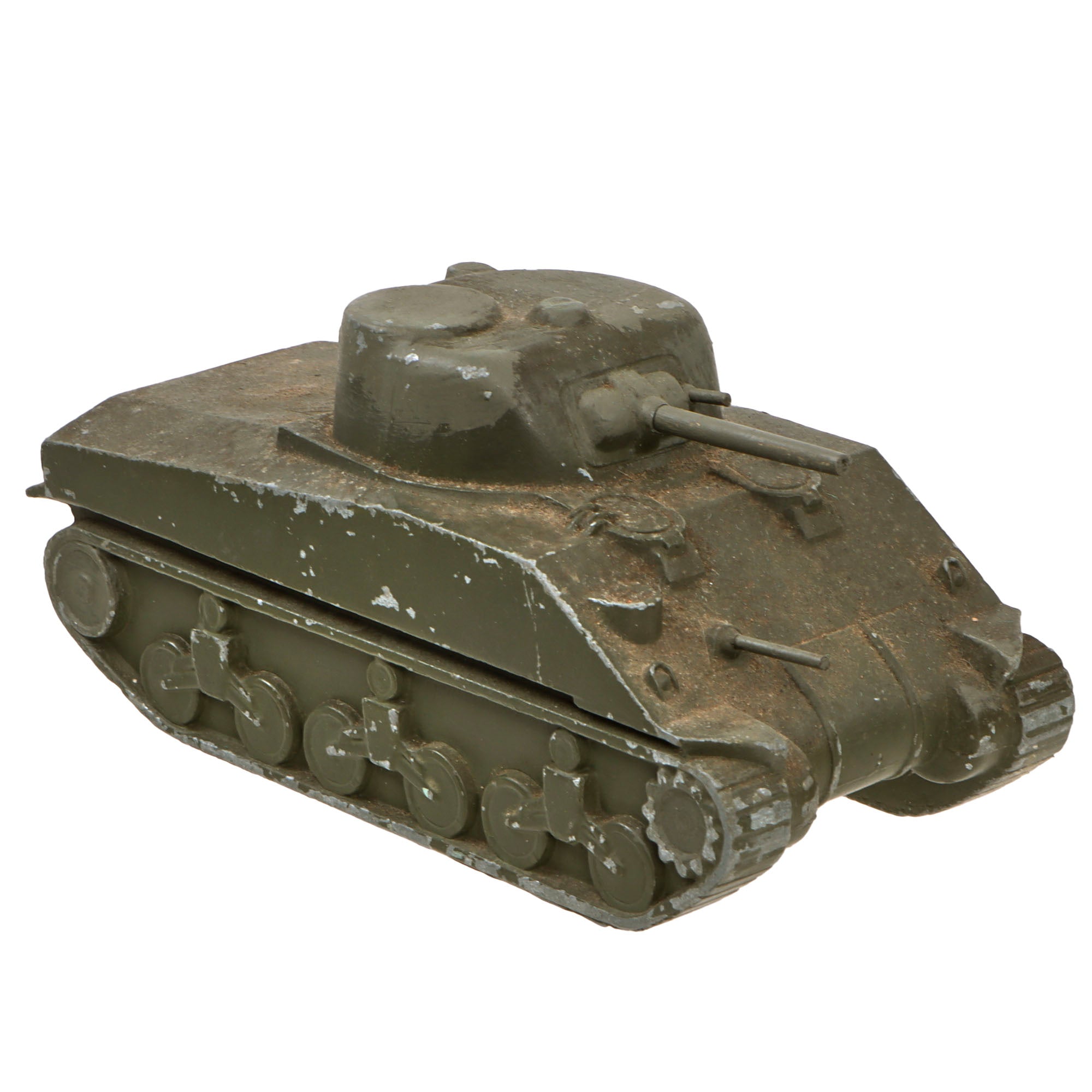 The models include the T17 Deerhound Armored Car, M4 Sherman Tank, and a German tank that is unidentified because there is extreme damage to the underside. There is also heavy glue residue underneath from pieces being glued back on. The entire model has been repainted in a feldgrau type color, and decals added to the sides. Due to the damage there are no markings on this example.. There are good markings on the other two. Comes ready for further research and display!