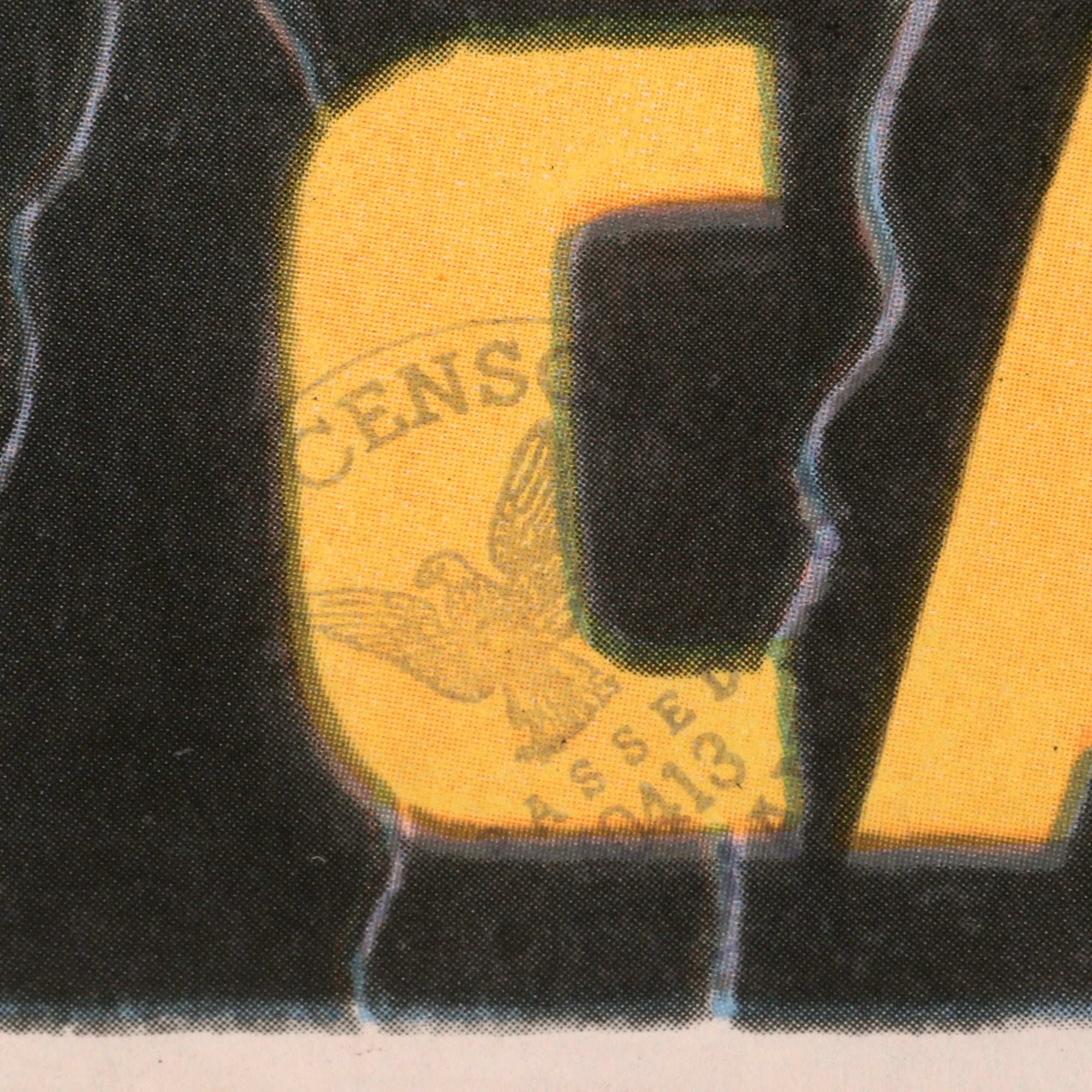 The poster appears to have never been folded and has definitely been well taken care of! The markings on the poster are “Schiffers” and can be found in the bottom right corner. In the bottom corner the following markings can be seen: AGPS 5. 46. 70000. 3896. What’s even rarer is the U.S. CIVIL CENSORSHIP GERMANY stamp, which is numbered but too faded to read.