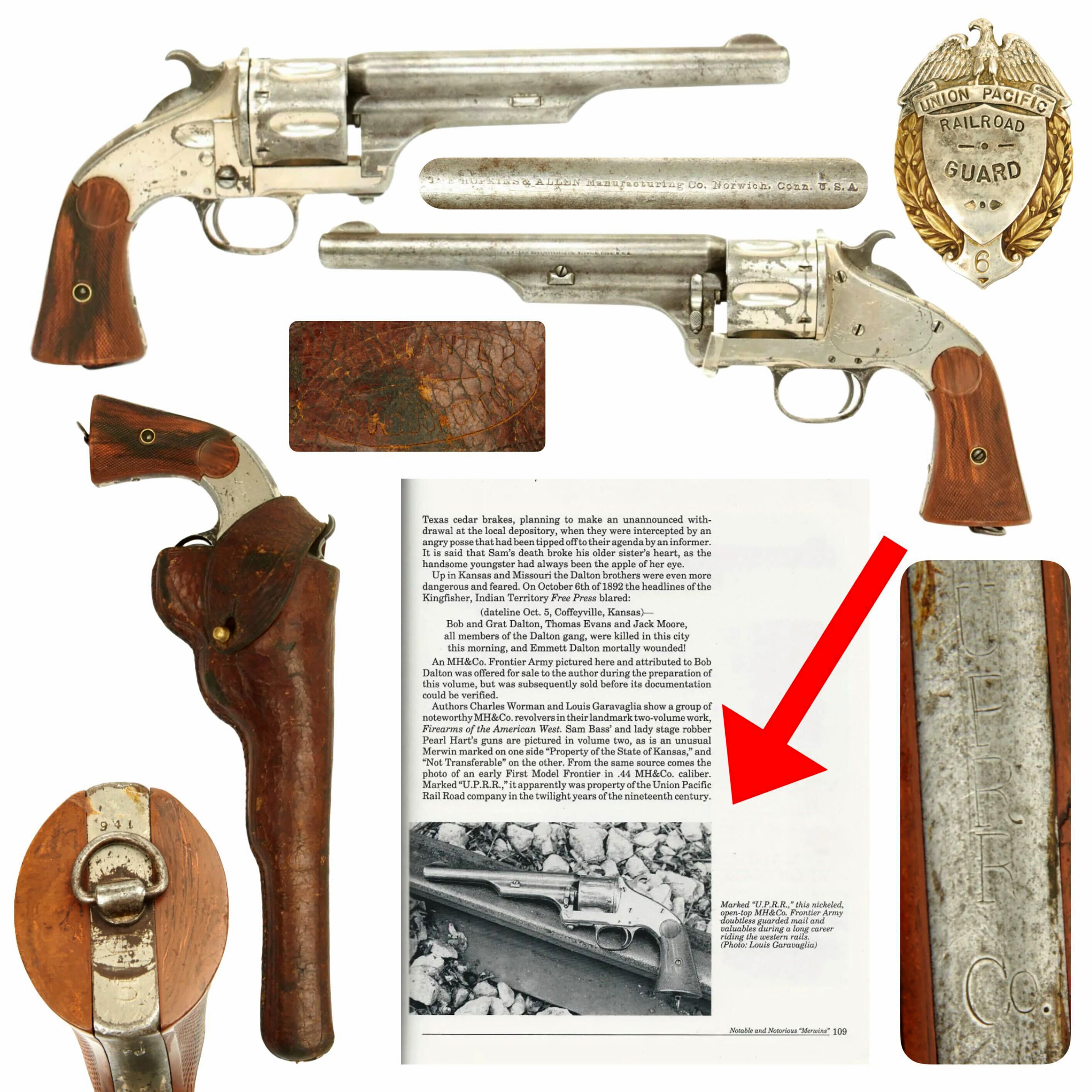 Original Item: One of a kind set. This is an Exceptionally RARE offering, and it includes what is said to be the ONLY Mervin & Hulbert Revolver marked up to the Union Pacific Rail Road, along with an original named holster, a U.P.R.R. badge, and a book on Mervin & Hulbert that has a picture of this very revolver. The known marked U.P.R.R. handguns are most often Colt Revolvers or maybe Smith & Wesson but Mervin & Hulbert are very rare with this, we believe, the only example known.