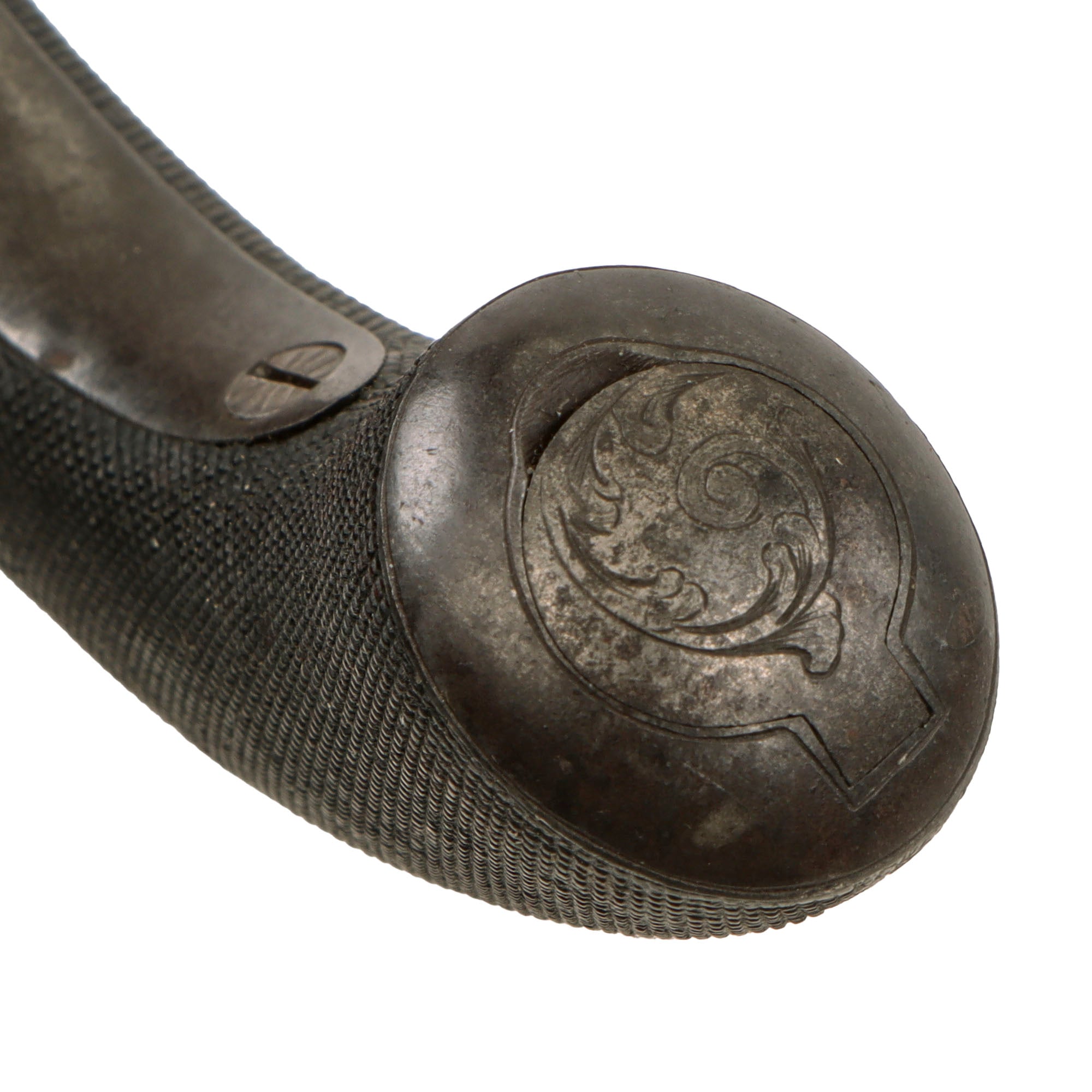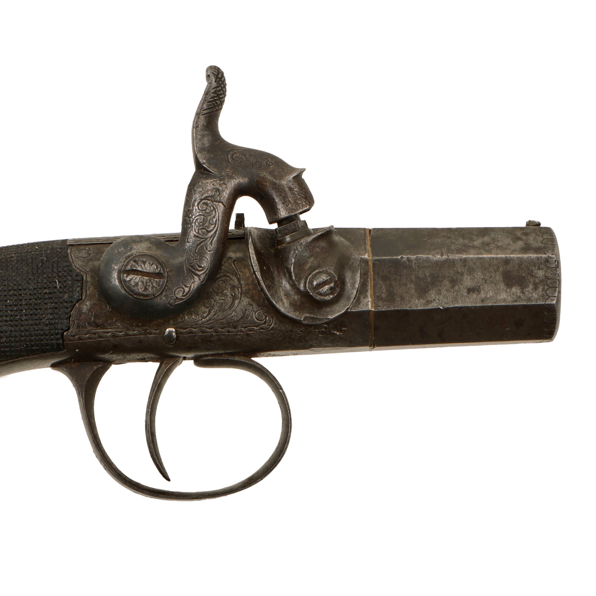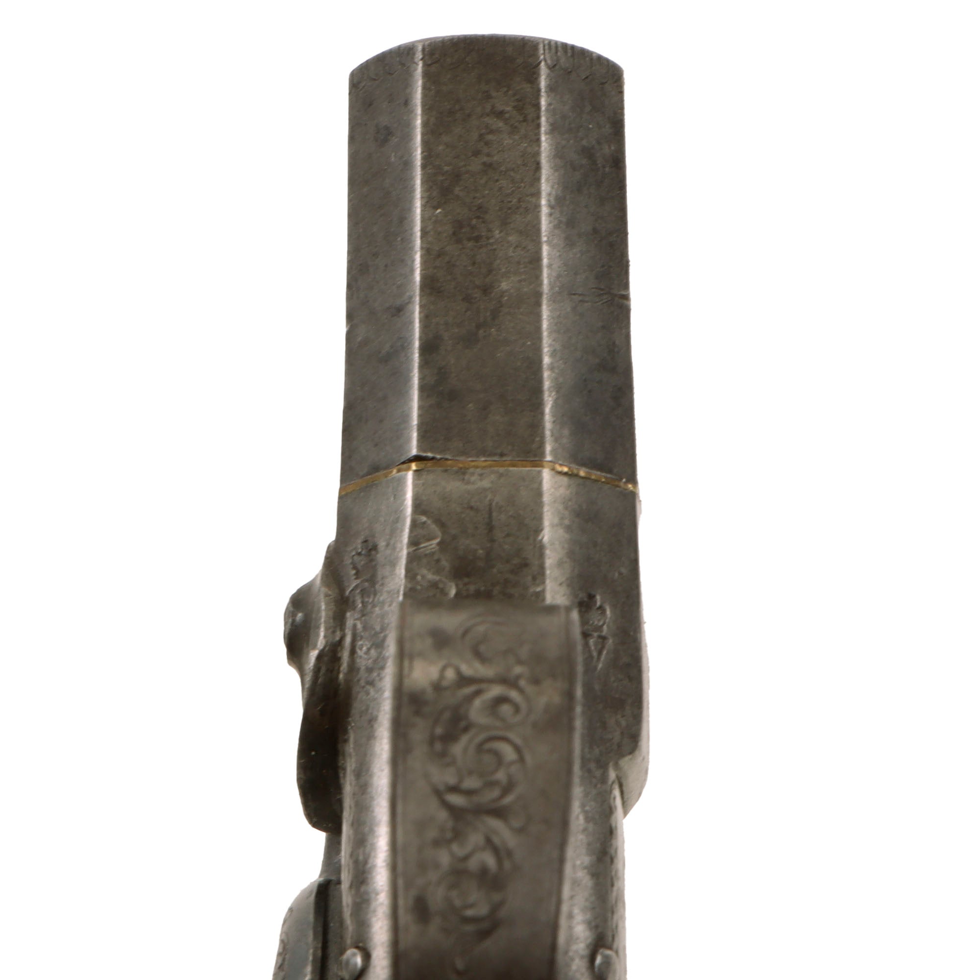 The pistol measures 5 1/2 inches in overall length, featuring a 1 1/8 inch "turn off" .48" bore barrel, which is no longer removable. It looks to either have a brass washer installed long ago, or was possibly brazed solid. Aside from the maker marks, it has some lovely "Bank Note" style engraving on the frame, which extends to the top as well, and even onto the trigger guard. It also has a lovely iron butt cap with similar engraving, which has a small compartment for a spare bullet. The underside of the iron frame by the barrel joint is marked with London proof marks: the CROWN / GP "Gunmakers" black powder proof and CROWN / V "viewed" marking from the London Gun Company proof house.