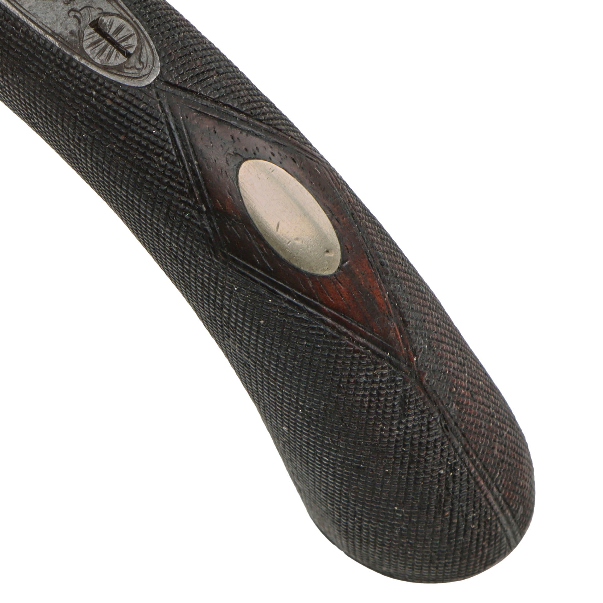 The pistol follows the classic style, and is fitted with a very nice finely checkered shaped grip, which is in very good shape. There is an oval escutcheon on the back of the grip, which looks to be made from silver. Overall condition is very nice, and it has a great look, still retaining much of the original finish and engraving. The lock is fully functional, holding at half-cock and firing at full.