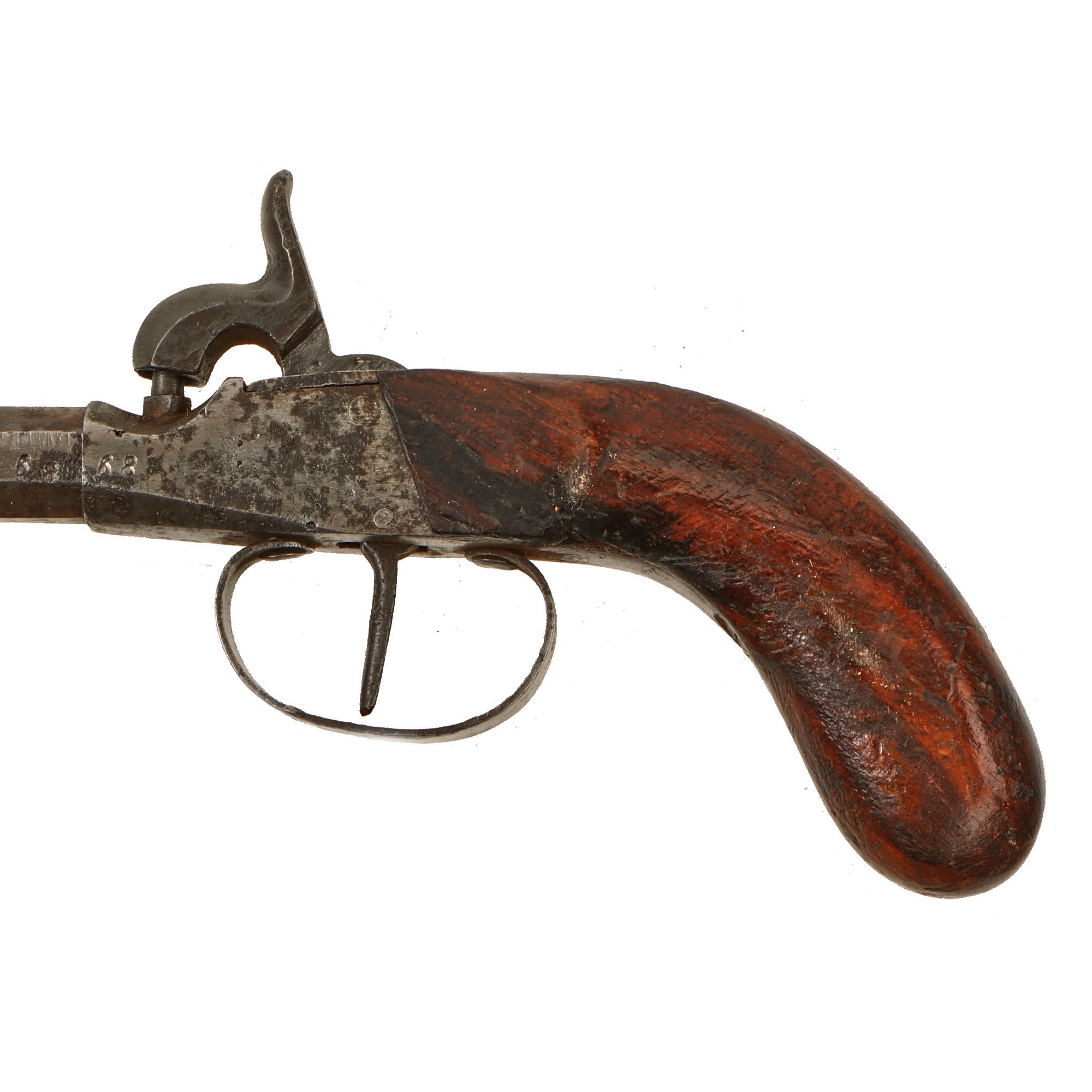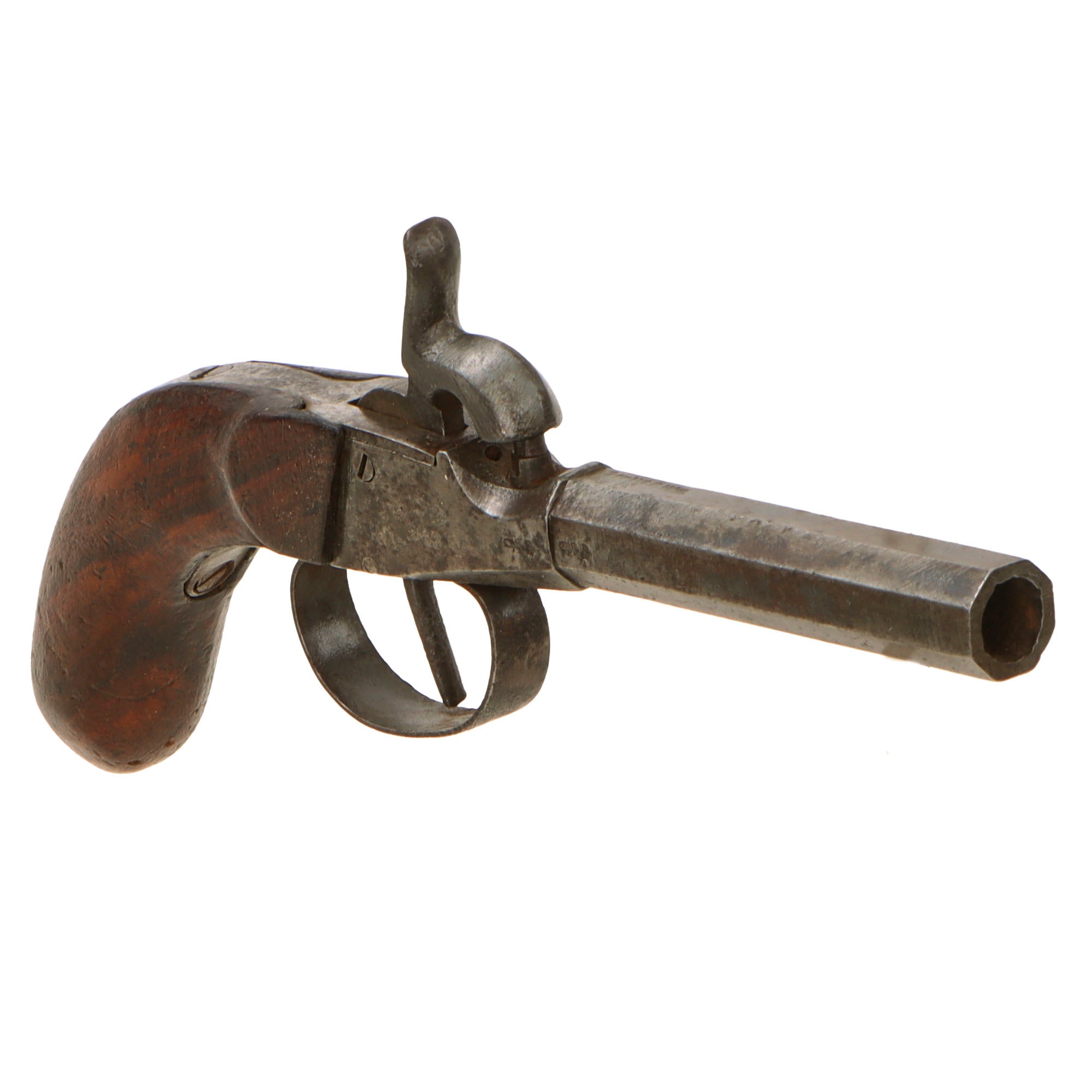 • Original Item: Only One Available. This lovely single shot pocket percussion pistol was made in Germany, very much in the French / Belgian style. These were quite popular for self-protection, and it is quite utilitarian in design, without much of the usual engraving we would see, so it was probably intended for domestic use.