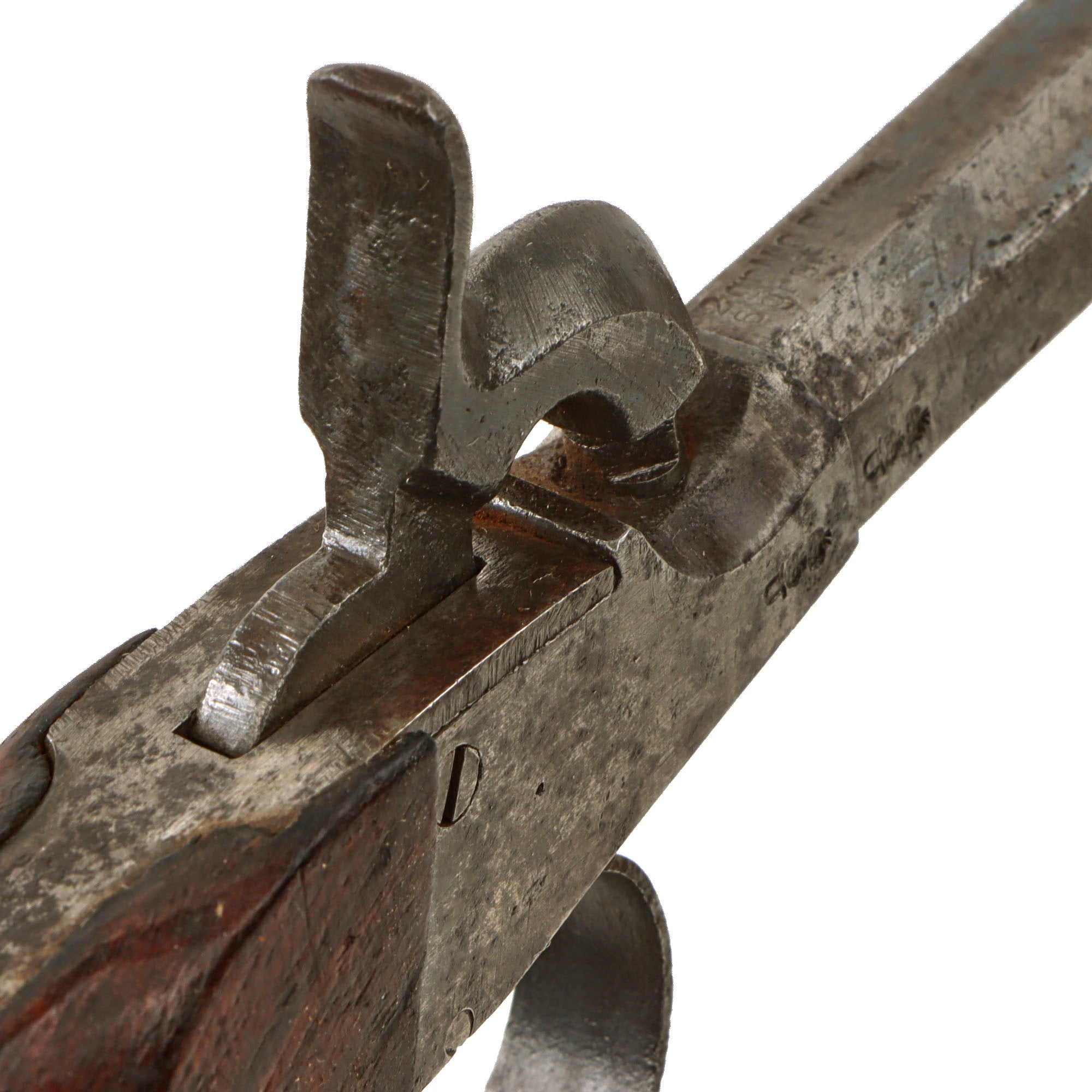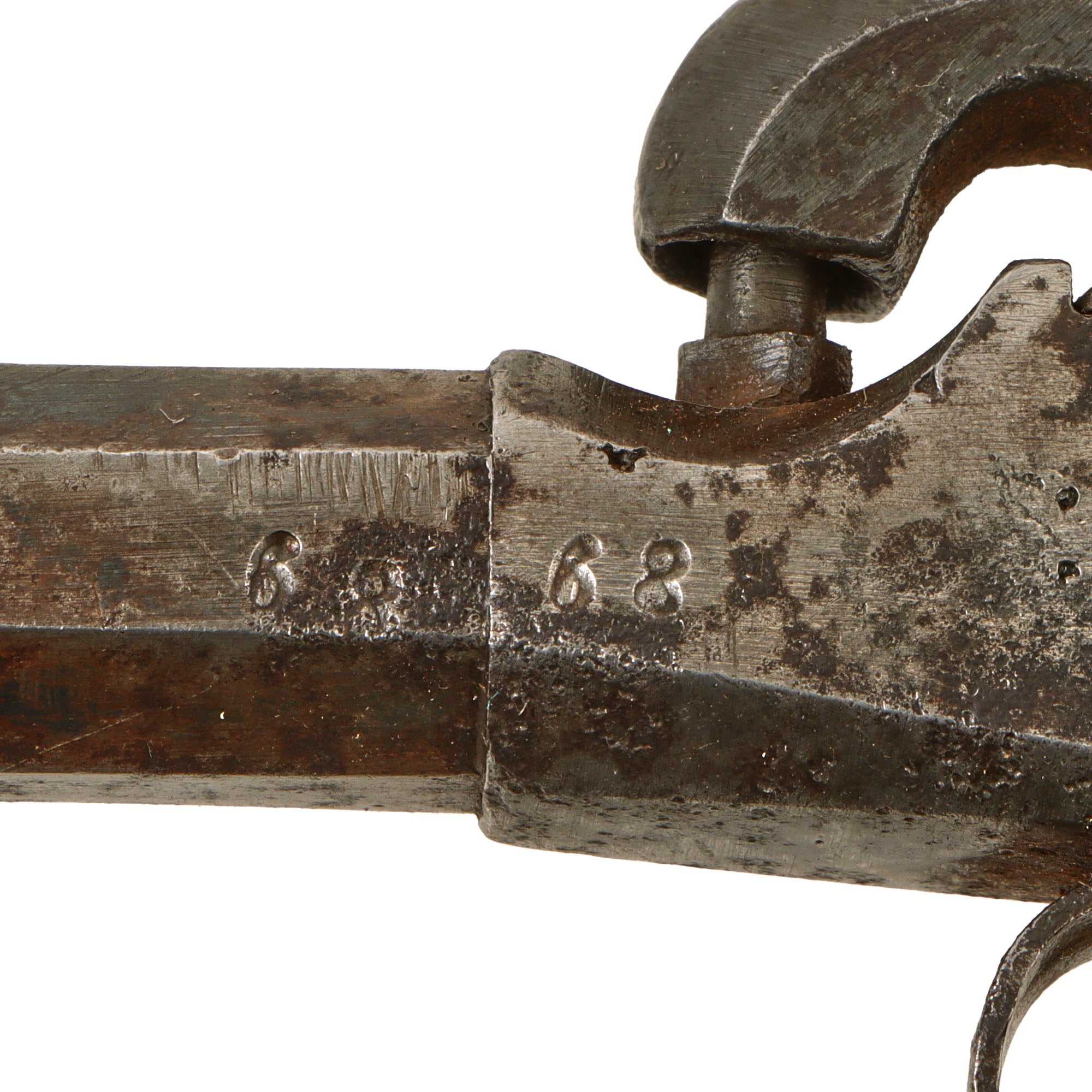 The octagonal smoothbore barrels measure 3" in length, and has grooves on the inside muzzle to unscrew it, however it is currently frozen onto the receiver. The right side of the frame and barrel are marked with CROWN / CROWN / U, a proof only used by Germany starting in the second half of the 19th century. There is also serial number 68 on the left side of the barrel as well as on the frame. The top of the barrel has the loading specifications, which were required to be stamped on all German guns after 1871, with previously made guns that were resold requiring remarking:
