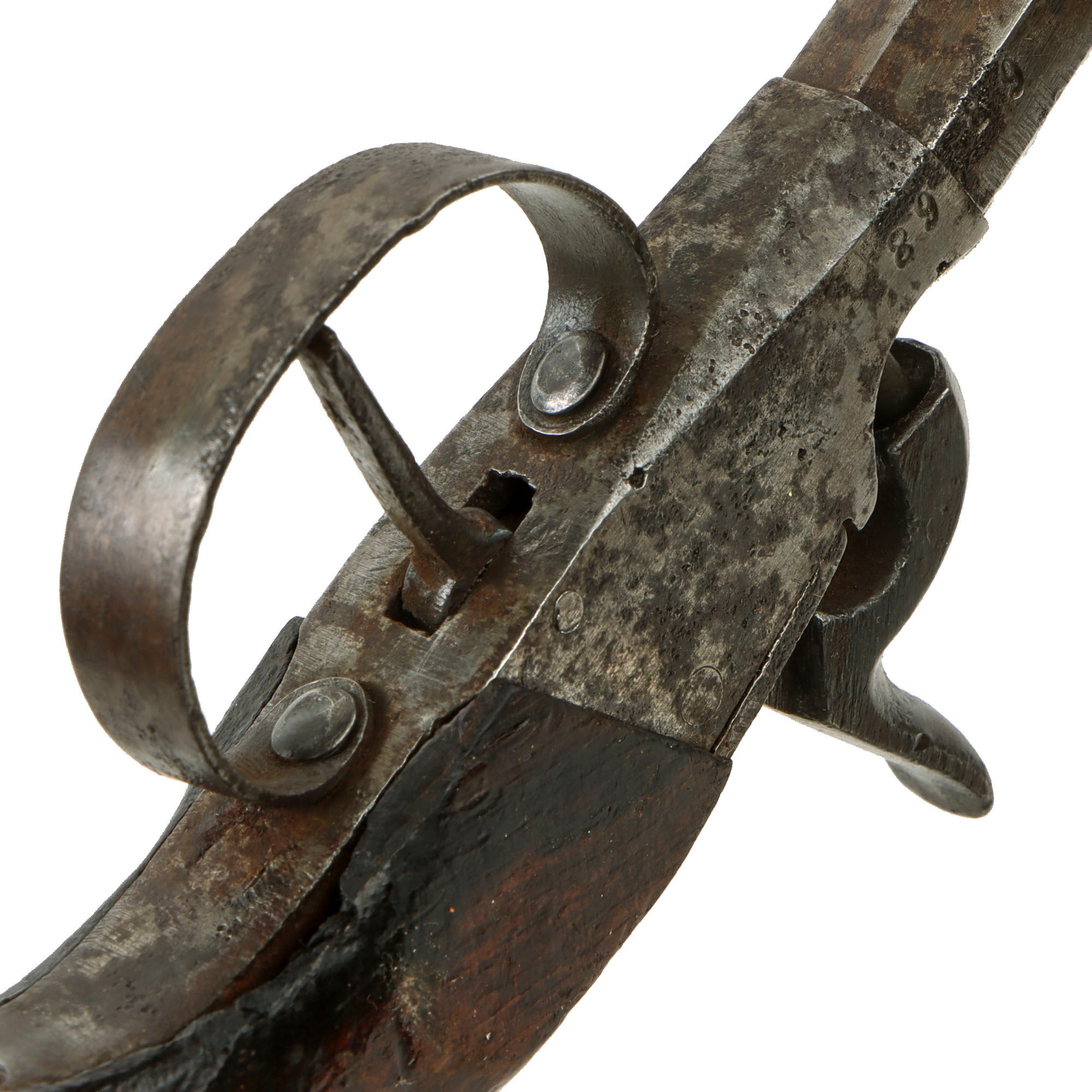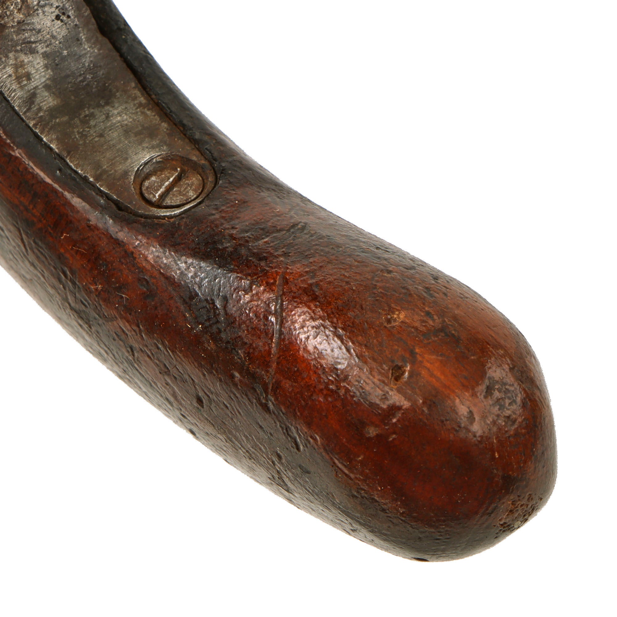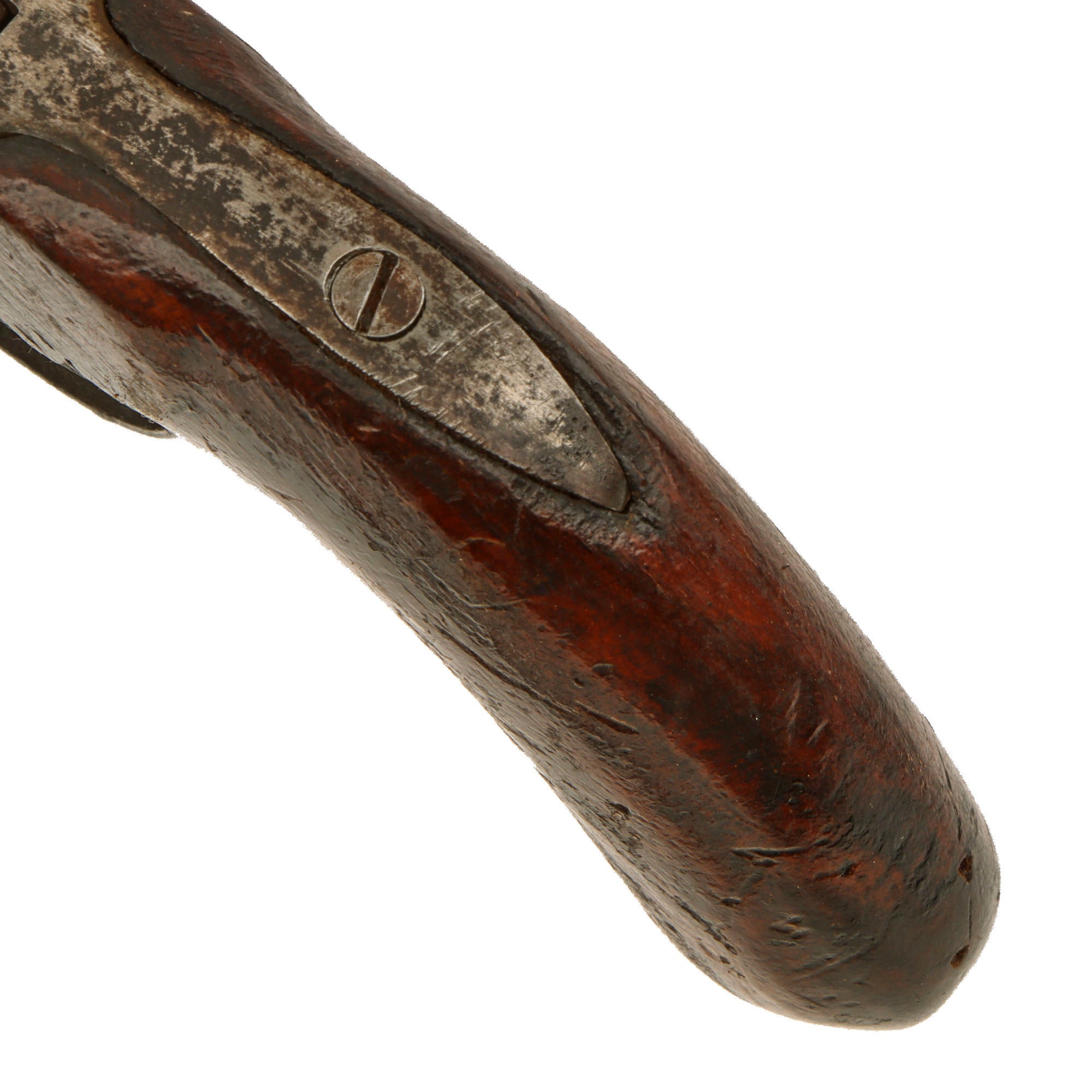The pistol measures 7 3/4" overall, there are no other markings we can see besides the proofs. The pistol features a very nice wooden "bag" style grip, which is very comfortable to hold, though it is definitely simplified, without any "scallop" ornamentation along the frame. Condition of the pistol is very good, showing a lovely polished steel finish, with some areas of past peppering, now cleaned. The lock is fully functional, holding at half cock and firing at full, though the trigger pull required is quite heavy. The cap nipple is present, and in very good shape.