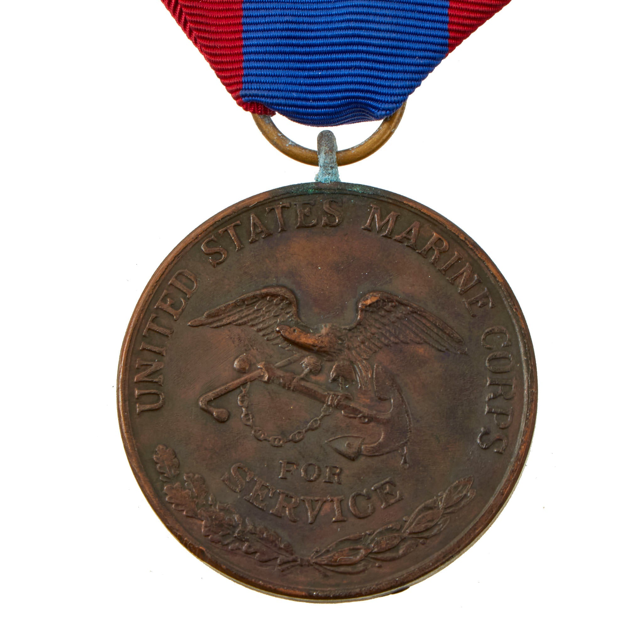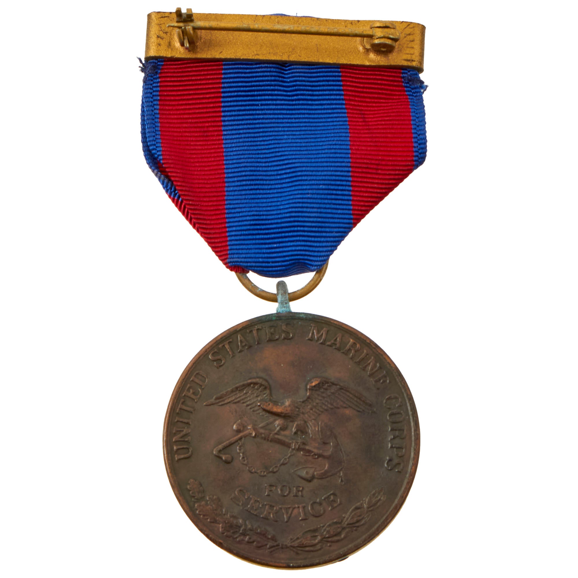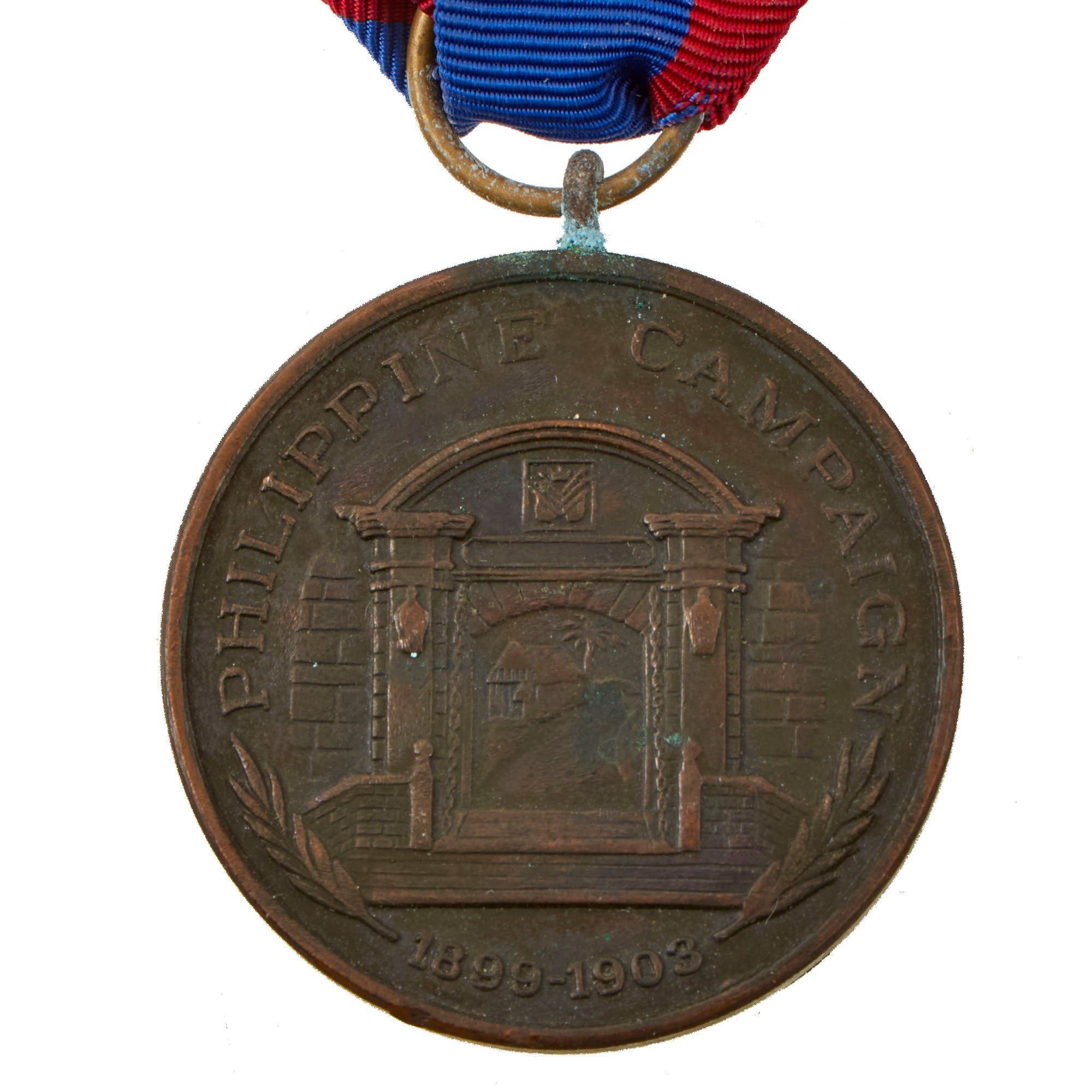 The Navy/Marine Corps version of the medal features an image of the Manila city gate over the years “1898-1903” framed by laurel branches. Text on the upper portion of the medal reads “PHILIPPINE CAMPAIGN.” The reverse features the image of an eagle perched on an anchor with a draped chain upon which are inscribed the words “FOR SERVICE.” Oak and laurel decorate the lower portion of the medal, and text reads either “UNITED STATES NAVY” or “UNITED STATES MARINE CORPS” as appropriate. The original ribbon issued between 1908-1913, was divided into equal thirds of yellow in the center and red on each side. Thereafter, a blue ribbon with a red vertical stripe toward each edge was issued.