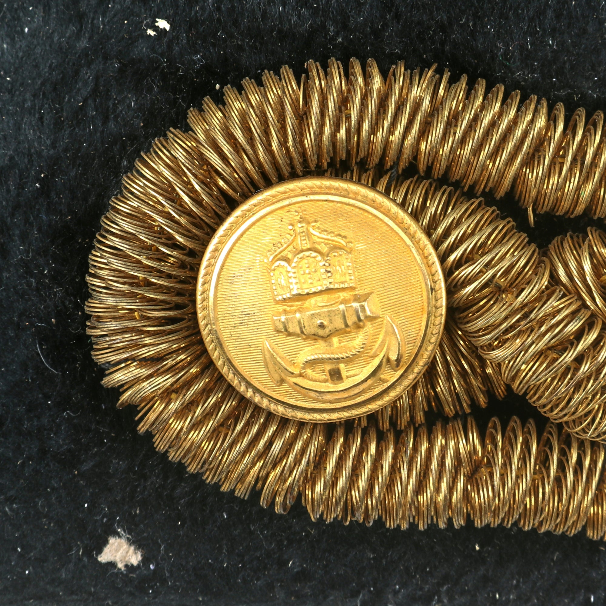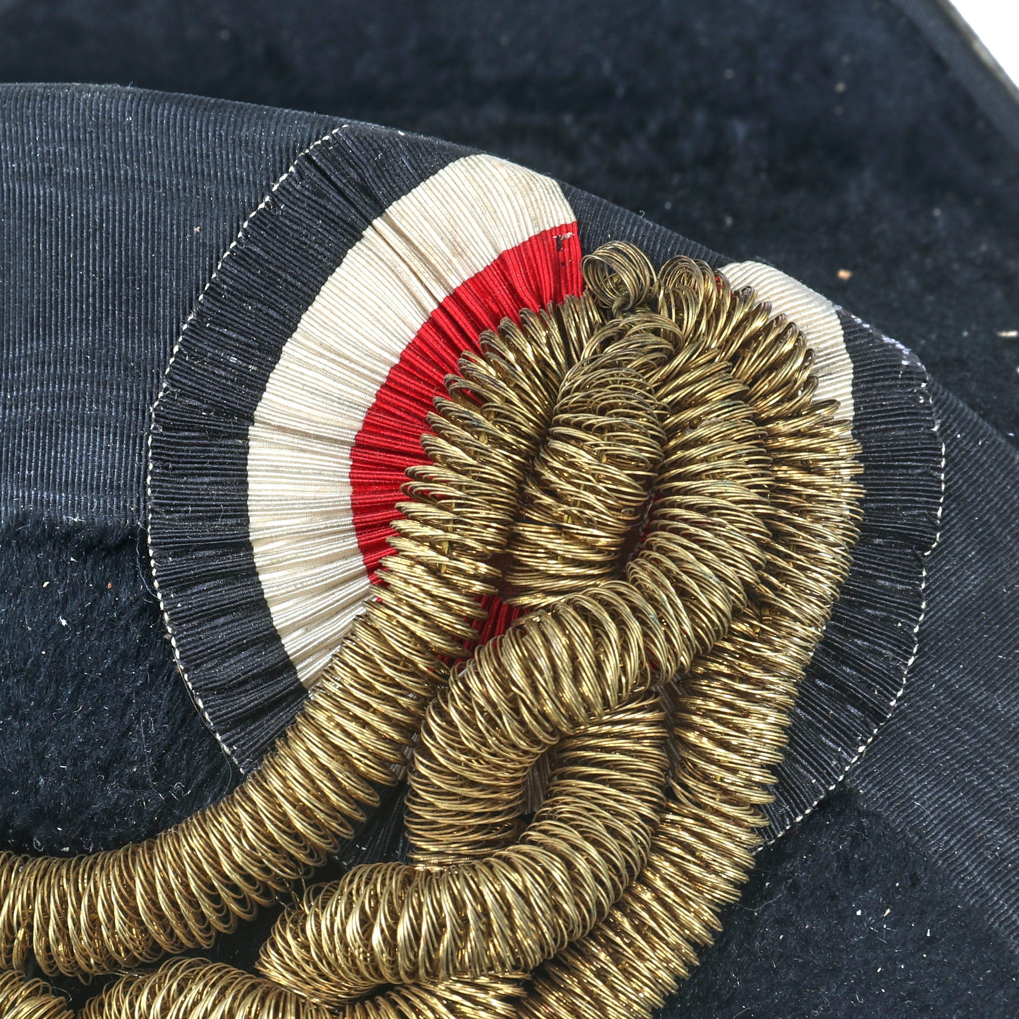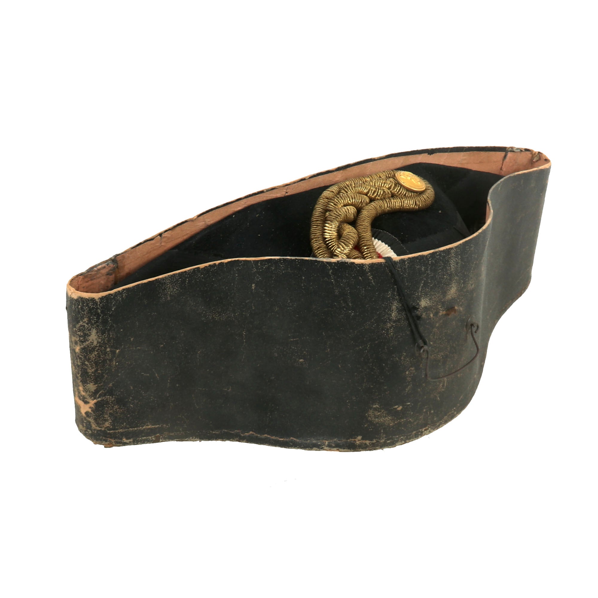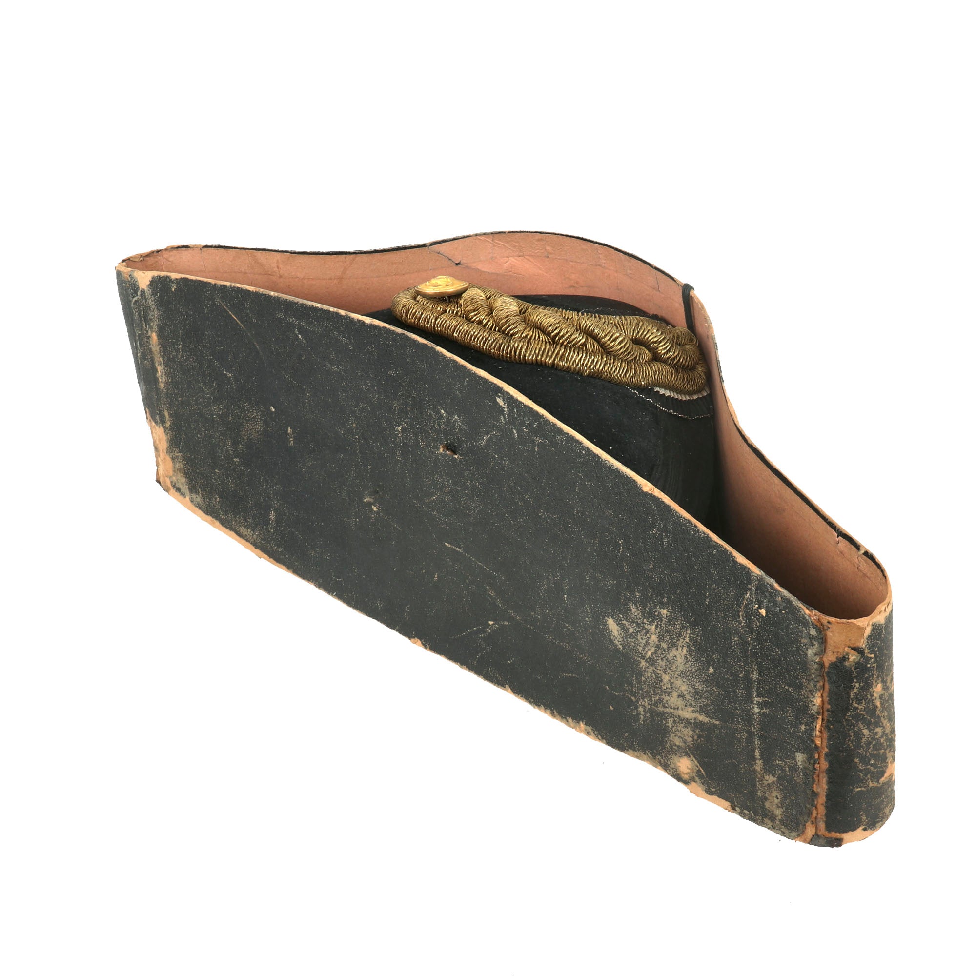 The chapeau is in fantastic condition without any serious dents or damage, with the cockade still fully retained with its gilt and bullion, and a Kaiserliche Marine button. The leather sweatband is still very well-retained as well. The hat is roughly a size 7¼.