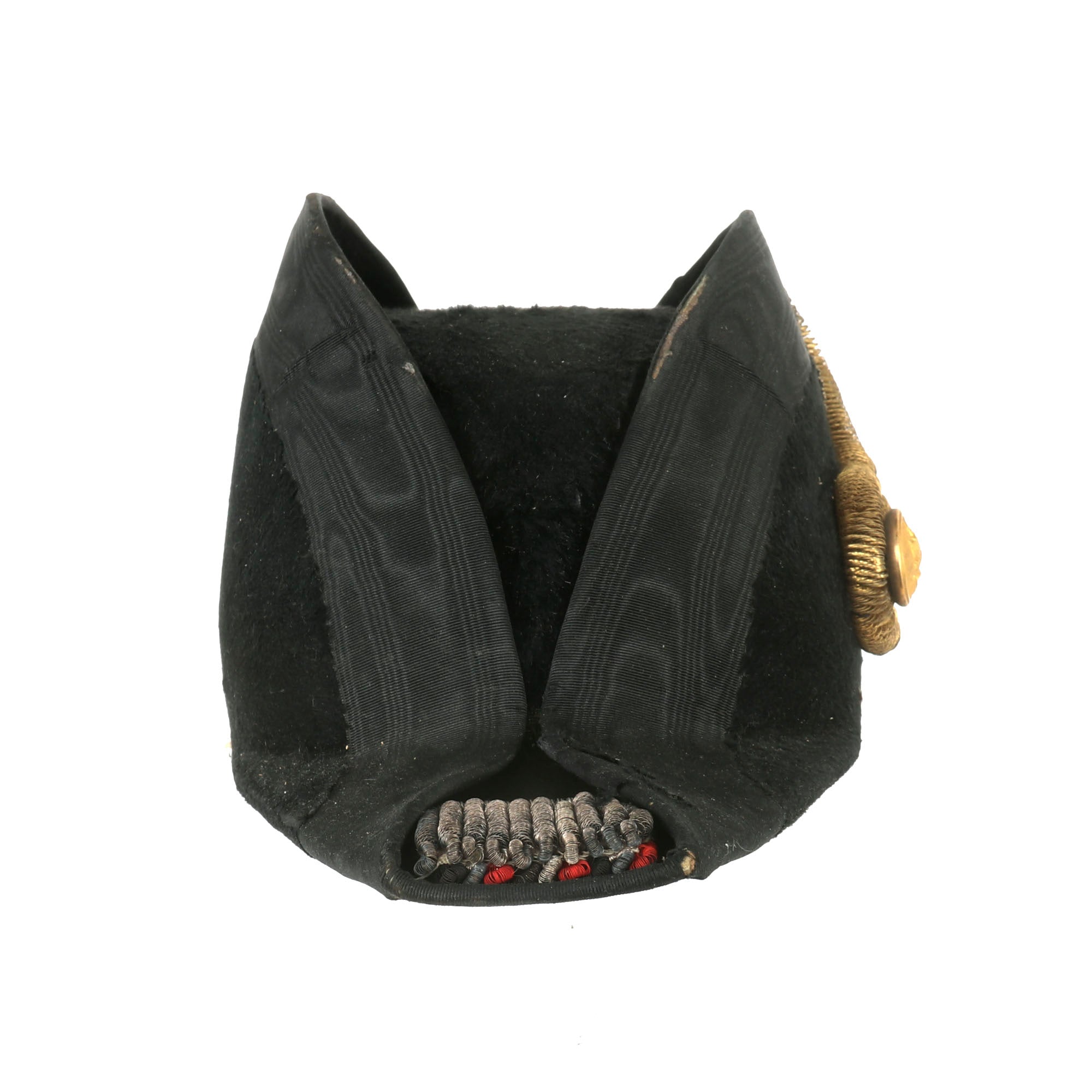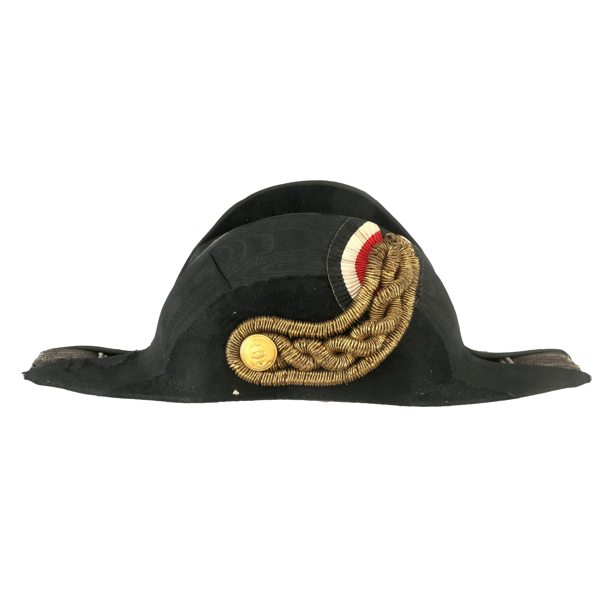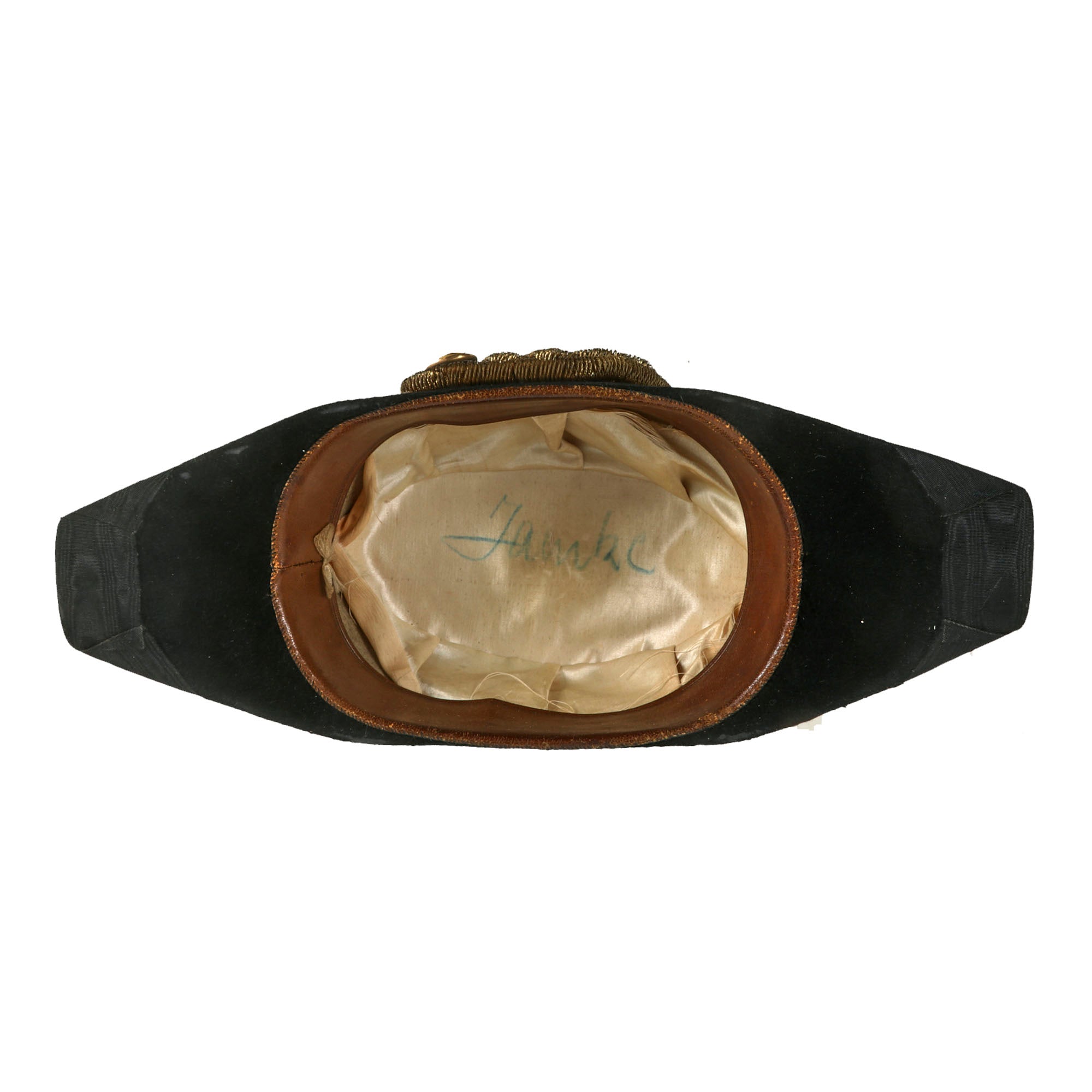Original Item: Only One Available. This is a gorgeous Great War ‘Fore and Aft’ Bicorn chapeau bras collapsible hat for an officer in the Imperial German Navy, or Kaiserliche Marine, circa 1890-1918. Black beaver pelt with gilt wire and white Ostrich features around the brim. The name Tamke is written on the lining, but there is no maker mark.