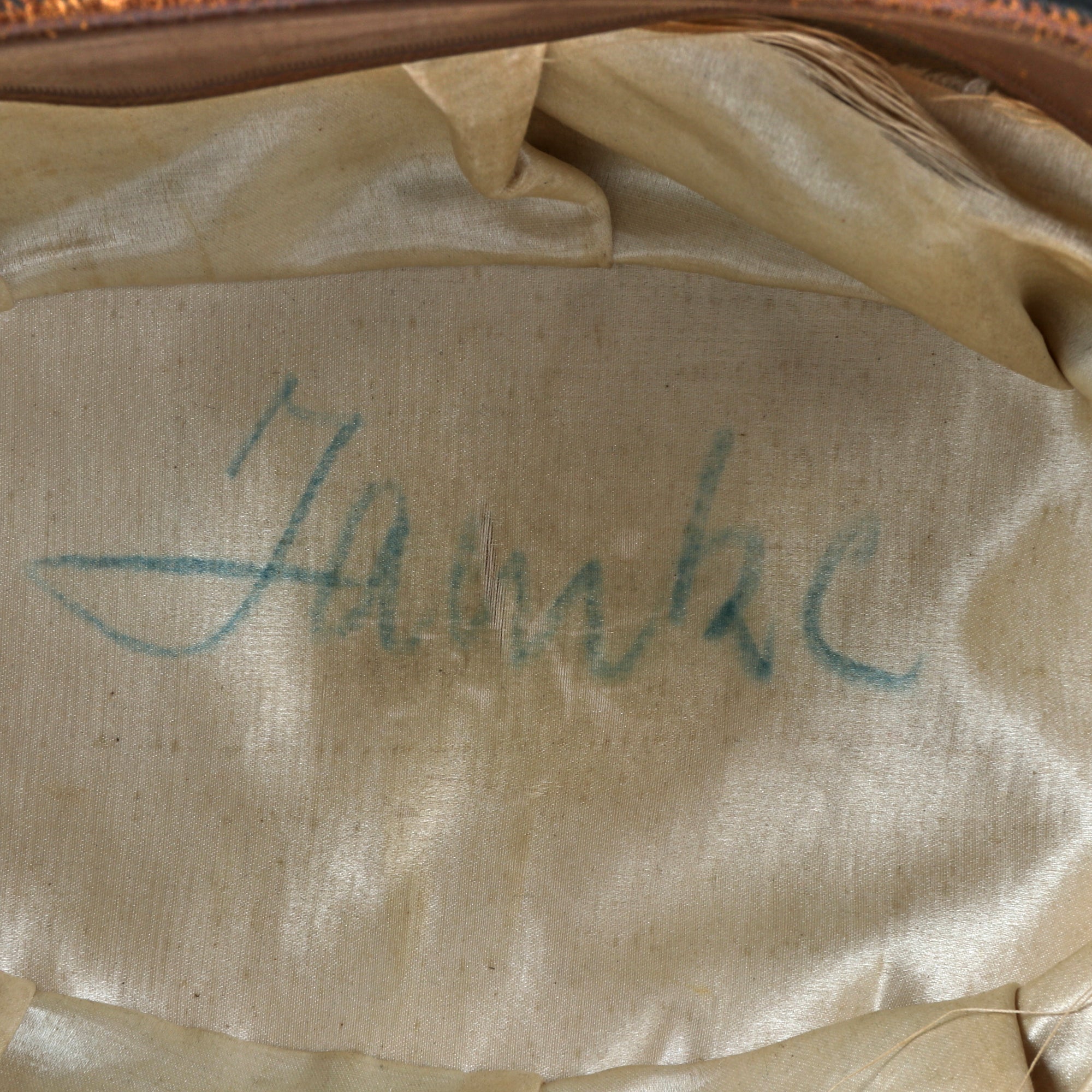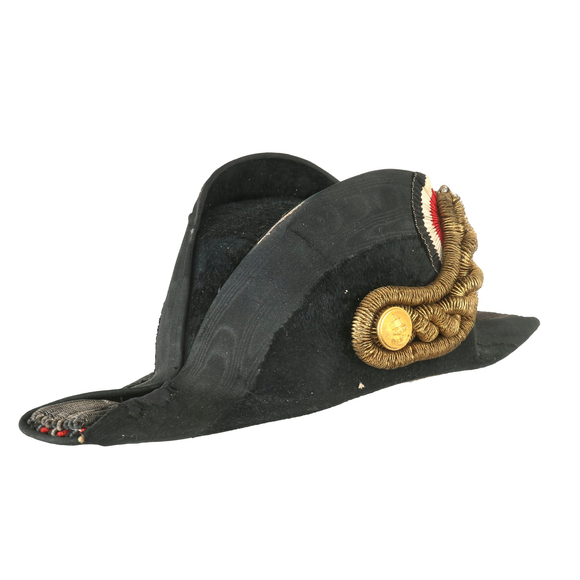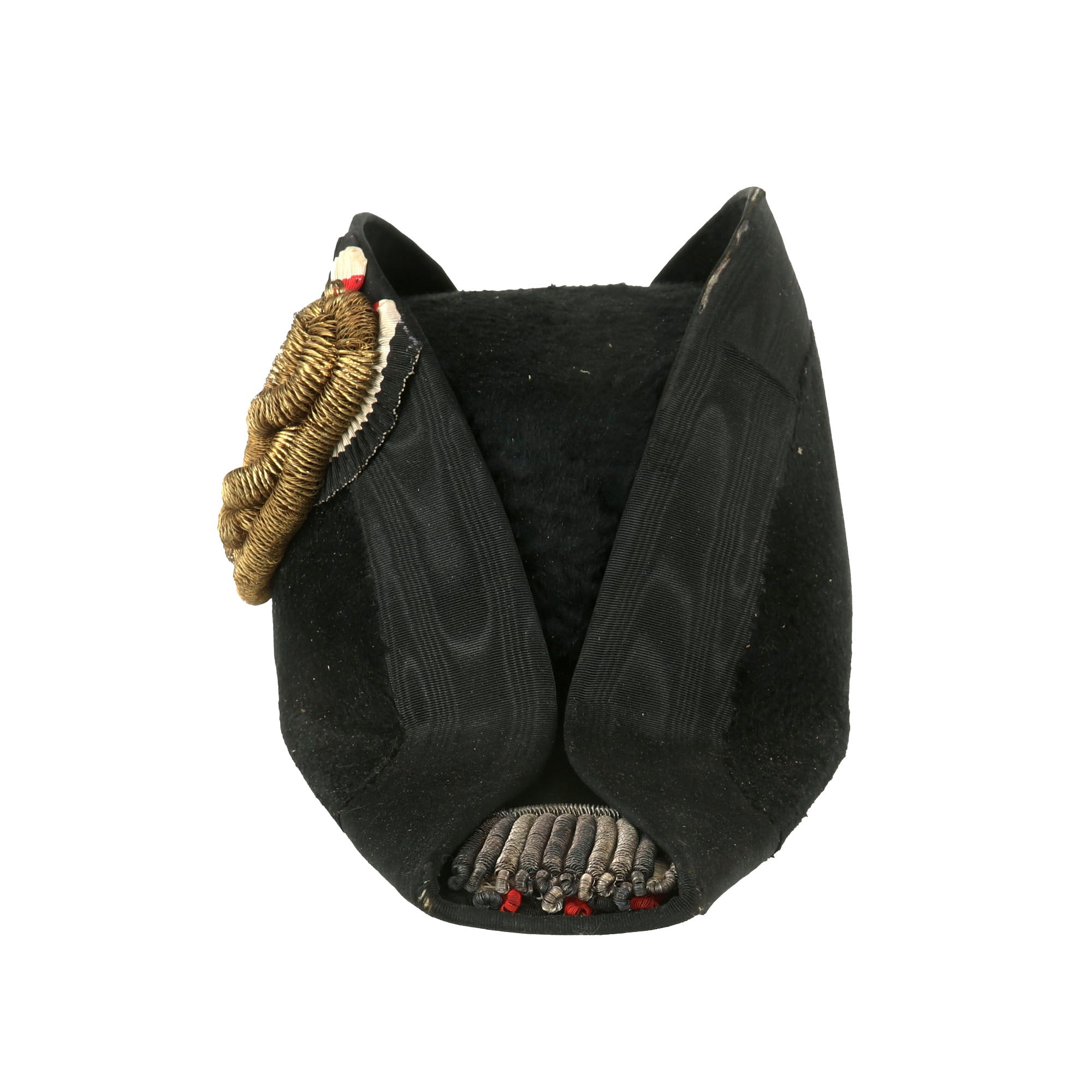 Original Item: Only One Available. This is a gorgeous Great War ‘Fore and Aft’ Bicorn chapeau bras collapsible hat for an officer in the Imperial German Navy, or Kaiserliche Marine, circa 1890-1918. Black beaver pelt with gilt wire and white Ostrich features around the brim. The name Tamke is written on the lining, but there is no maker mark.