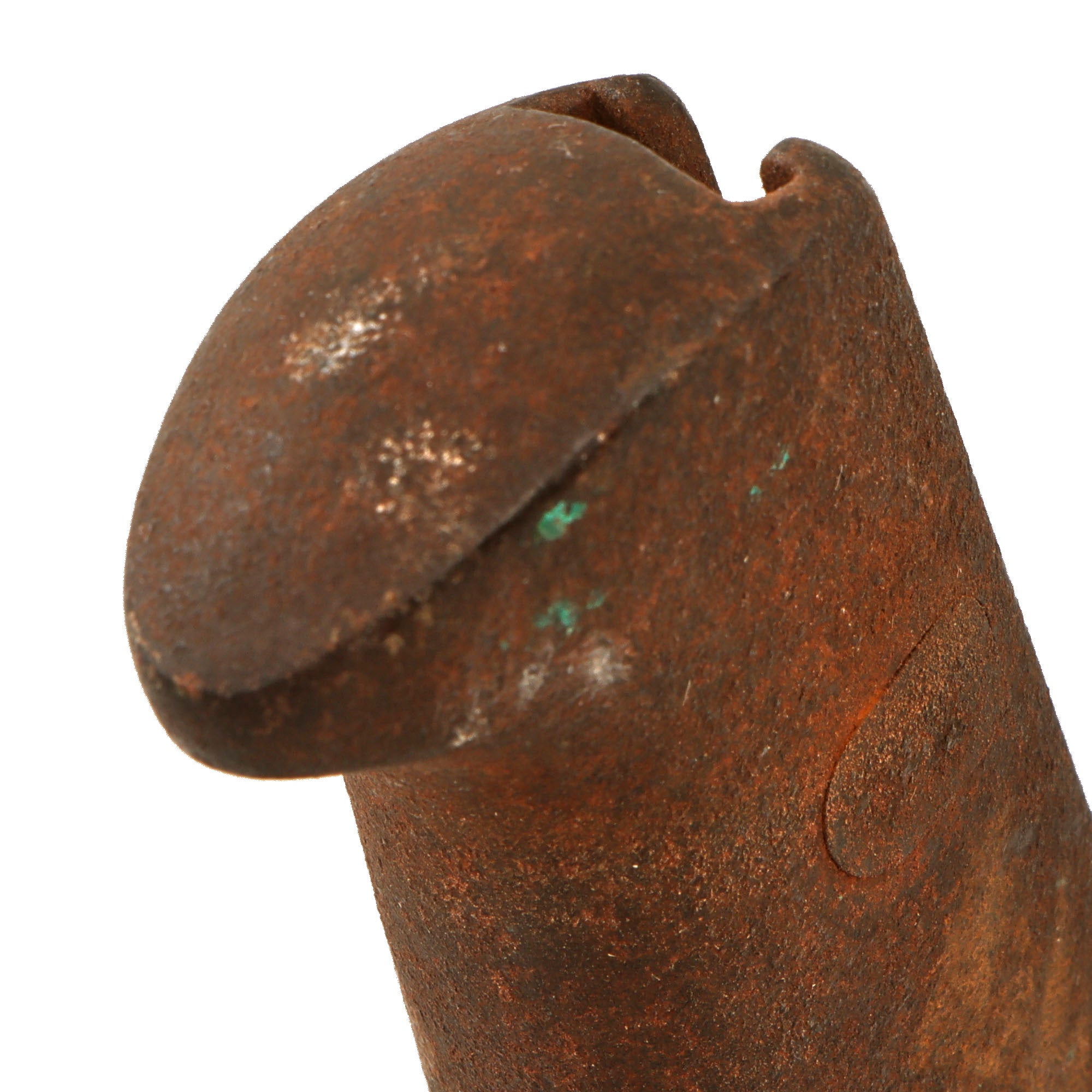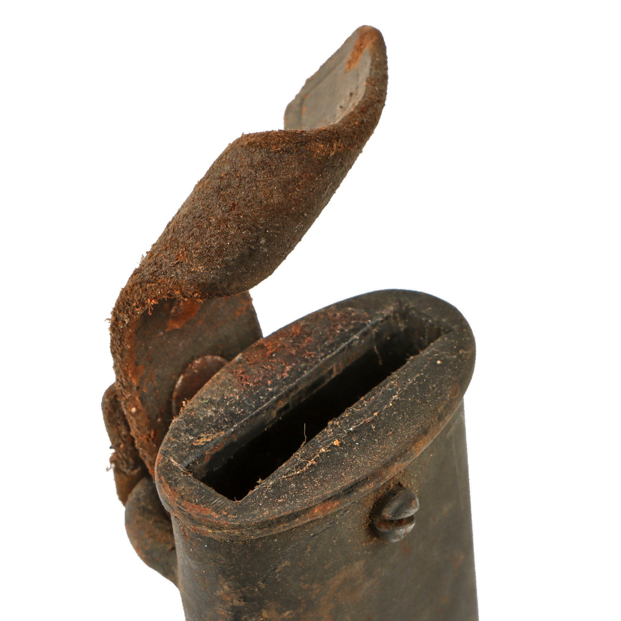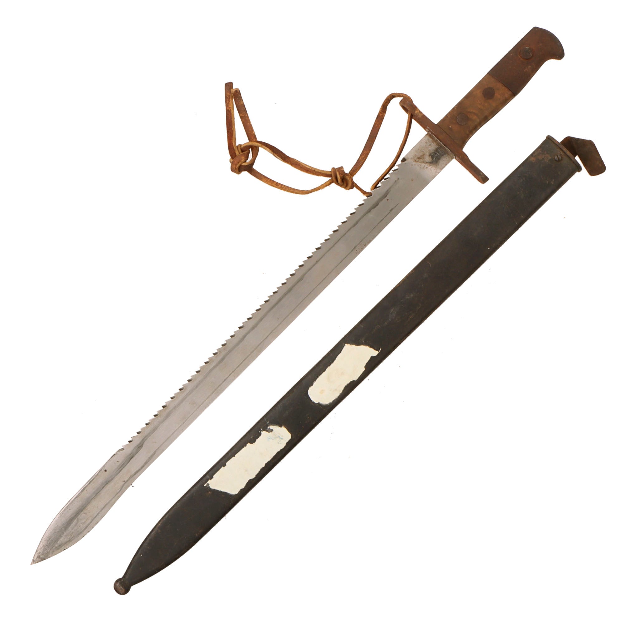 The scabbard is straight, though does have some dents, and has surface rust over most of the surface. Some of the original finish remains however, and the original leather attachment strap is still present, though in delicate condition. There is heavy residue on one side, likely from tape or a tag. Due to the heavy wear and oxidation, the scabbard doesn’t fit onto the bottom ½” of the blade.
