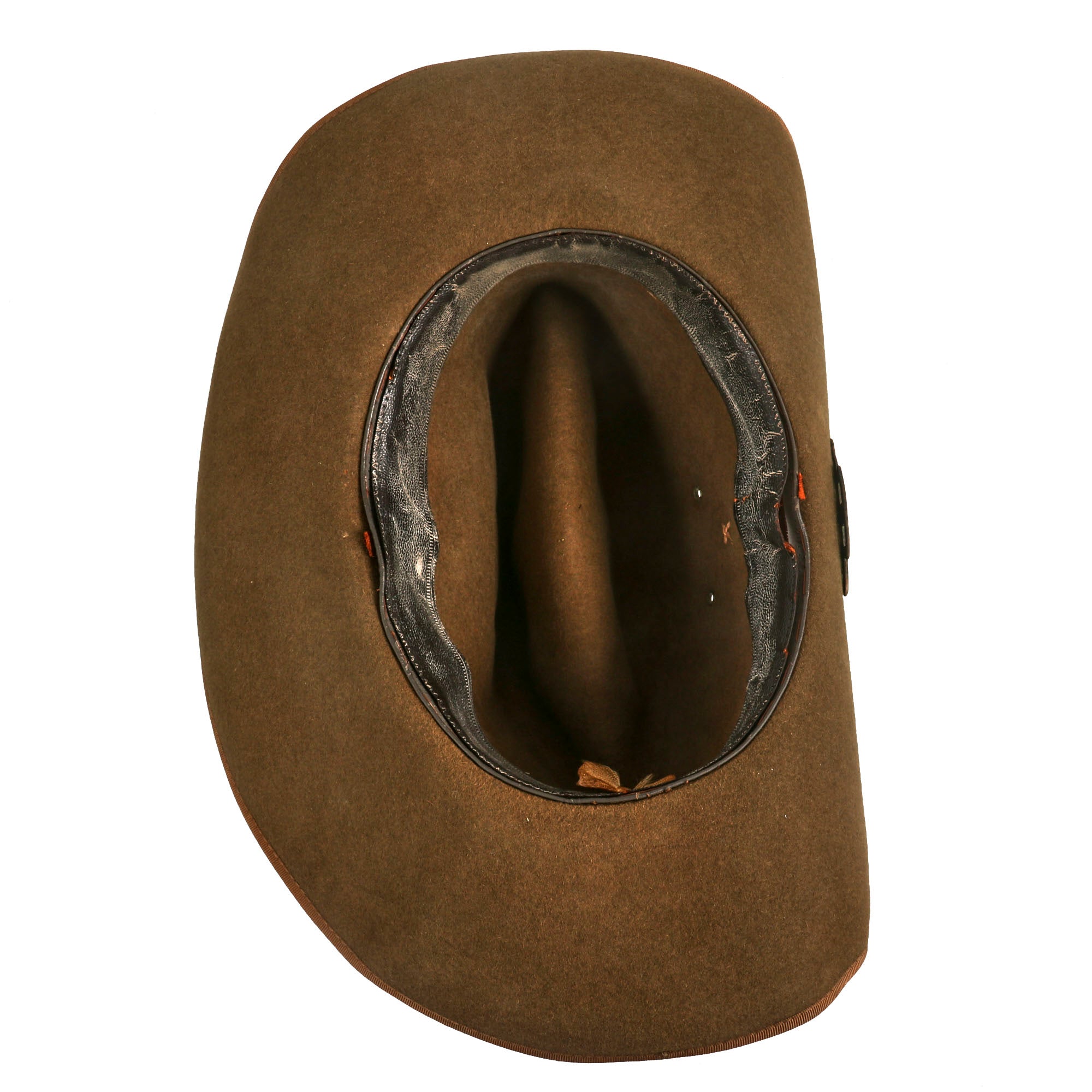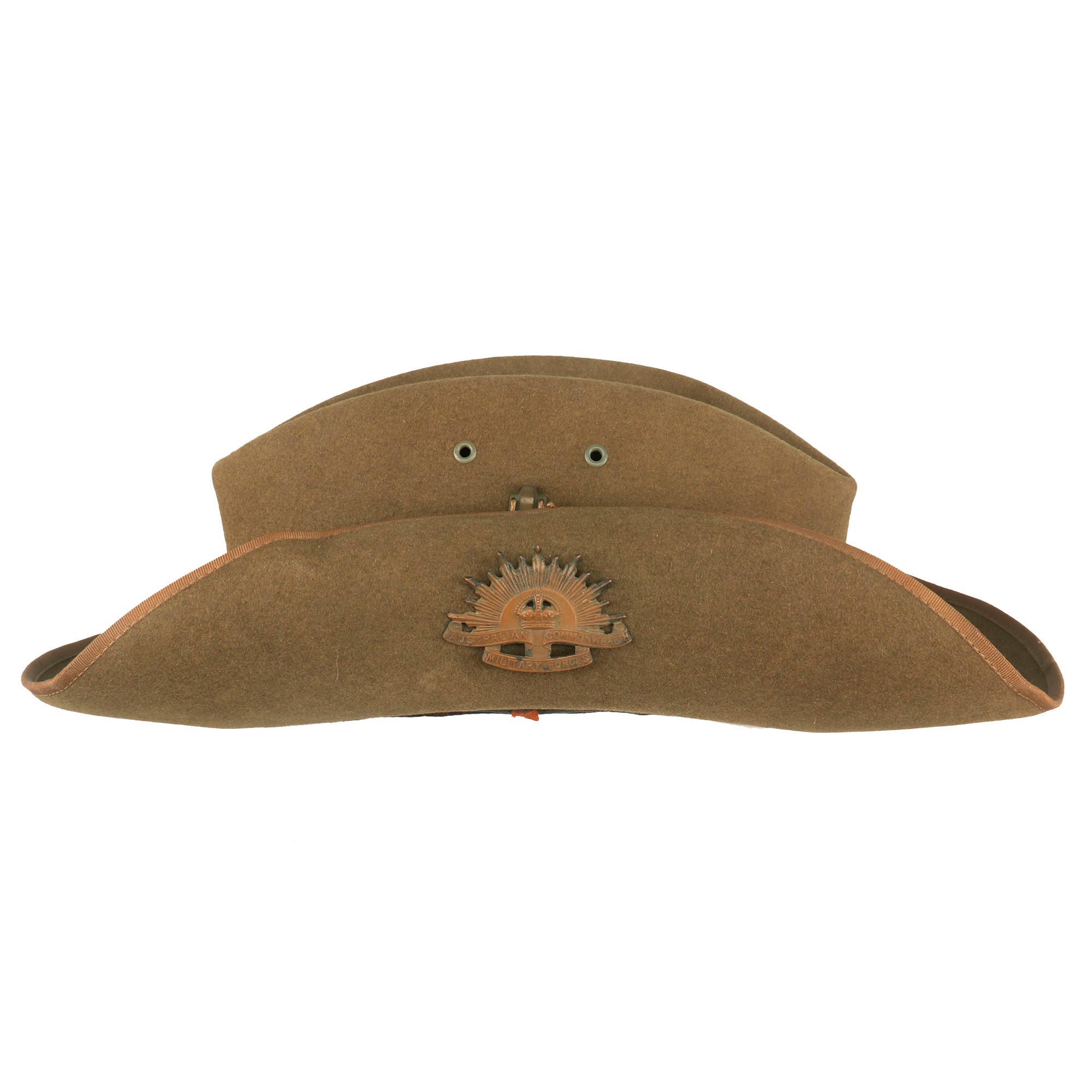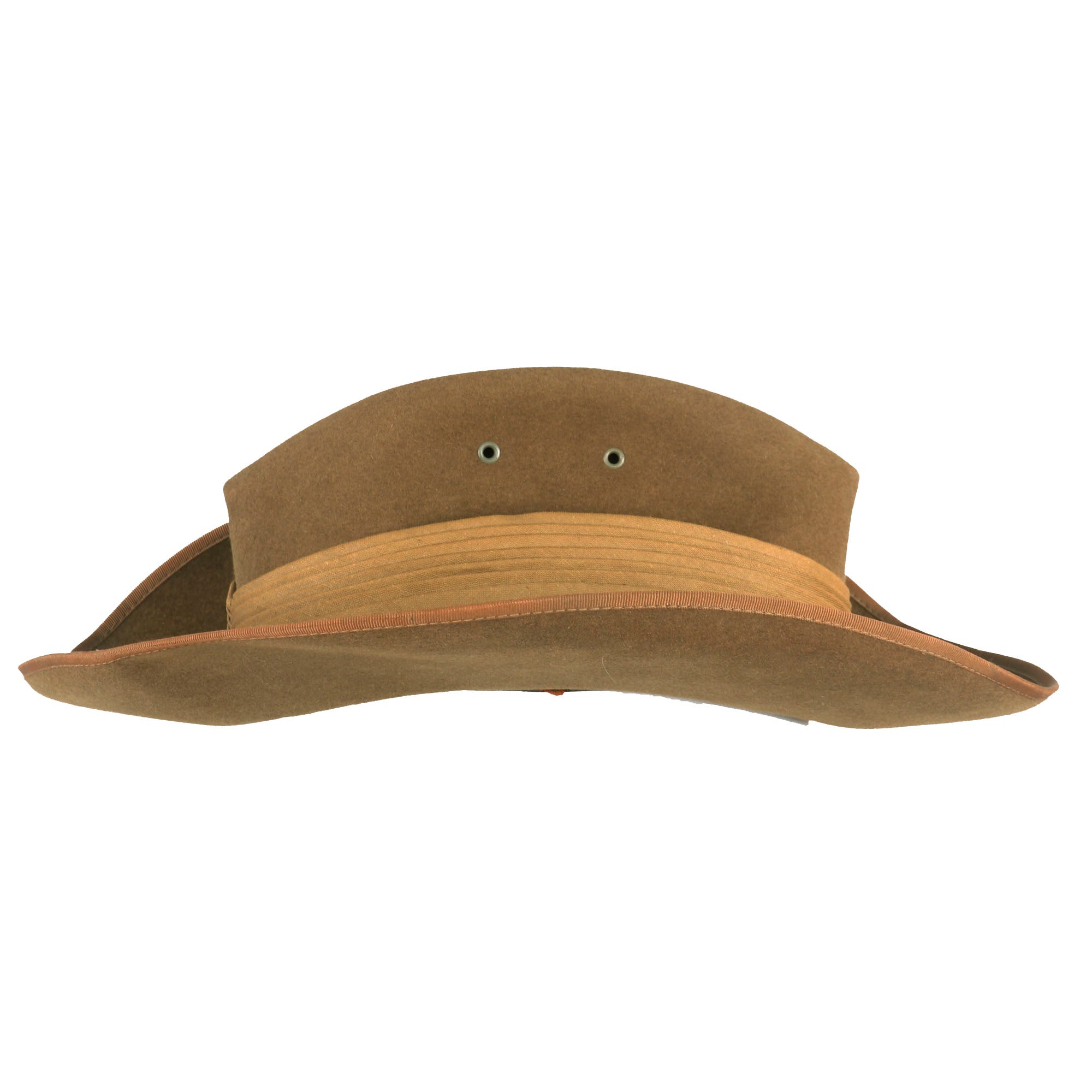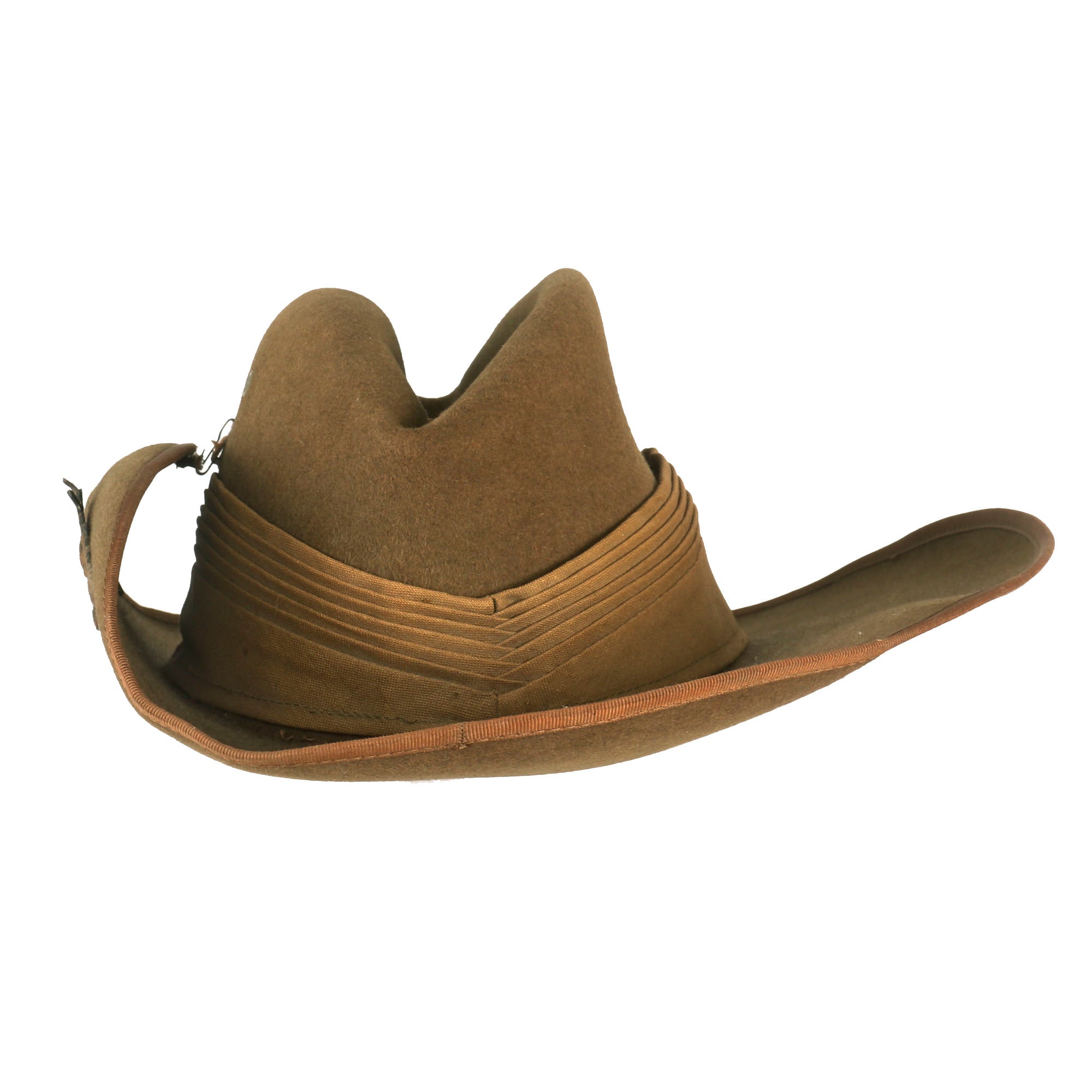 The distinctive Australian slouch hat, sometimes called an "Australian bush hat" or "digger hat", has one side of the brim turned up or pinned to the side of the hat with a Rising Sun Badge in order to allow a rifle to be slung over the shoulder. The Badge on this particular cap is a correct WWII Issue version, which appears to have been fitted to this hat for a very long time. The hat itself is of WWII Manufacture, with an artificial leather sweatband that is dried and partially attached. It is in very good condition for its age.