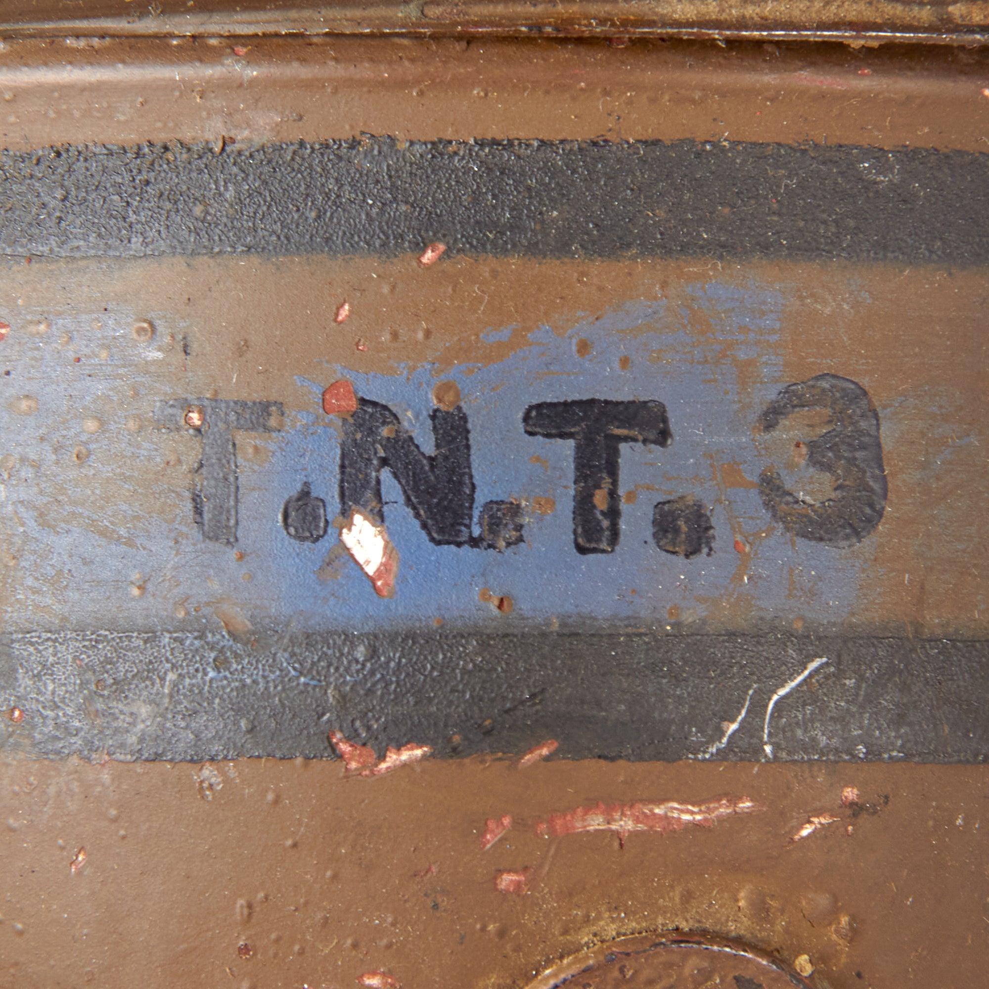 The tip of the PIAT has a red band painted on it, and the lower head has one large faint blue stripe between two black lines. The round measures roughly 14⅝” in length. The round is missing some of the paint in certain spots. The piece wrapped around the fin assembly is bending in a few spots and has some material loss. The shaft of the round is stamped III. The PIAT round is stamped in two places on the warhead