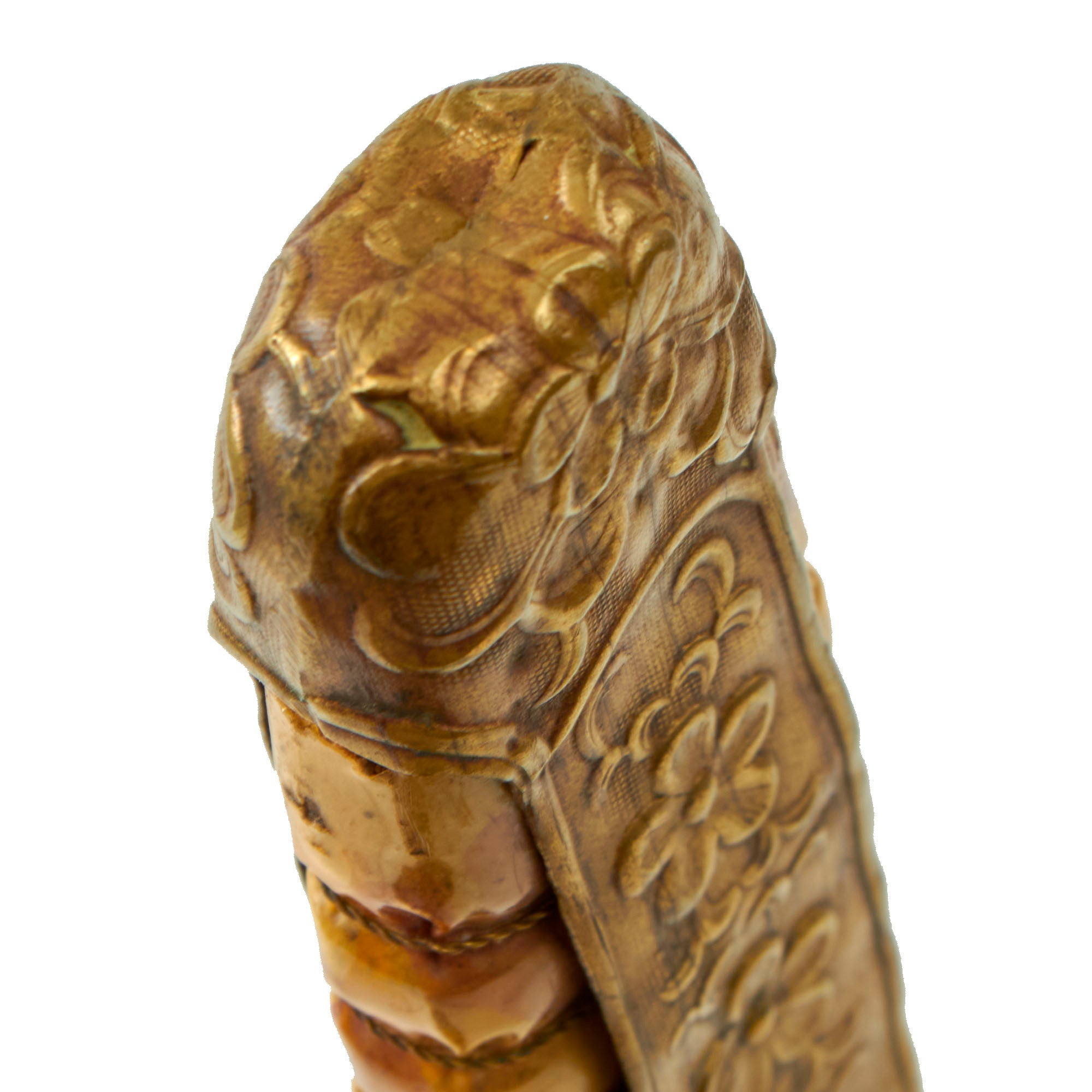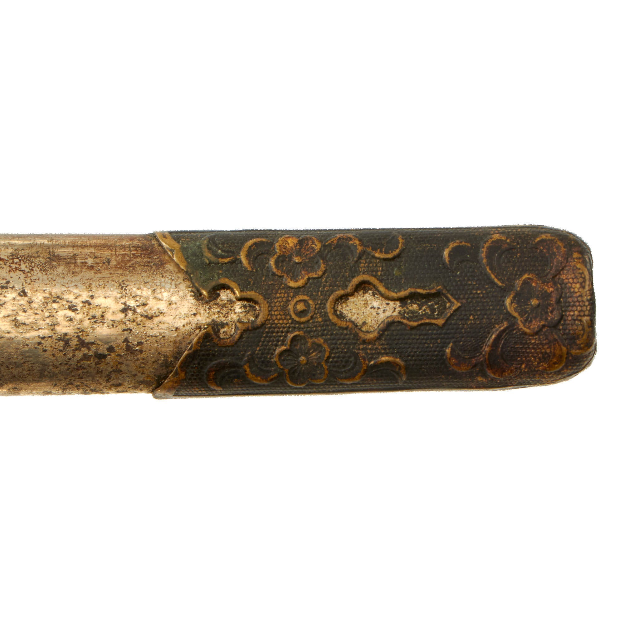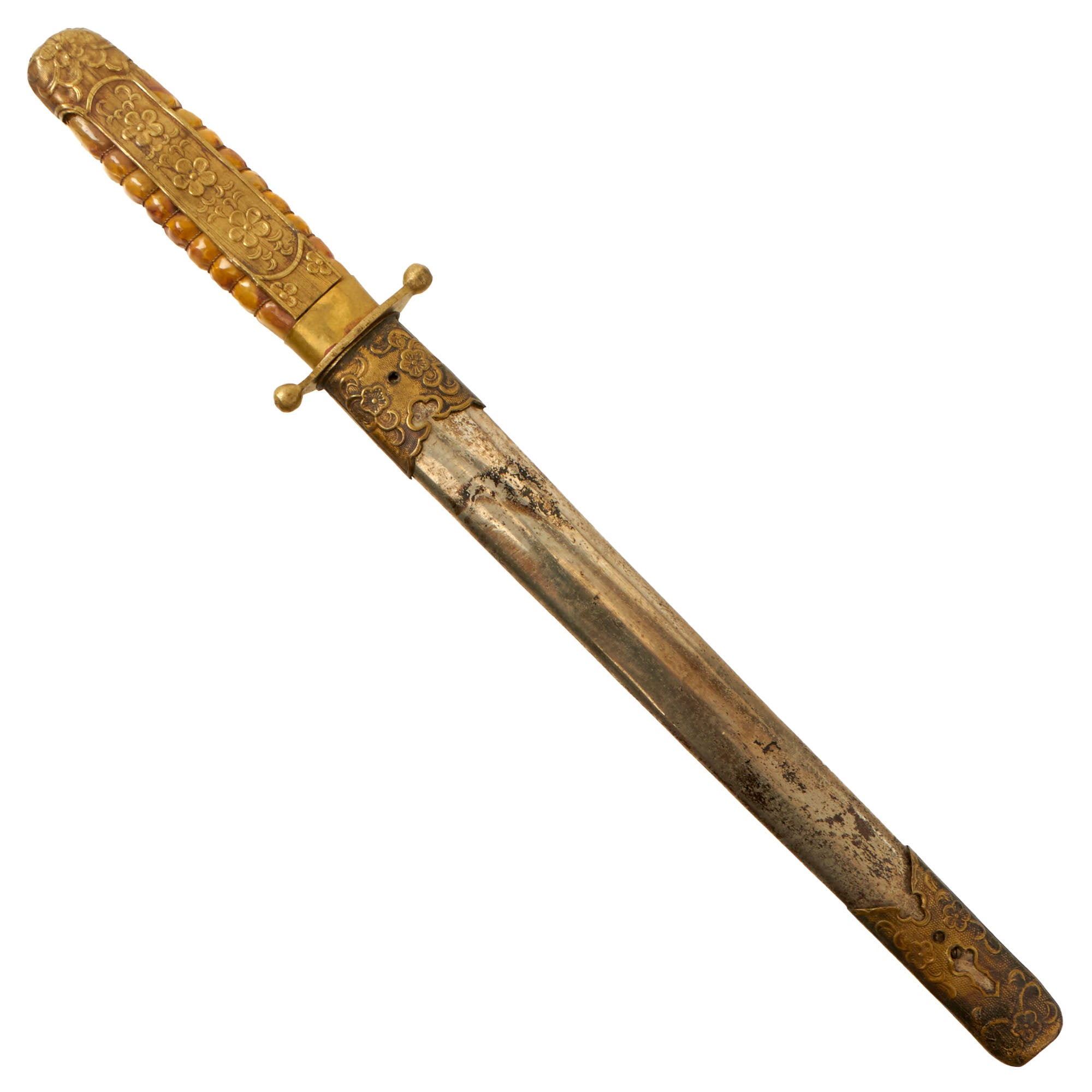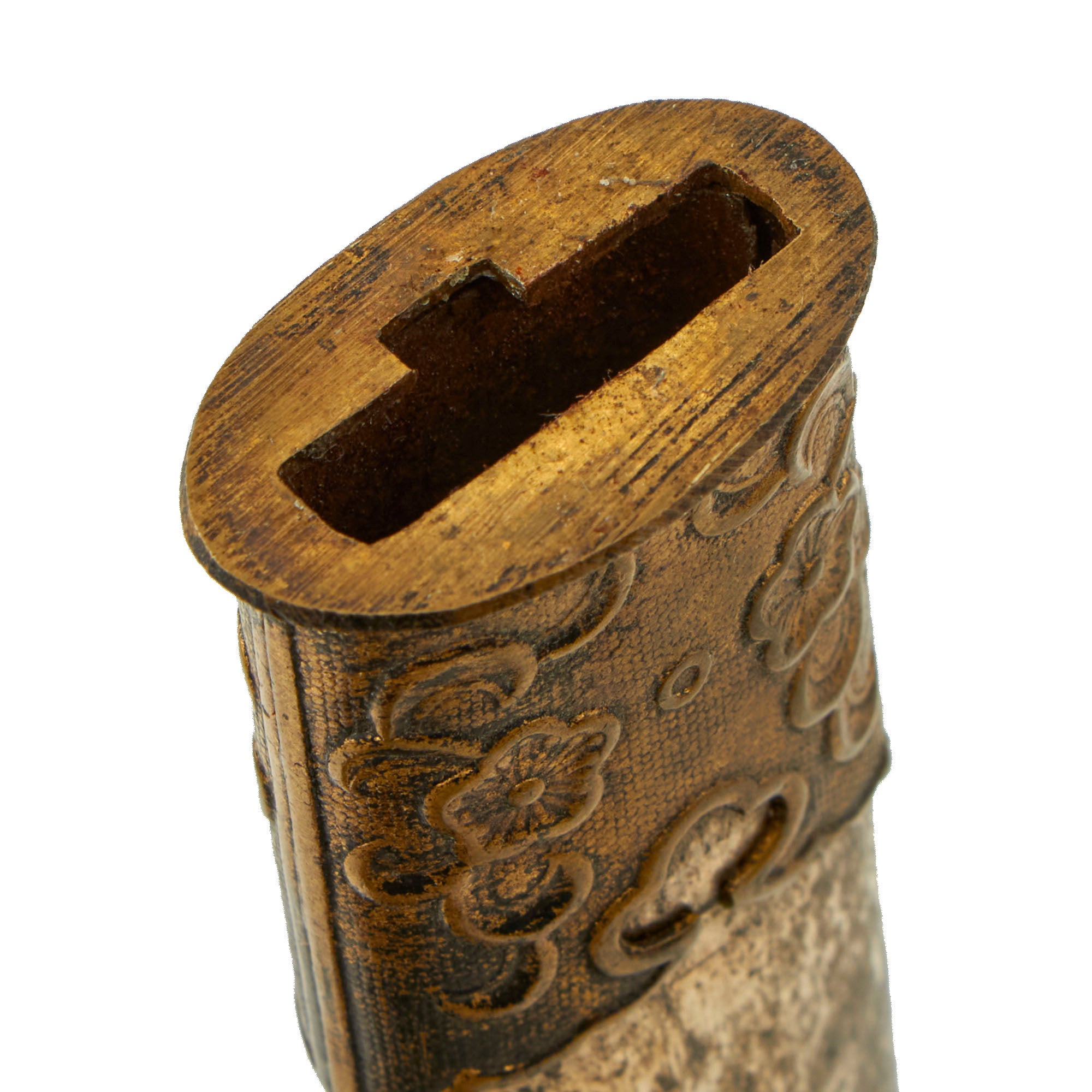 Gilt brass crossguard that sits tight against the adjoining ferrule, which is held in place with a single brass screw. This example does not have a scabbard lock button, nor does it look to have ever had one, but the scabbard has a spot for one. The handle is fabricated from age-toned multicolored celluloid, with eight rows of wire wrap, with decorative brass panels on each side, which come together at the pommel. These show multiple Chinese plum blossoms, a motif which is repeated on the pommel.