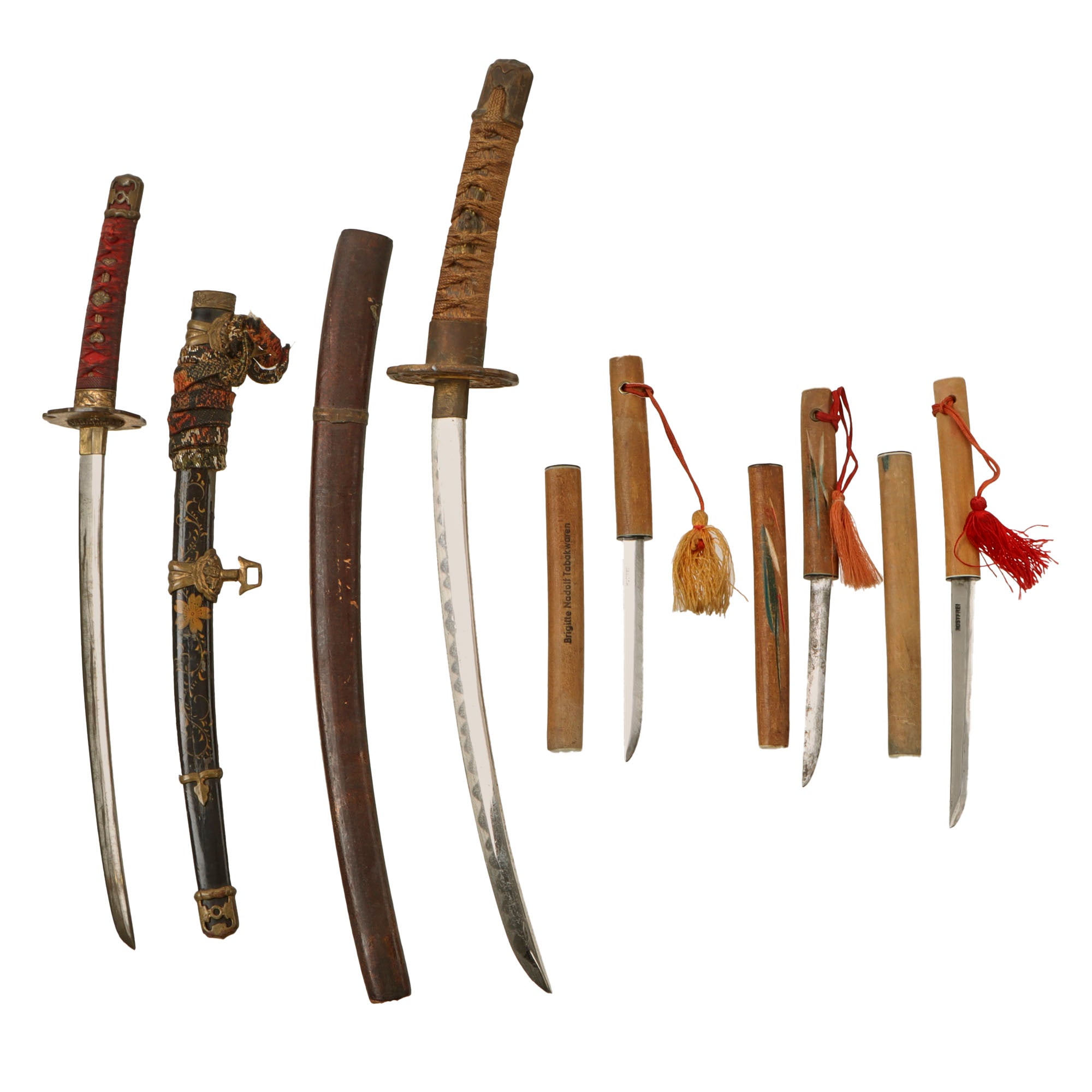 Original Items: Only One Set Available. Here we have a lovely set of WWII Era miniature replica Japanese swords, most likely made for export during and after the end of the war. It consists of two decorative Tachi replicas, along with three replica tanto short swords, all of which have German markings on them. These were made as souvenirs as well as advertisements, and we suspect that the two longer tachi replicas are also of European manufacture.