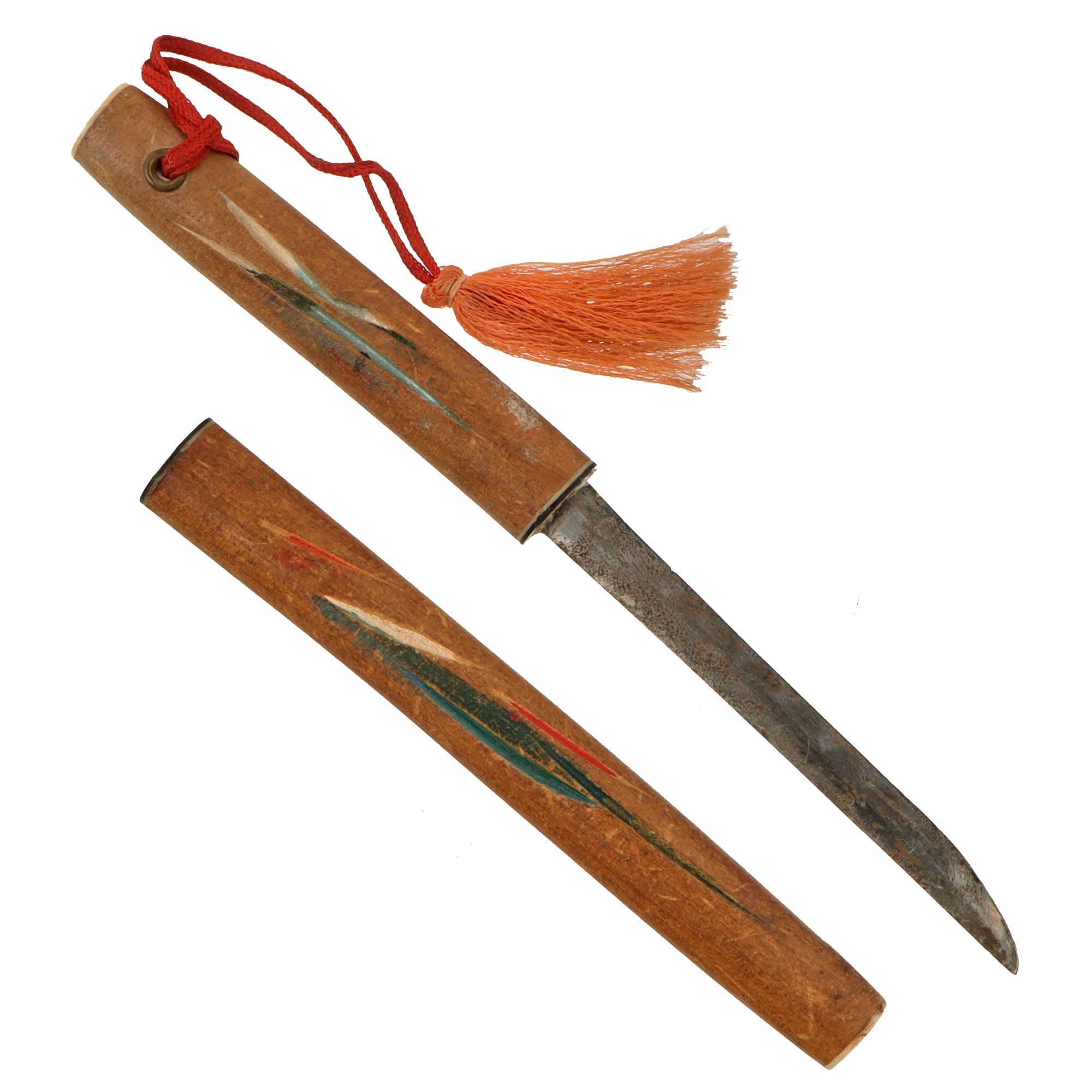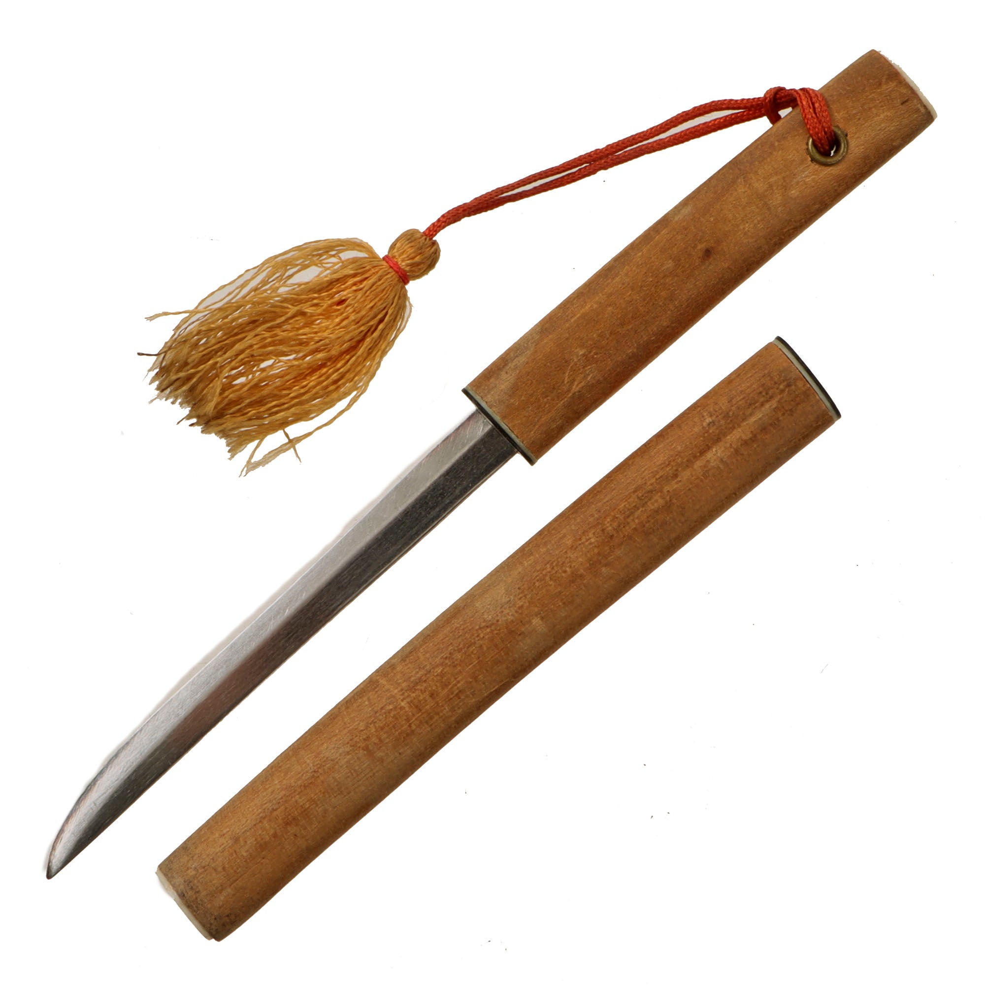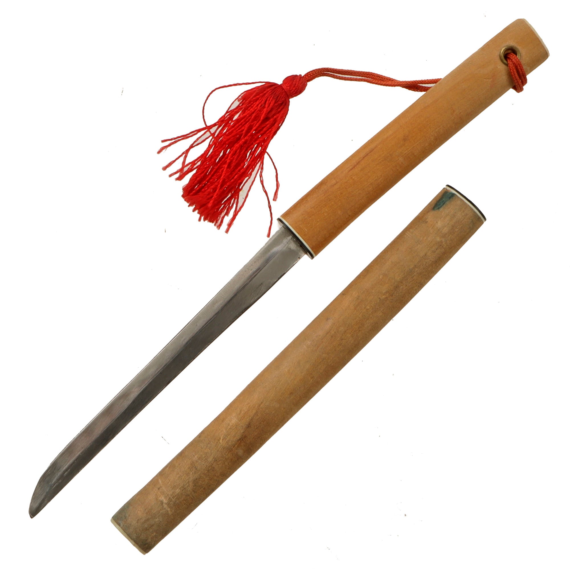 - a lovely miniature tanto short sword measuring 7 1/4 long in the scabbard, with a stainless steel blade marked ROSTFREI bearing a simulated temper line. There is a red tassel attached to the handle.