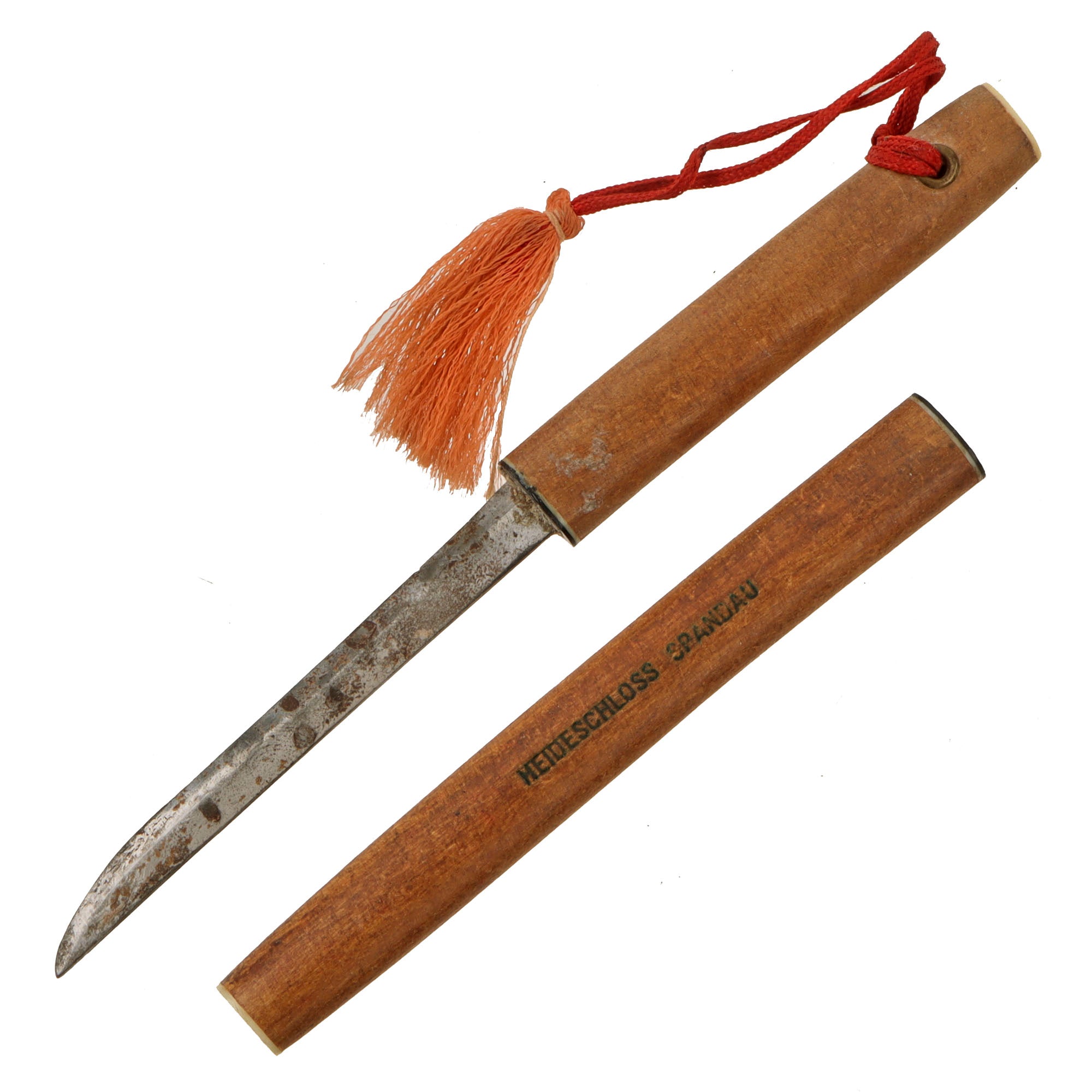 - a lovely miniature tanto short sword measuring 6 5/8 long in the scabbard, with a carbon steel blade bearing a simulated temper line. There is a red tassel attached to the handle, and it is marked HEIDESCHLOSS SPANDAU on the scabbard.