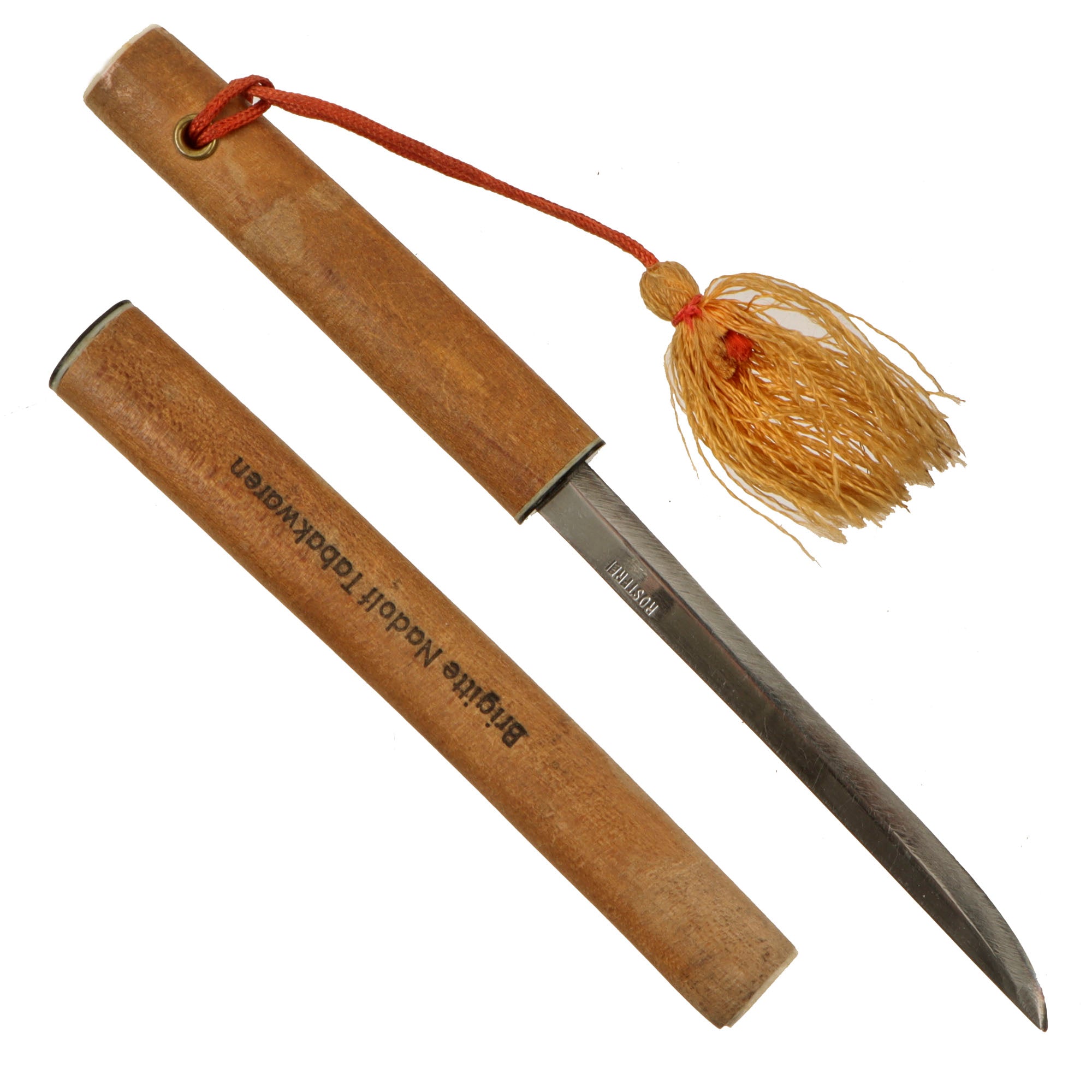 - a lovely miniature tanto short sword measuring 6 5/8 long in the scabbard, with a stainless steel blade marked ROSTFREI bearing a simulated temper line. There is a yellow tassel with a red cord attached to the handle, and the scabbard is marked with Brigitte Nadolf Tabakwaren (Brigitte Nadolf Tobacco Products).