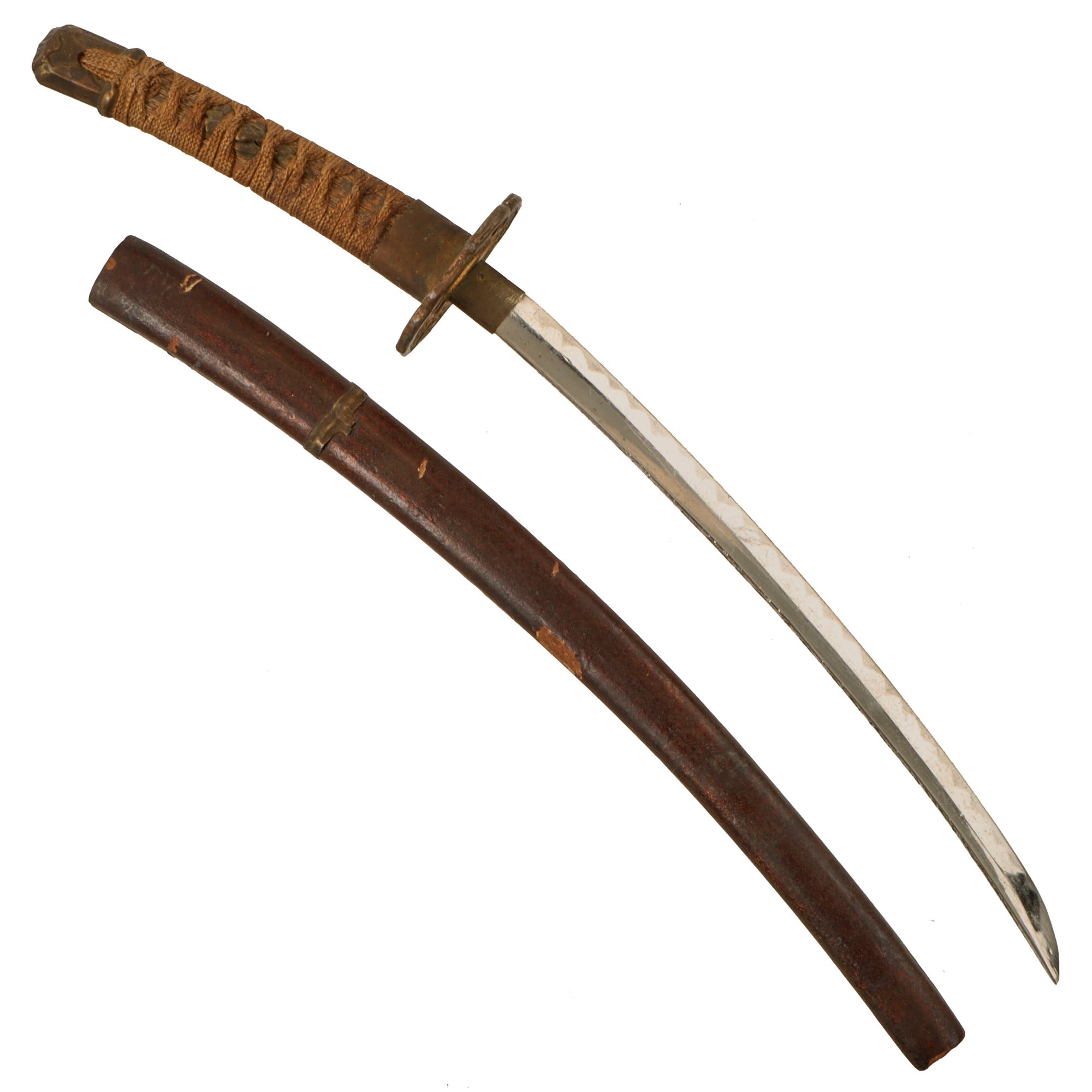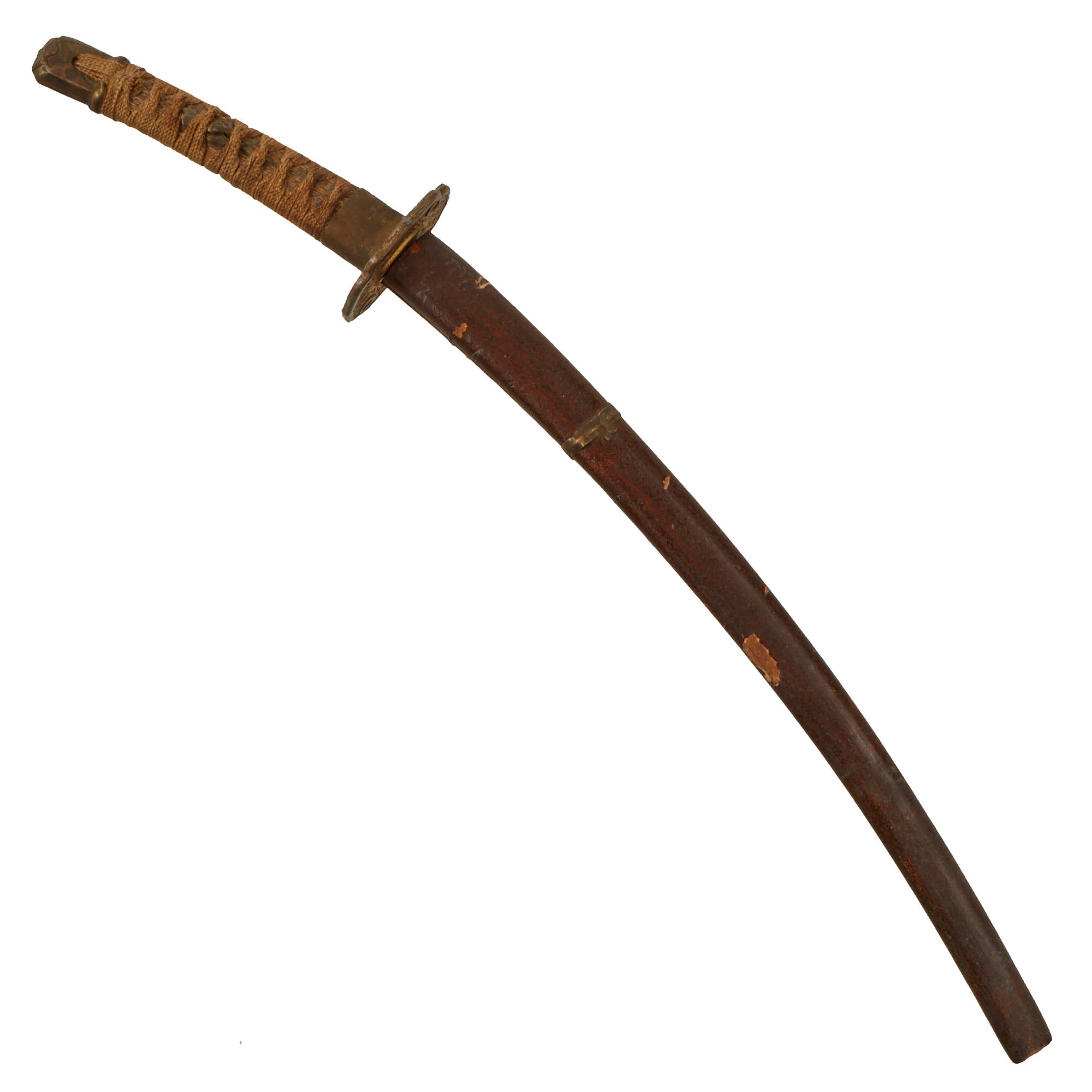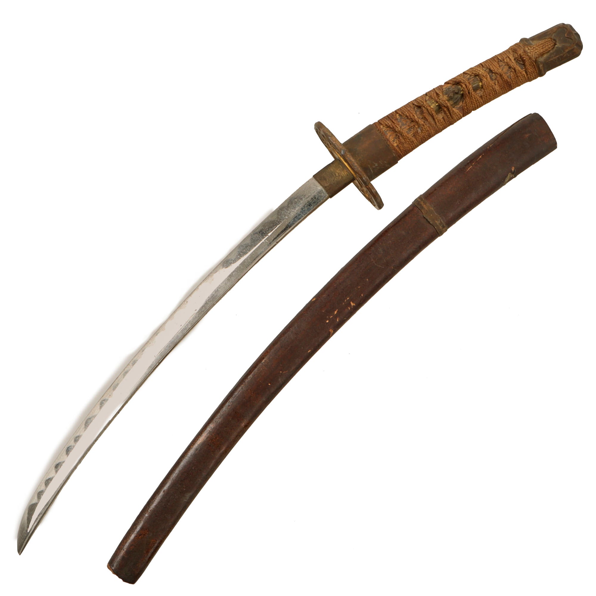 - a lovely miniature tachi in simple mounts, measuring about 15 inches long in the scabbard. It has a non magnetic alloy blade with plating and a faux hamon.