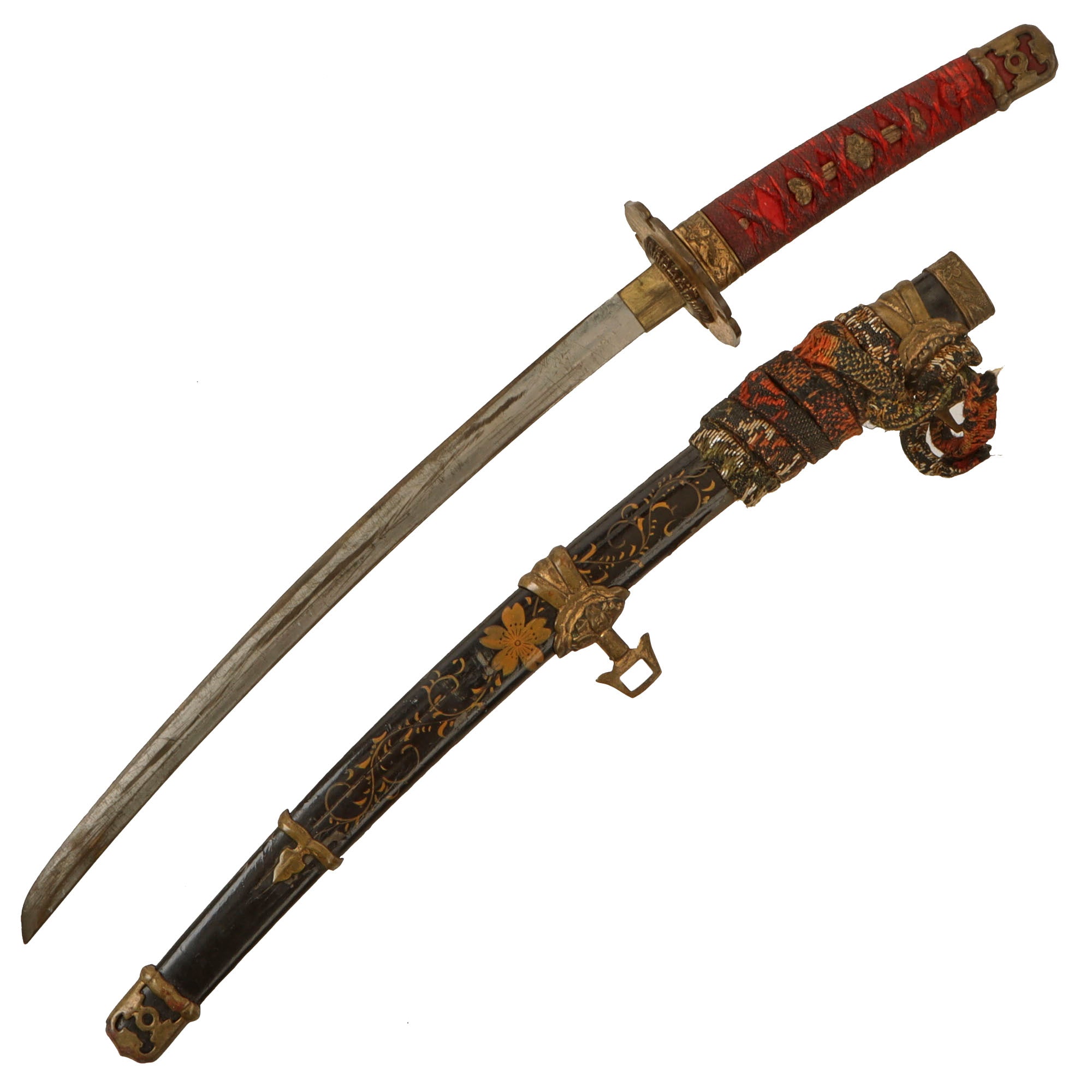 - a lovely miniature tachi in ornate mounts with a hanger cord, measuring about 12 5/8 inches long in the scabbard. It has a non magnetic nickel plated brass blade, which shows a good amount of use.