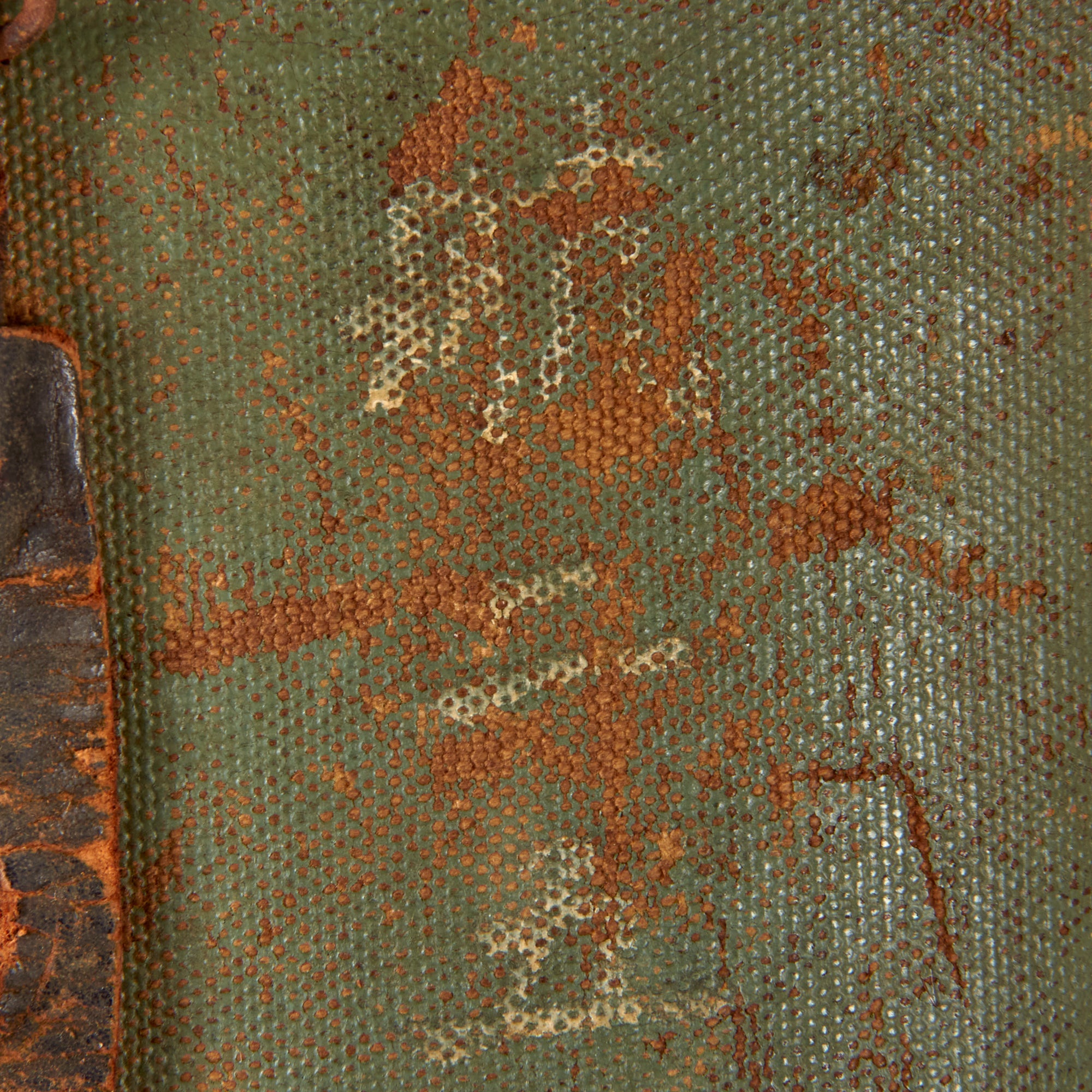 The case looks to be of hard pressed paper construction with a tropical canvas cover. Some components are leather reinforced, such as the hinge. The interior is lined with canvas, and does not really have any supports for the binoculars. The inside of the top cover has two cotton supports for sun filters, but both are missing. The closure system is partially broken but still present. The case retains its canvas carrying strap as well as the woven canvas belt loop. There is some Kanji writing on the exterior and under the lid.