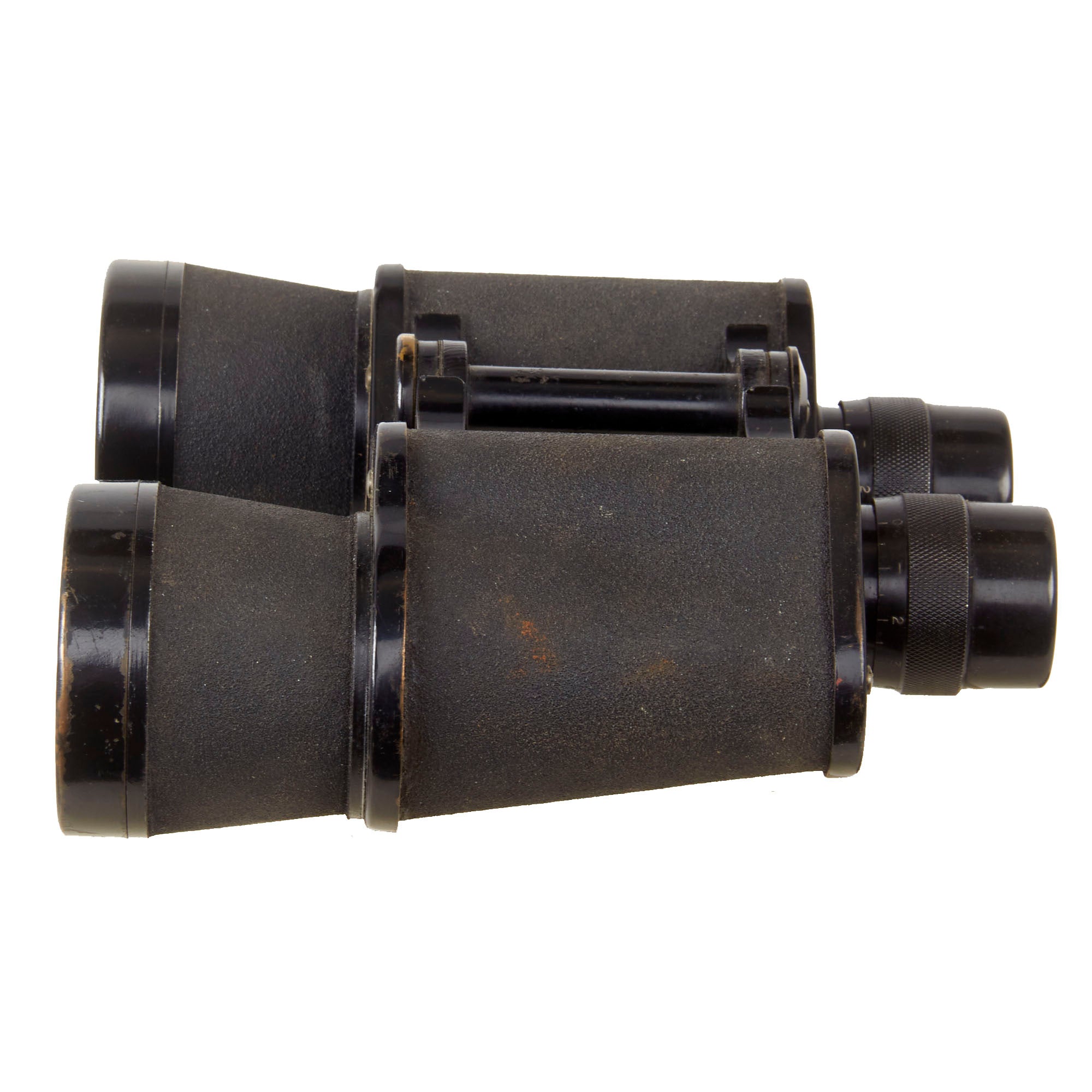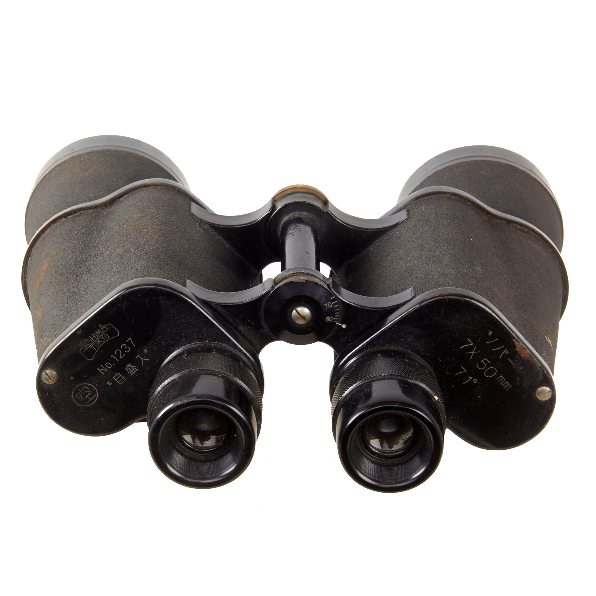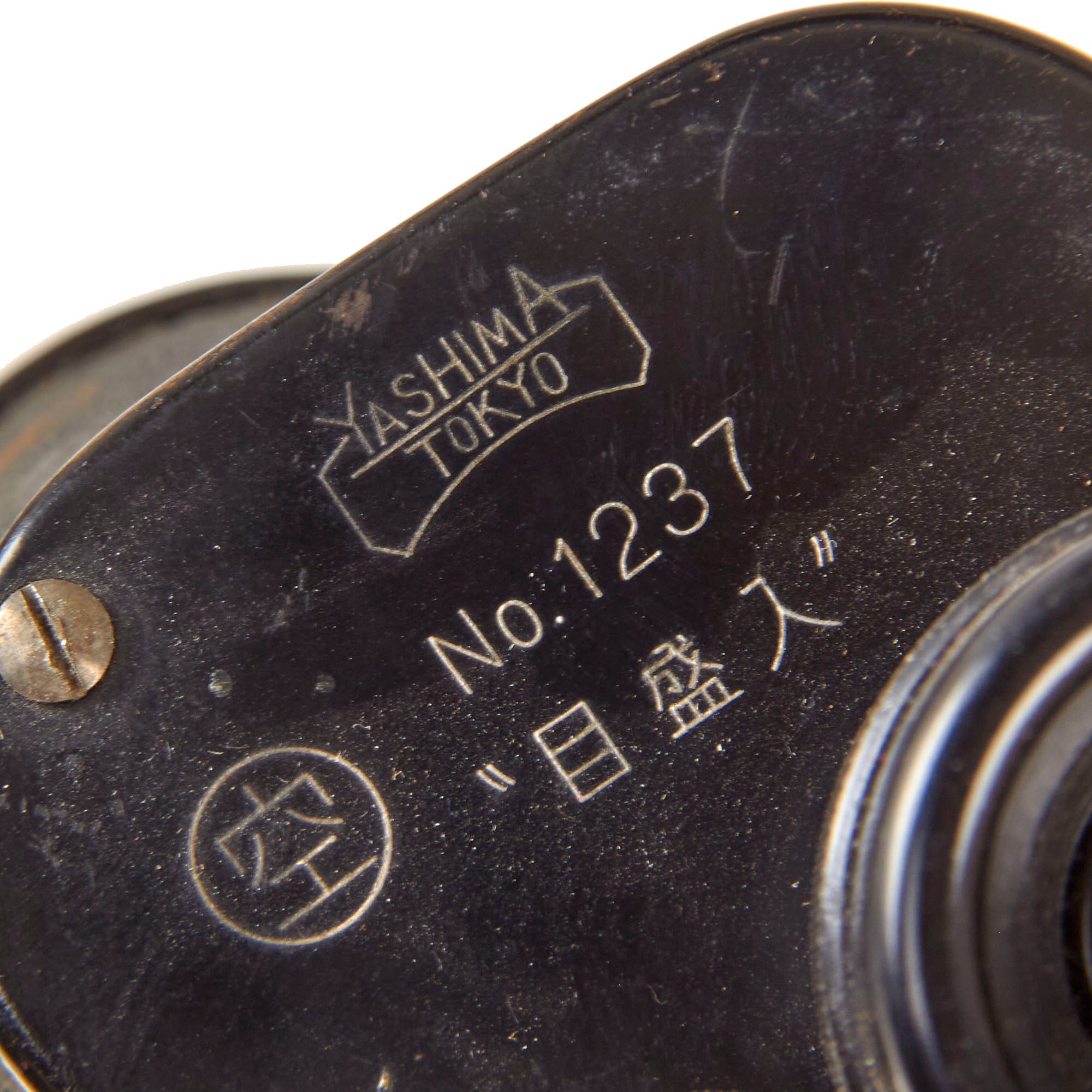 The binoculars are marked YASHIMA / TOKYO on the back of the left barrel, a known manufacture of binoculars during the WWII Period. Post war, this company would return as a camera manufacturer, and eventually became Yashica. It’s also marked with the Serial Number No. 1237 and some Kanji. The right barrel is marked with the specifications of the binoculars: 7X 50 mm / 7.1°.