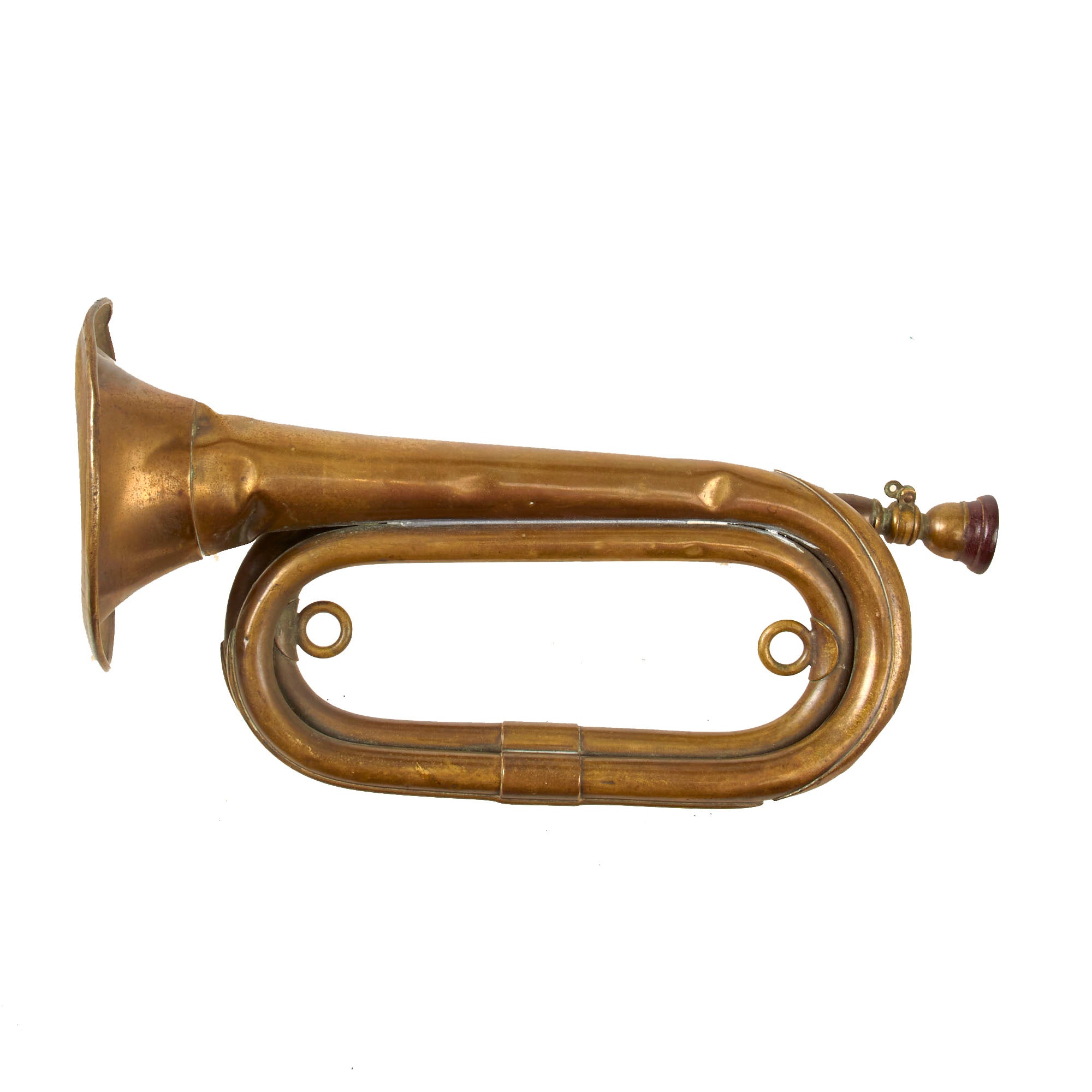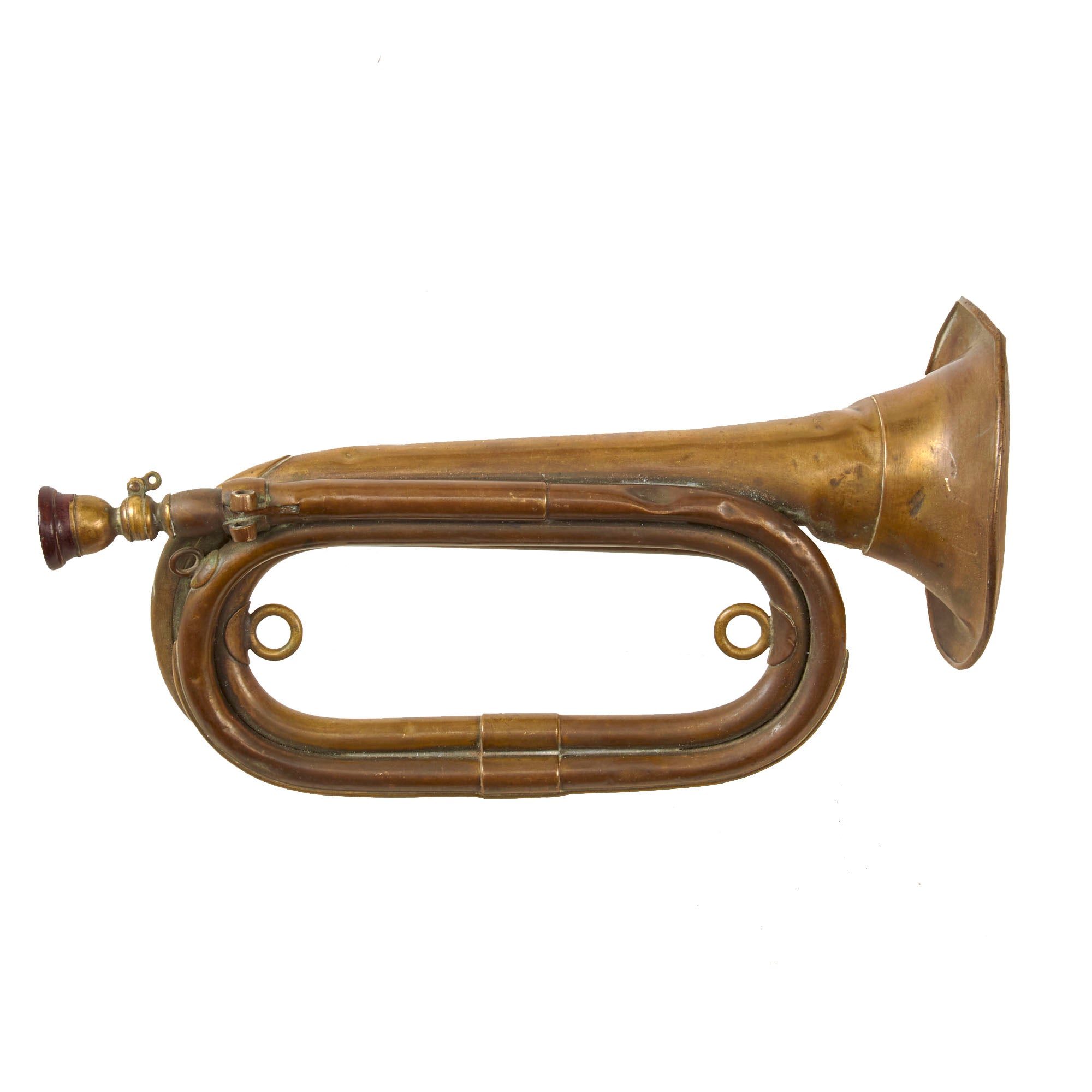 The branch of the military would normally be identified by a sash with tassels attached to the bugle by the two large inner rings, red for Army as an example. Further identifying this as a WWII period piece, as opposed to modern day, is the lack of a condensation valve on the front edge.