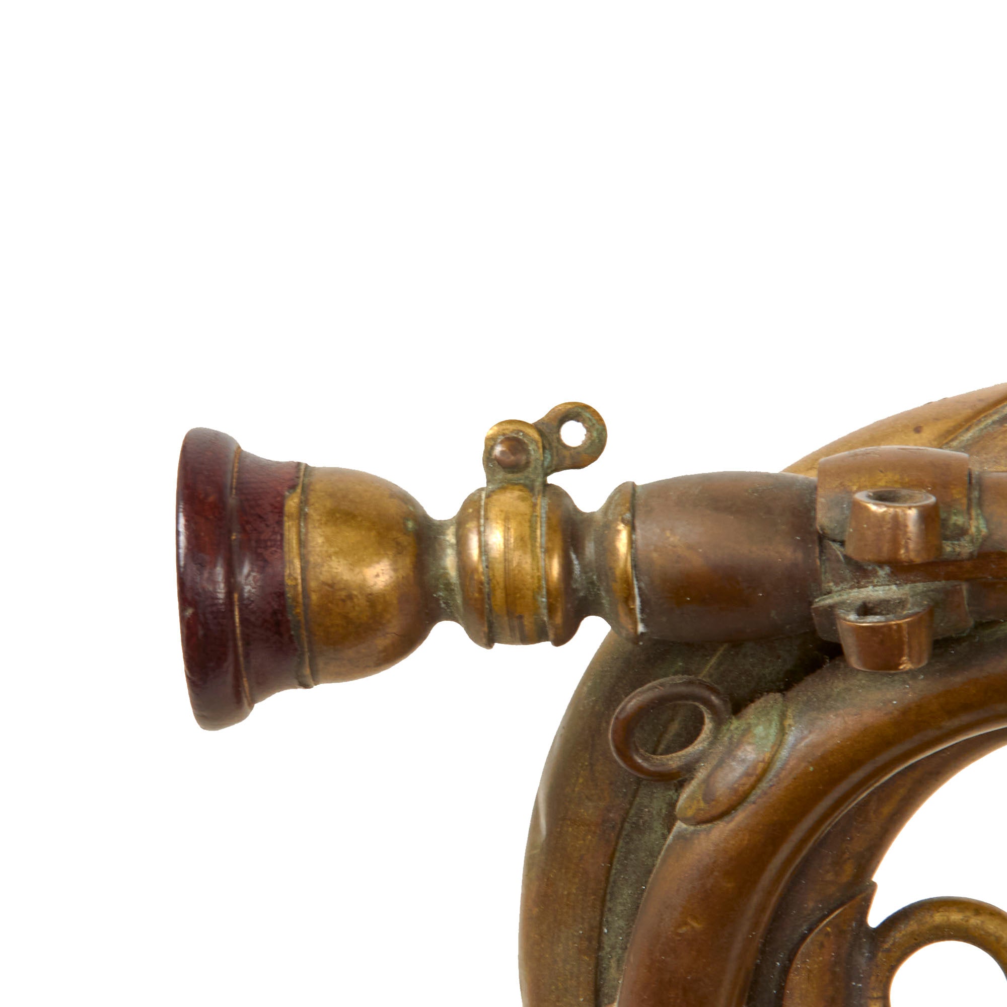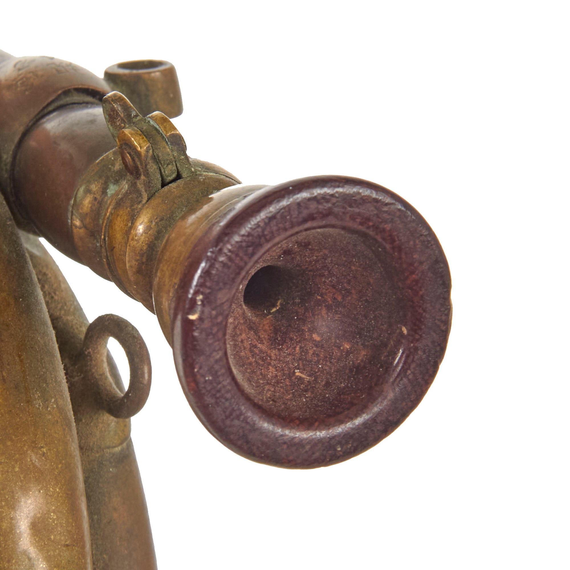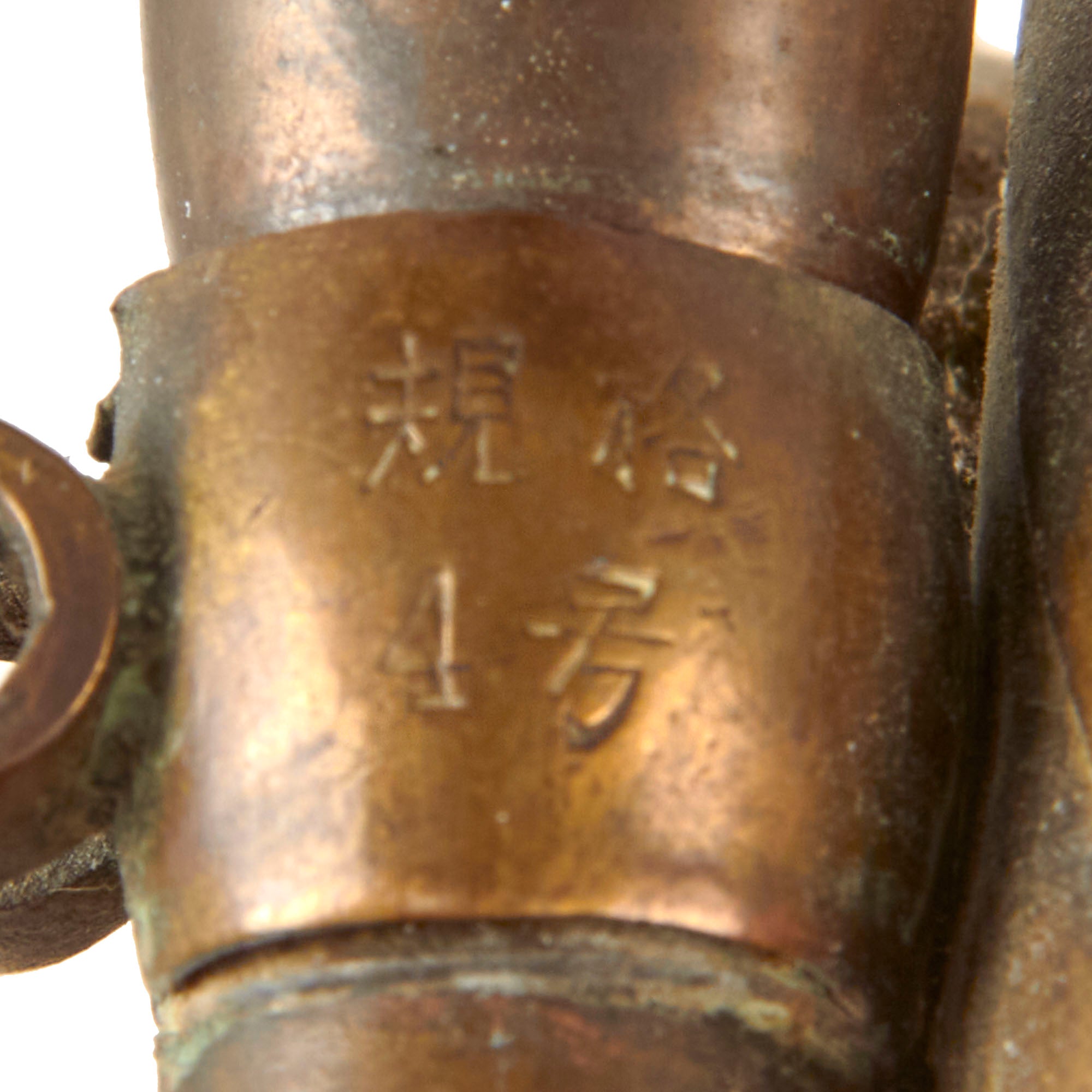 The bugle features nearly all-brass construction, with a two piece brazed bell with a bell garland. The mouthpiece appears to be brass with a bakelite cup as often seen on these, and has very small Kanji characters on the mouthpiece. The chain securing the mouthpiece to the bugle is gone ,but there are some markings retained on the housing. A very rare piece from the Empire of the Rising Sun.