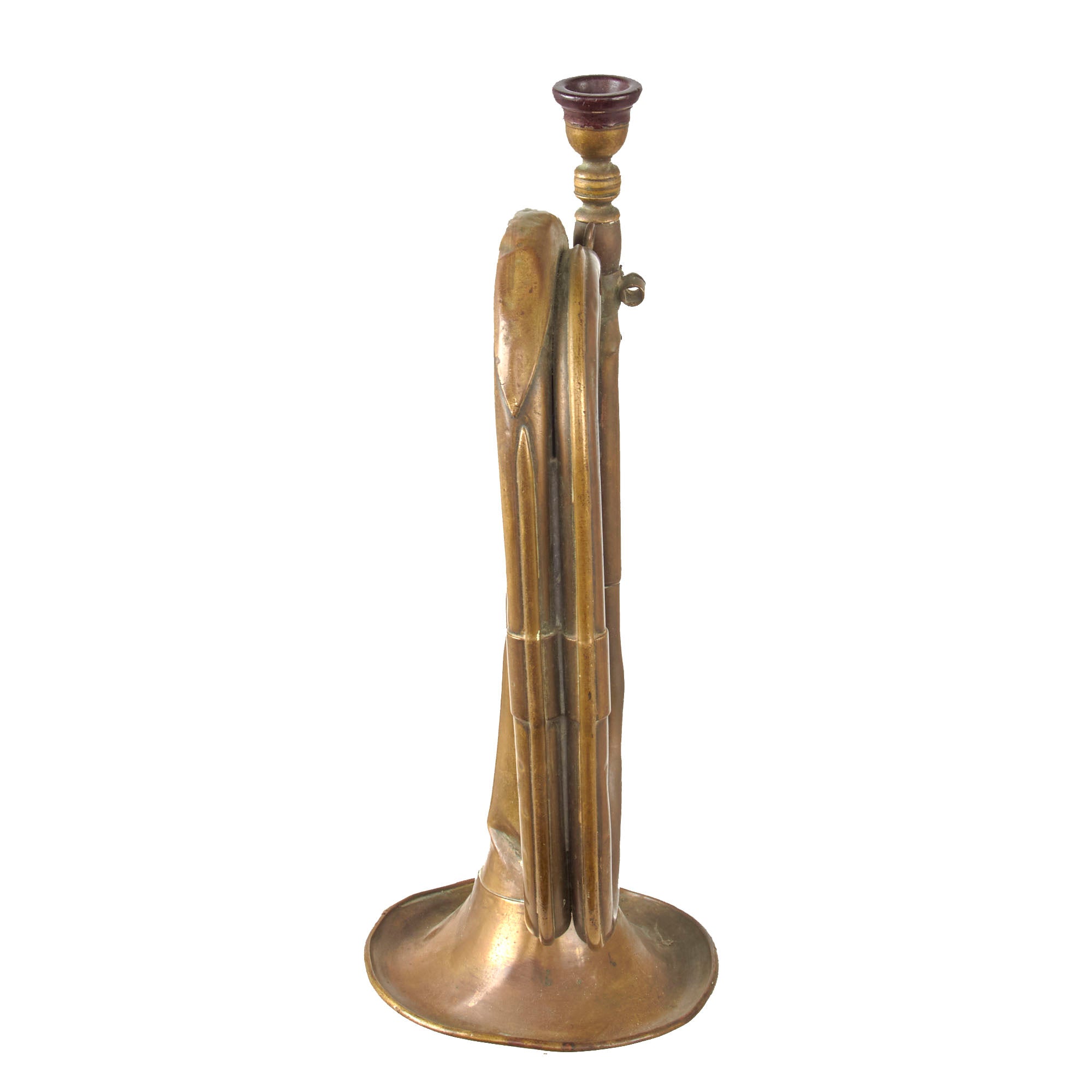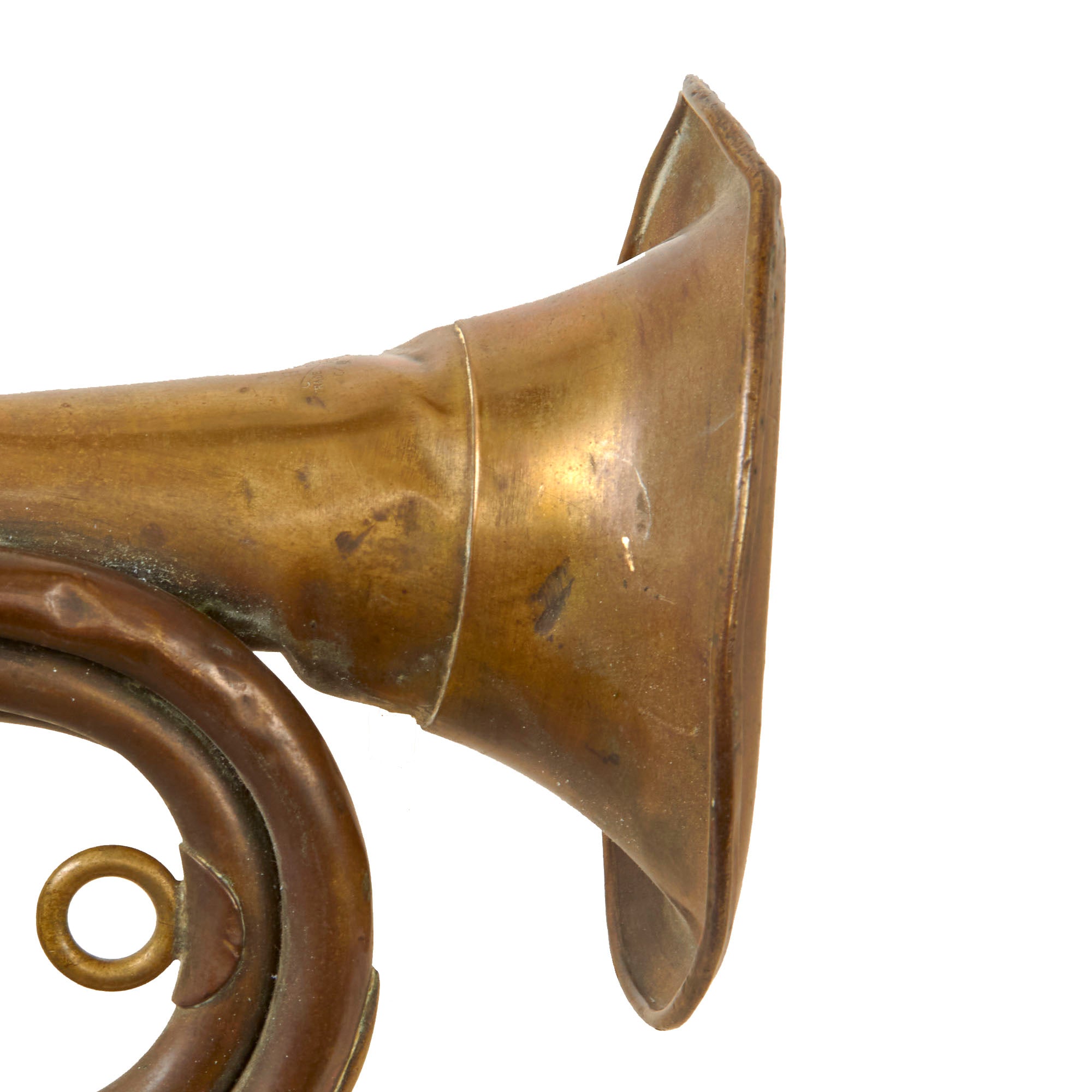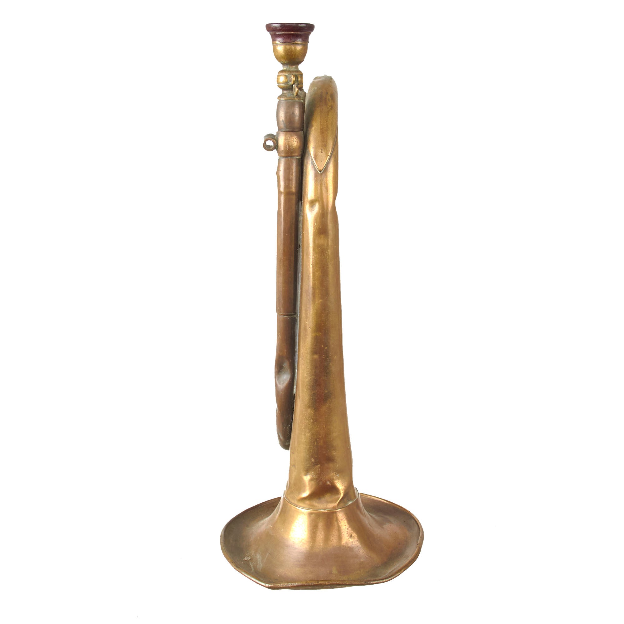 Original Item: Only One Available. This is a genuine Japanese Military Bugle from the WWII period. You can identify it as such by the style of the bugle, the Japanese-marked bakelite mouthpiece, and the large clamp that secures the tuning slide/lead pipe into the instrument. Bugle is in overall good condition and playable but does have some dings and dents. There is a maker mark on the bell. The bell is heavily dented and worn.