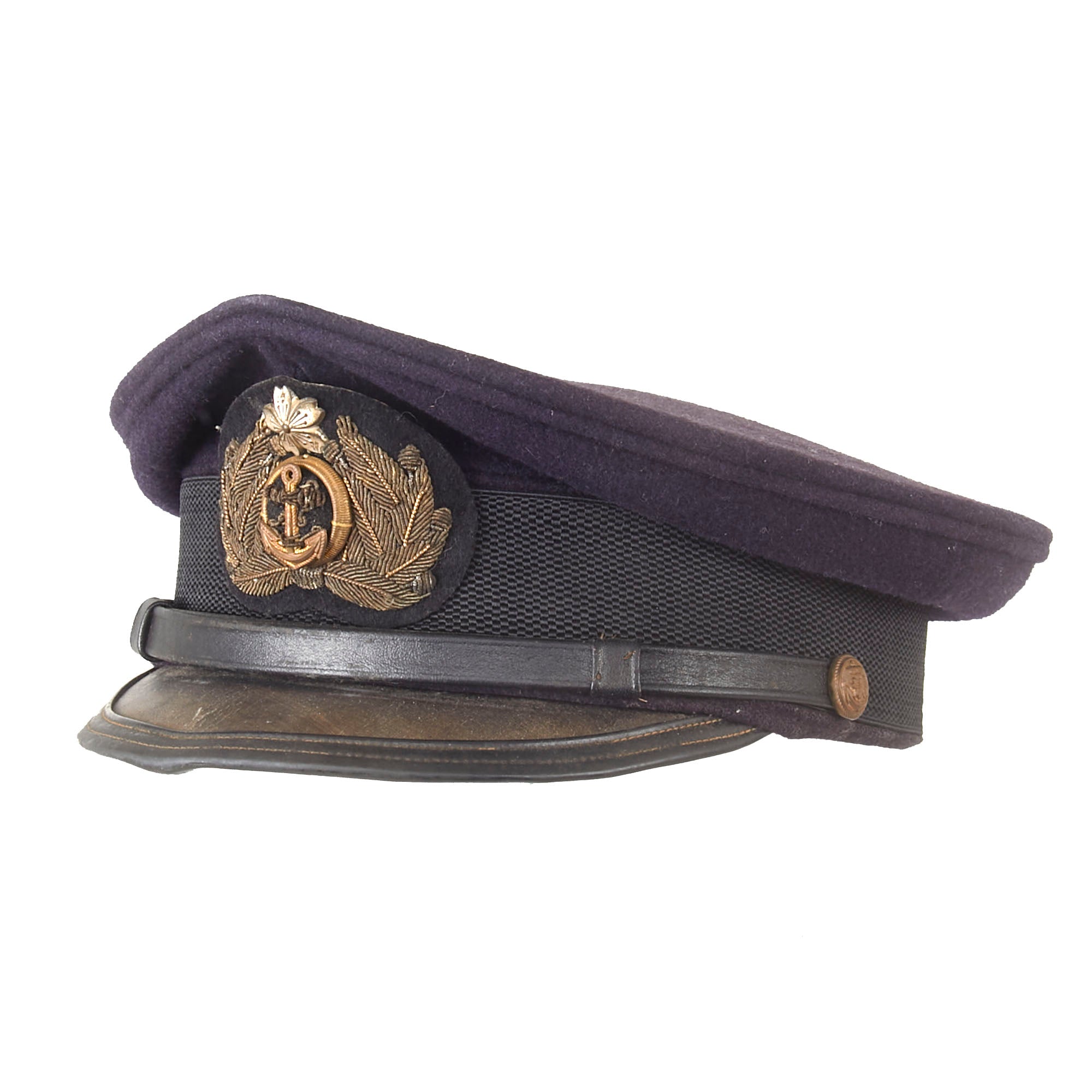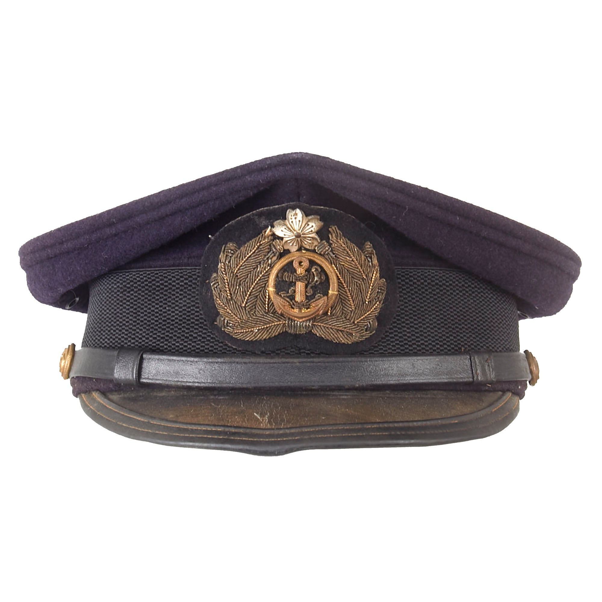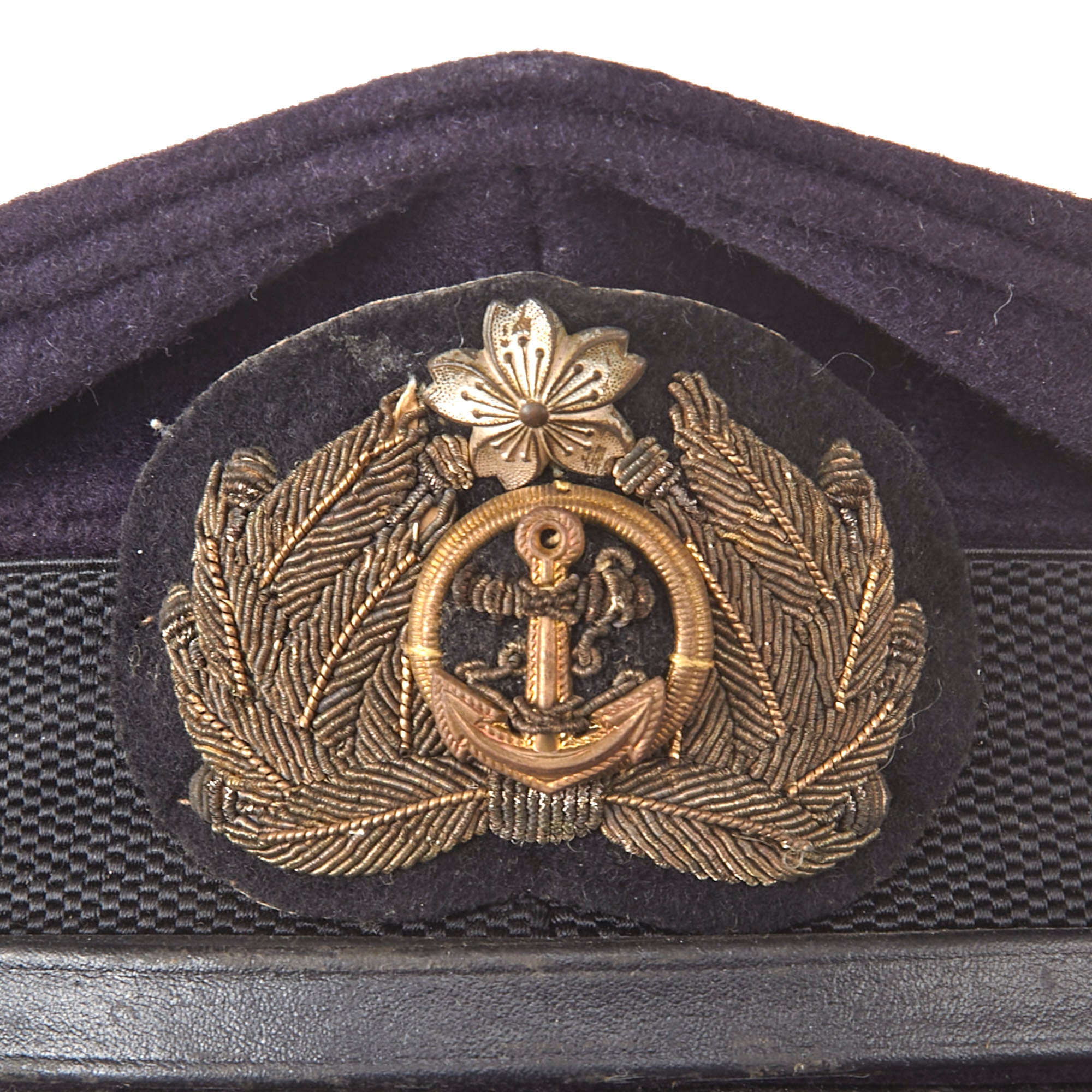 Original Item: Only One Available. This is an excellent condition Japanese Naval Junior Officer's Visor hat. It has a body of dark blue wool with a black ribbed cotton cap band, and currently has a white cover installed on the top, which can be removed.. Center of cap features a bullion wire-embroidered Japanese Naval Anchor insignia surrounded by Laurel leaves and a "Cherry Blossom" above the anchor, so this is for a front line officer, and not a reserve officer, who would have a "nautical star" instead.