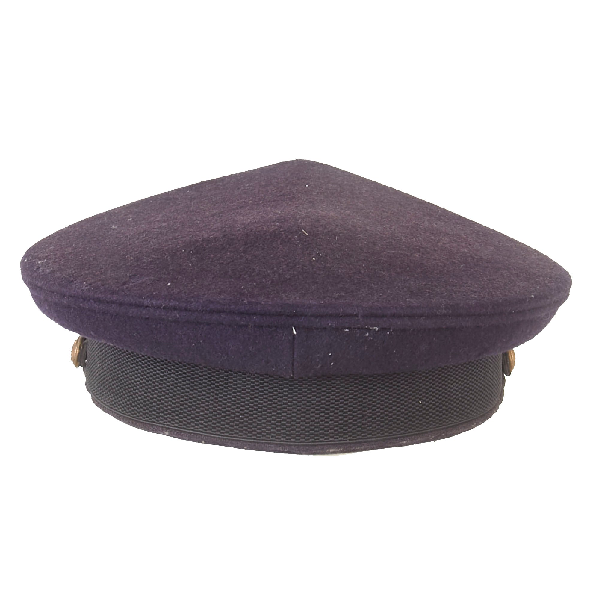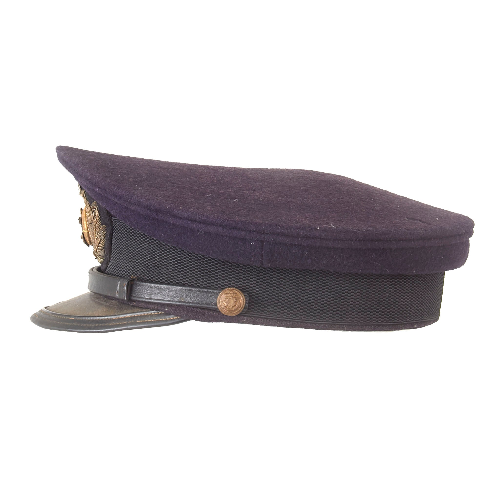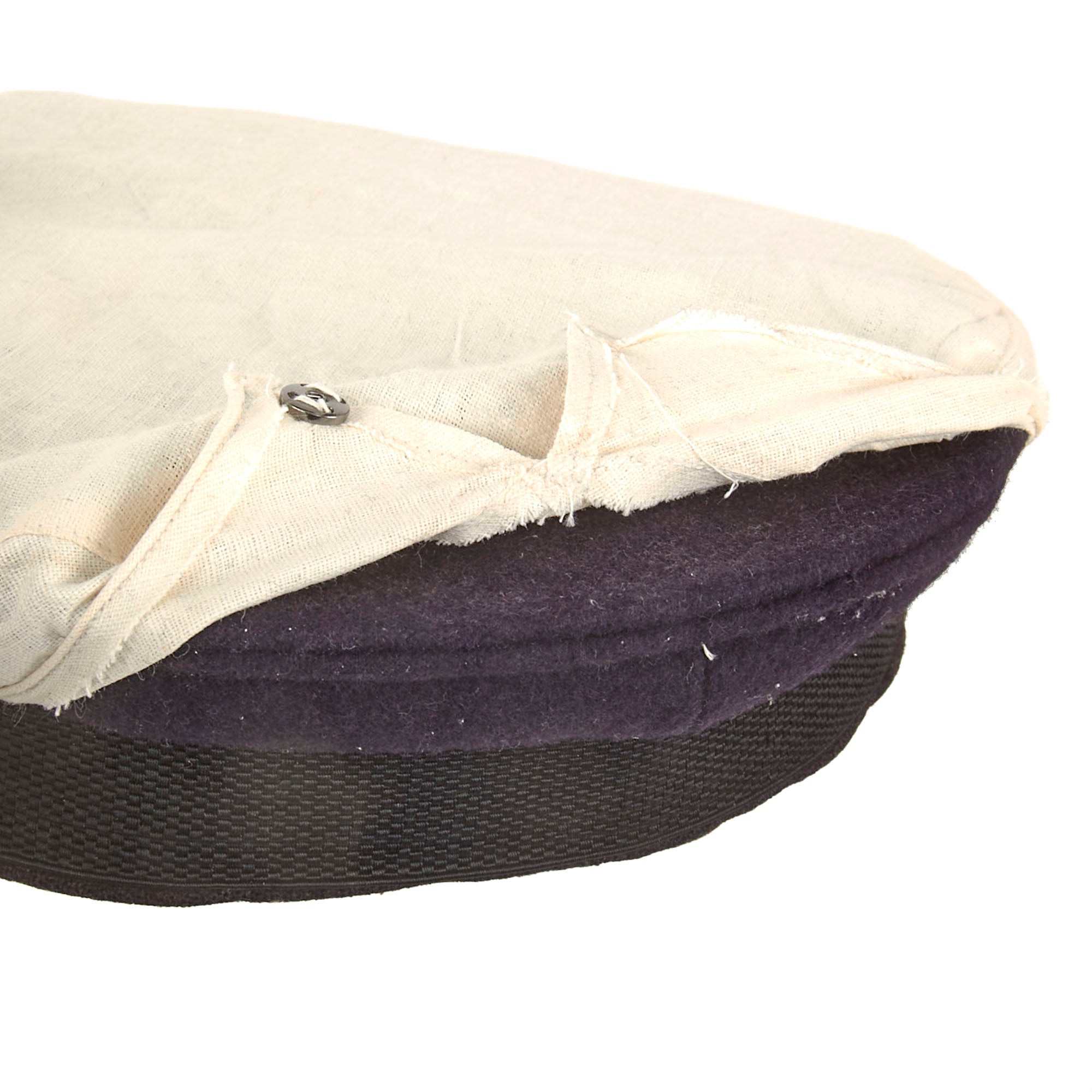 Original Item: Only One Available. This is an excellent condition Japanese Naval Junior Officer's Visor hat. It has a body of dark blue wool with a black ribbed cotton cap band, and currently has a white cover installed on the top, which can be removed.. Center of cap features a bullion wire-embroidered Japanese Naval Anchor insignia surrounded by Laurel leaves and a "Cherry Blossom" above the anchor, so this is for a front line officer, and not a reserve officer, who would have a "nautical star" instead.