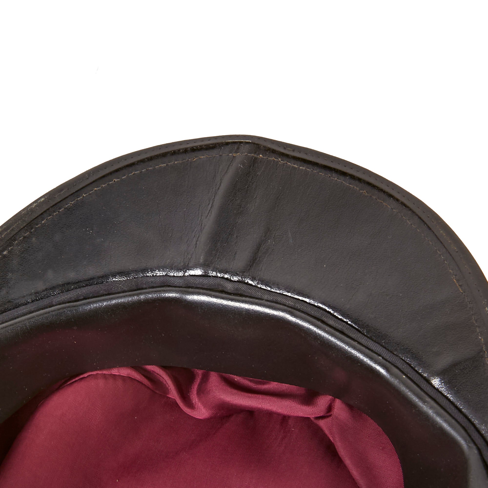 The interior is lined in purple/maroon rayon cloth (typically missing), with the cheesecloth reinforcement underneath. The sweatband is made of leather and lacquered in black, and appears entirely new, but this could just be because of it being in the case. It’s marked with 57cm for the size. The sweatband could be a later replacement, but we can’t say for certain.