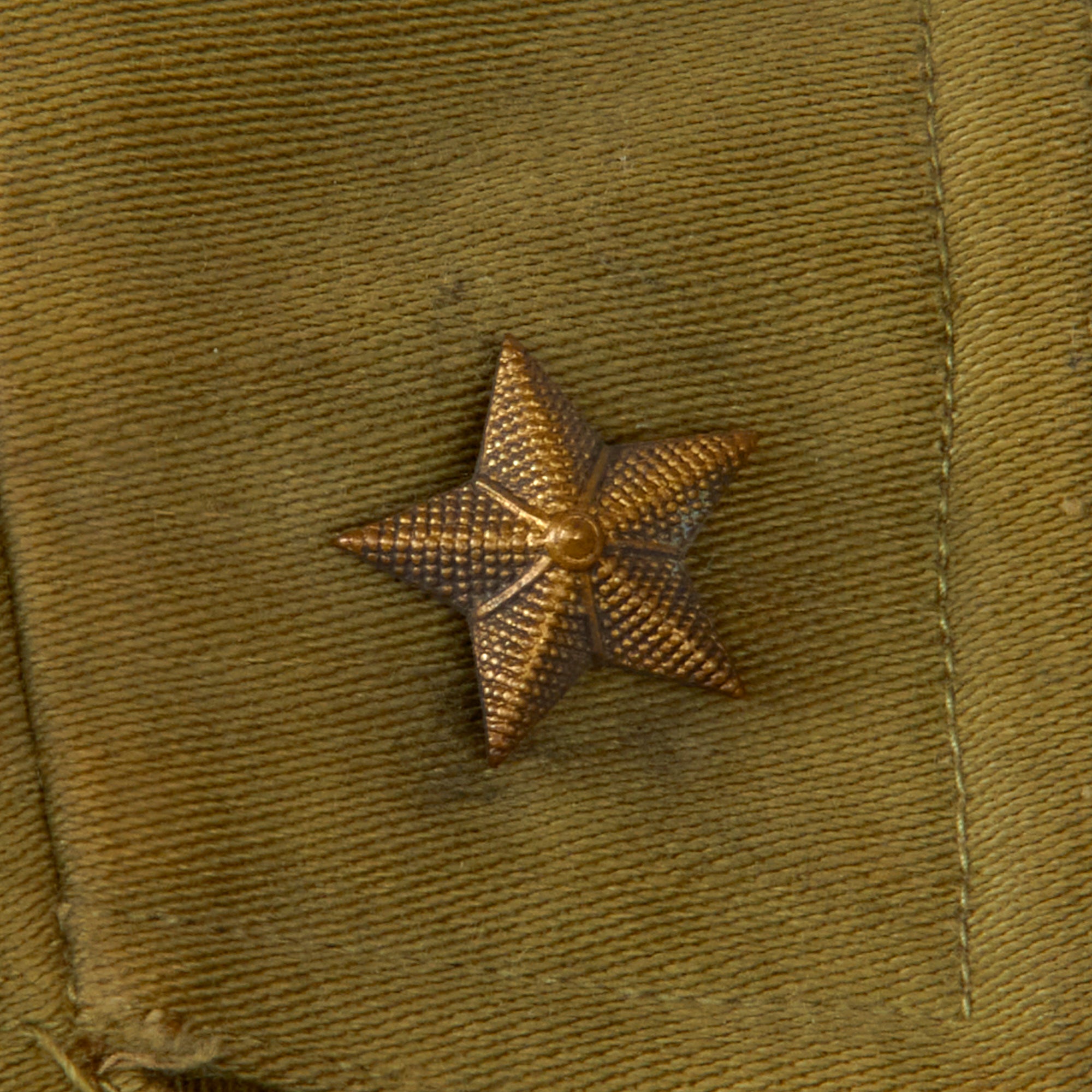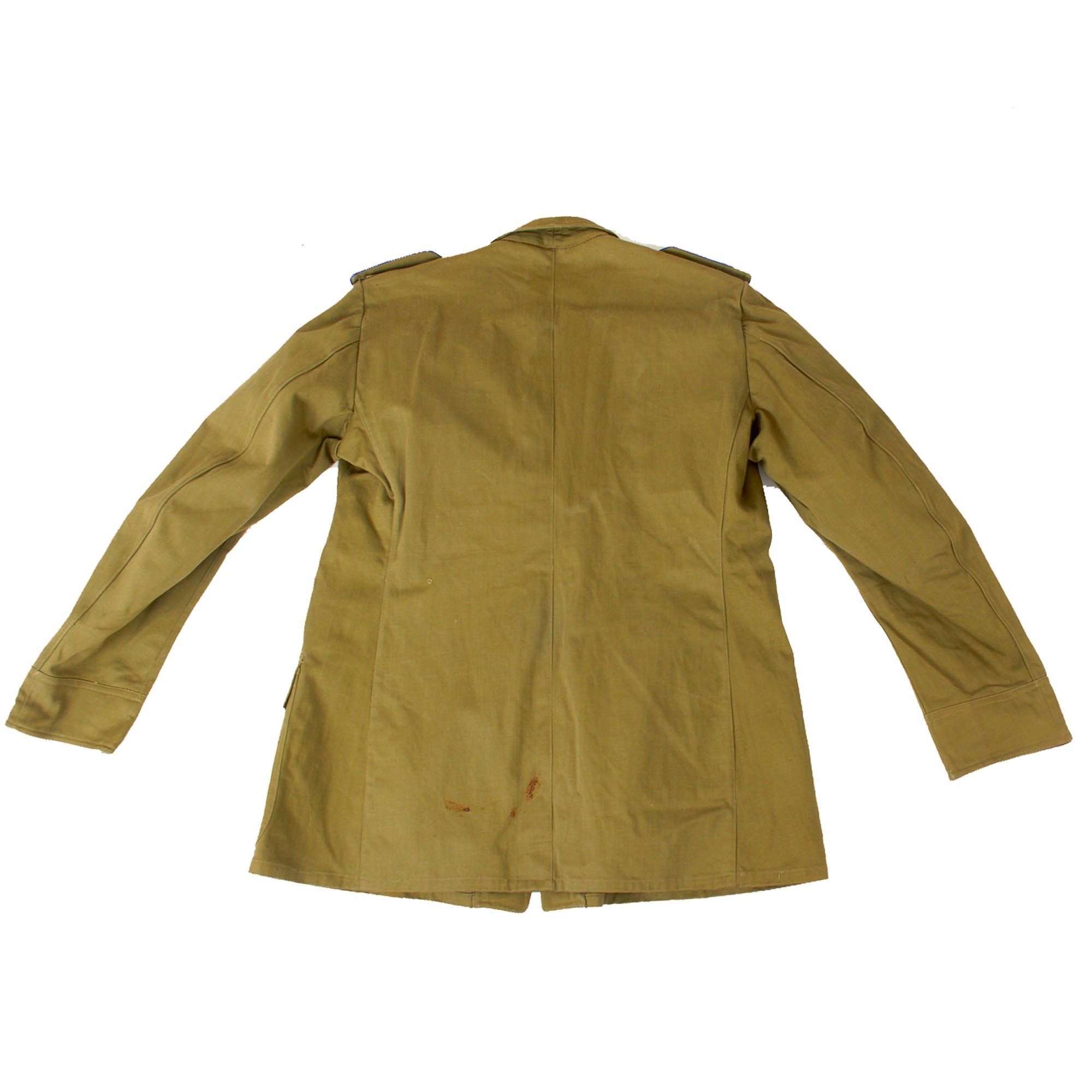 The jacket has two stars on the collar denoting that the wearer is not part of a specific regiment. There are no markings on the jacket we could find, but it retains all buttons and the shoulder boards are the slip-on variety but they appear to have been sewn-in as well. There is little damage across the jacket.