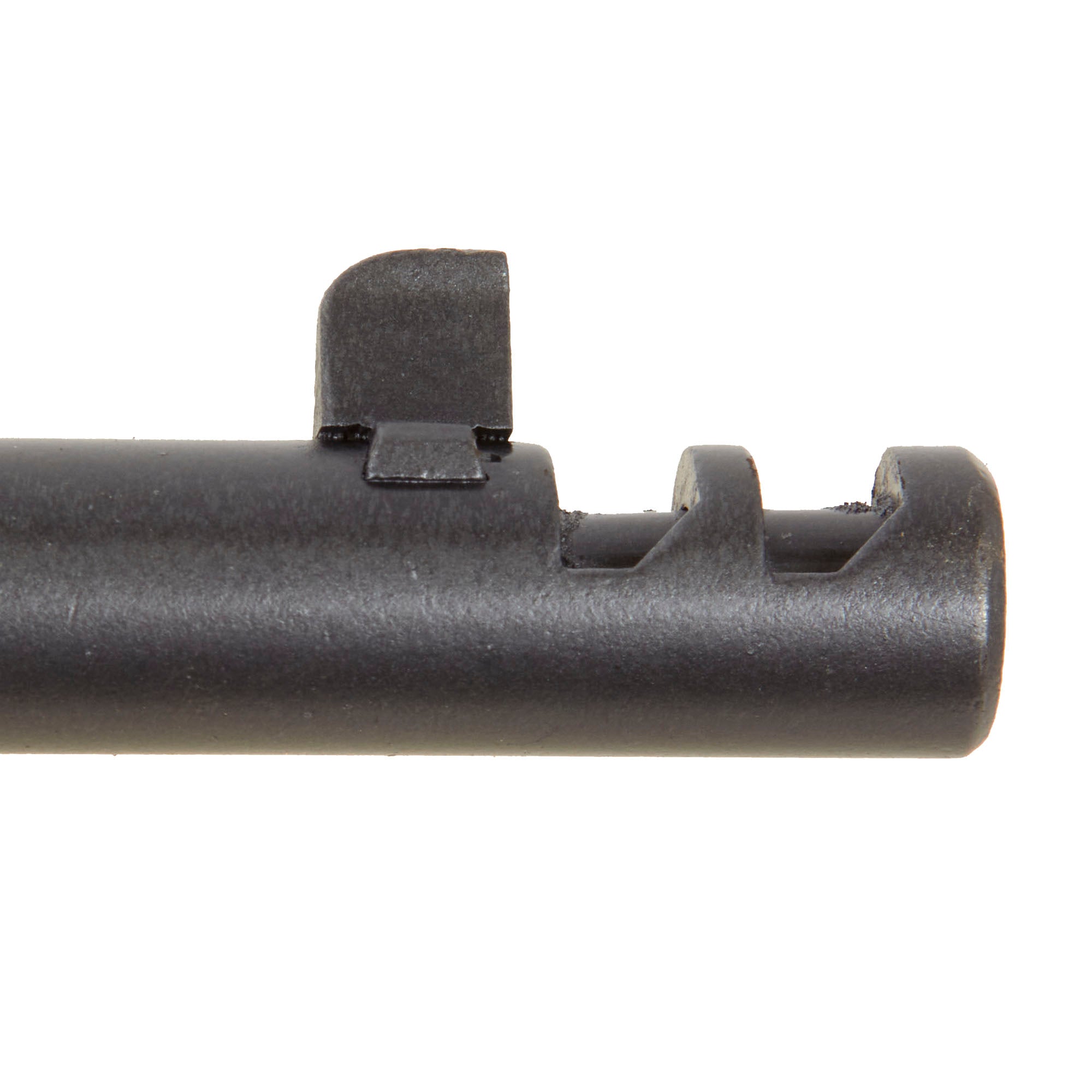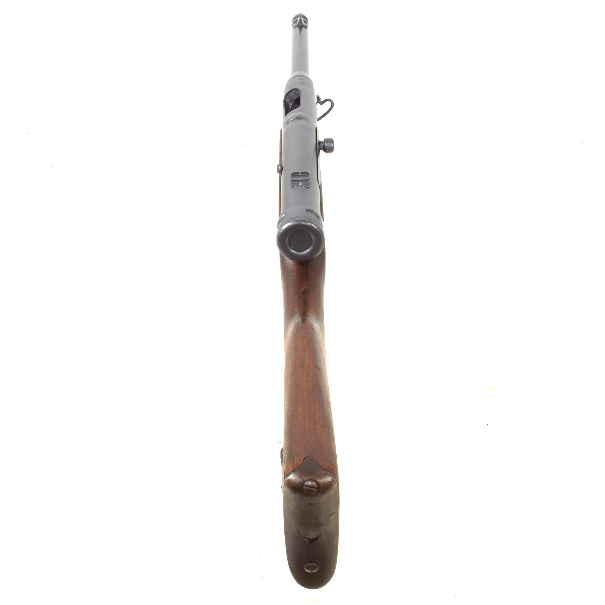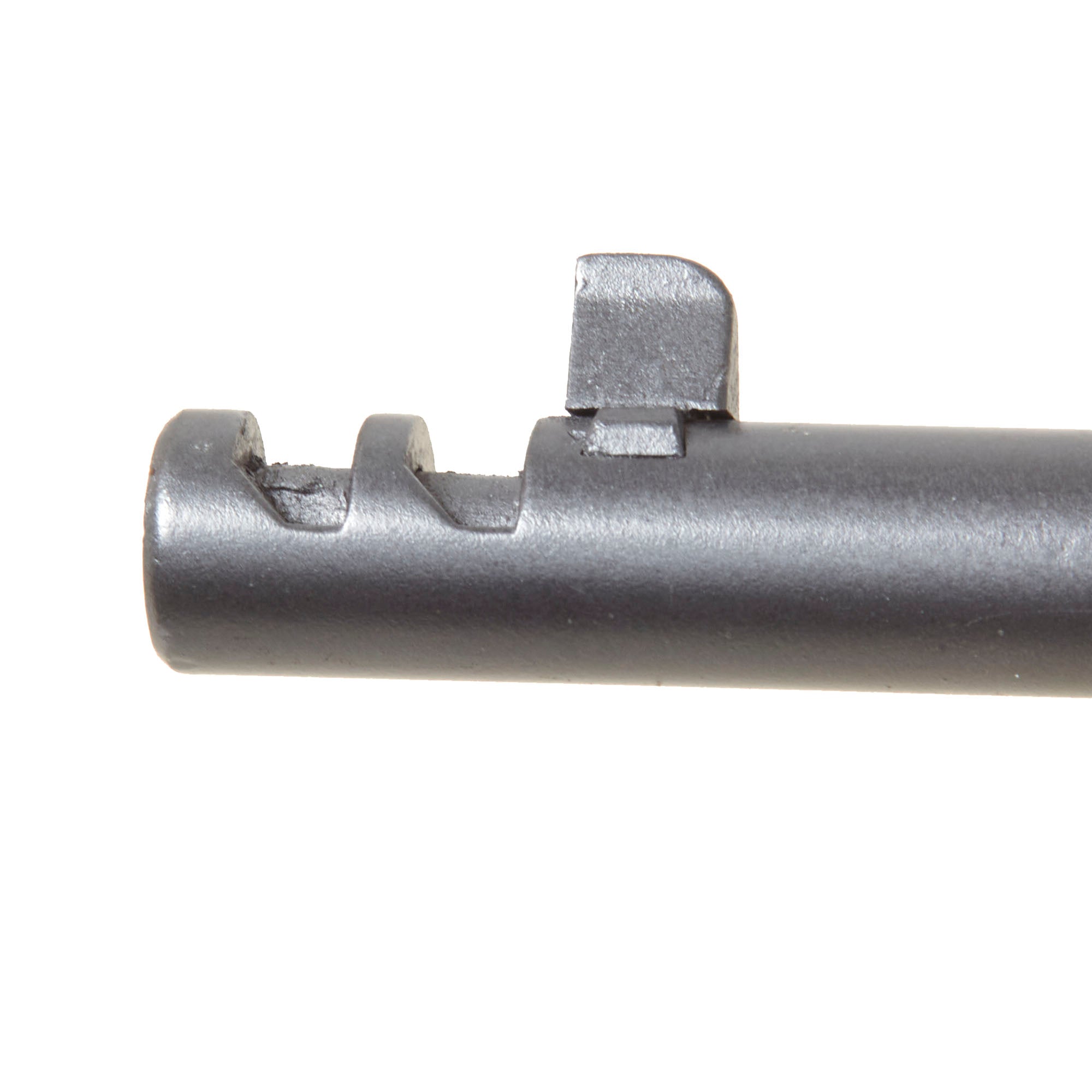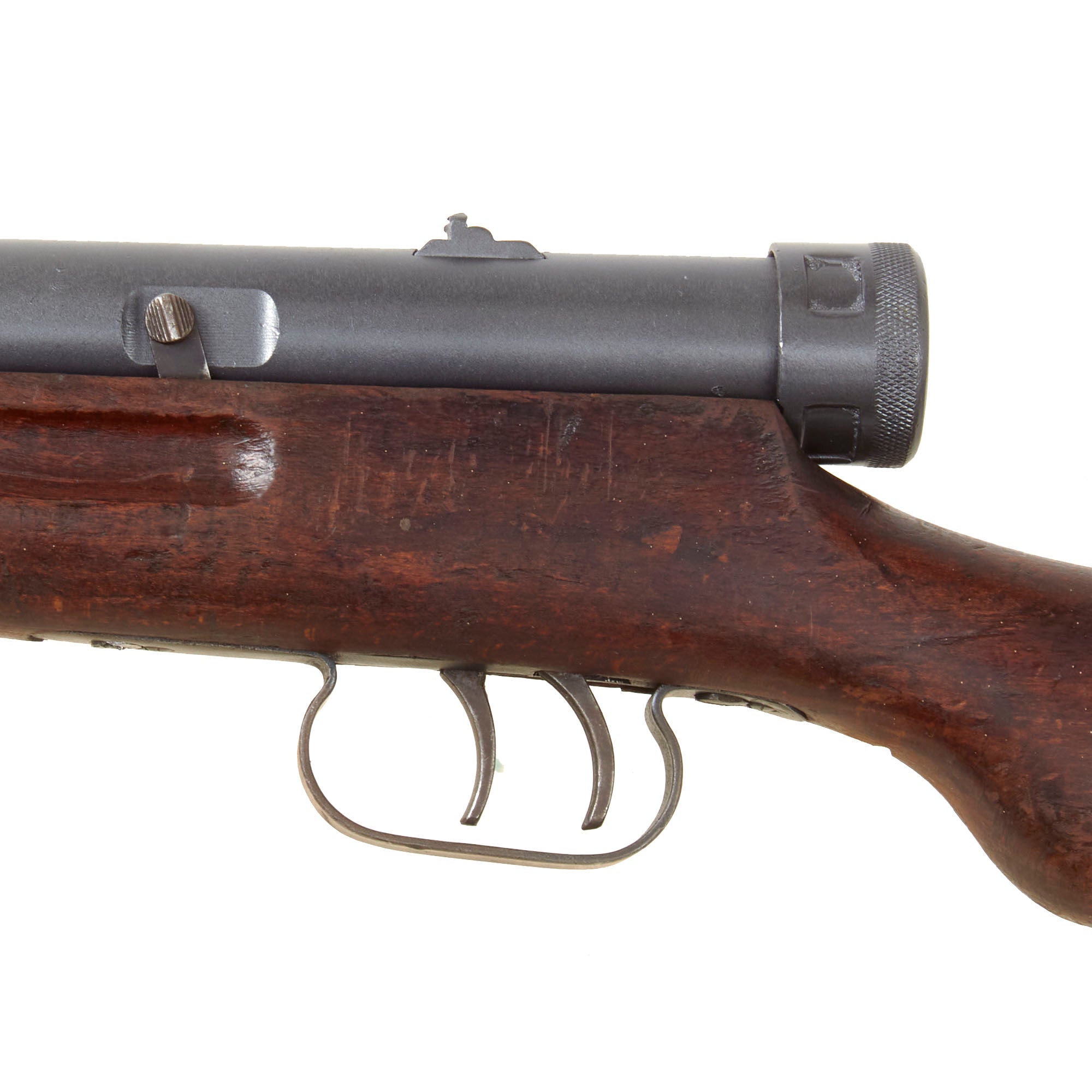 This example is in lovely condition, and has been repainted with our great "gunmetal gray" spray paint, giving it a great look. It has an intact front sling swivel on a rotating base loop, which are often missing, though the loop on this is seized. The barrel is still live, with an intact chamber, however the wooden plug in the front prevents us from seeing the condition of the bore. Both the front and rear trigger are still present and move correctly, and the safety on the left side is also functional as well. The cocking handle and cover on the right side are original, attached to the outside of the solid aluminum portion of the receiver. The stock is in very good condition, showing wear from service but no major damage or cracks.