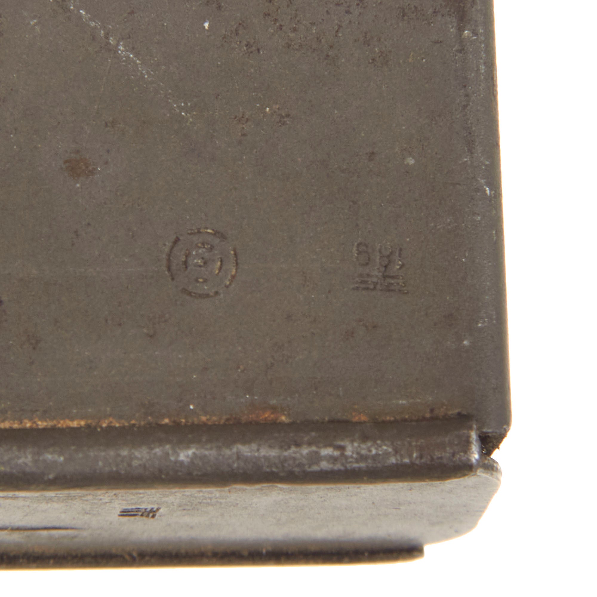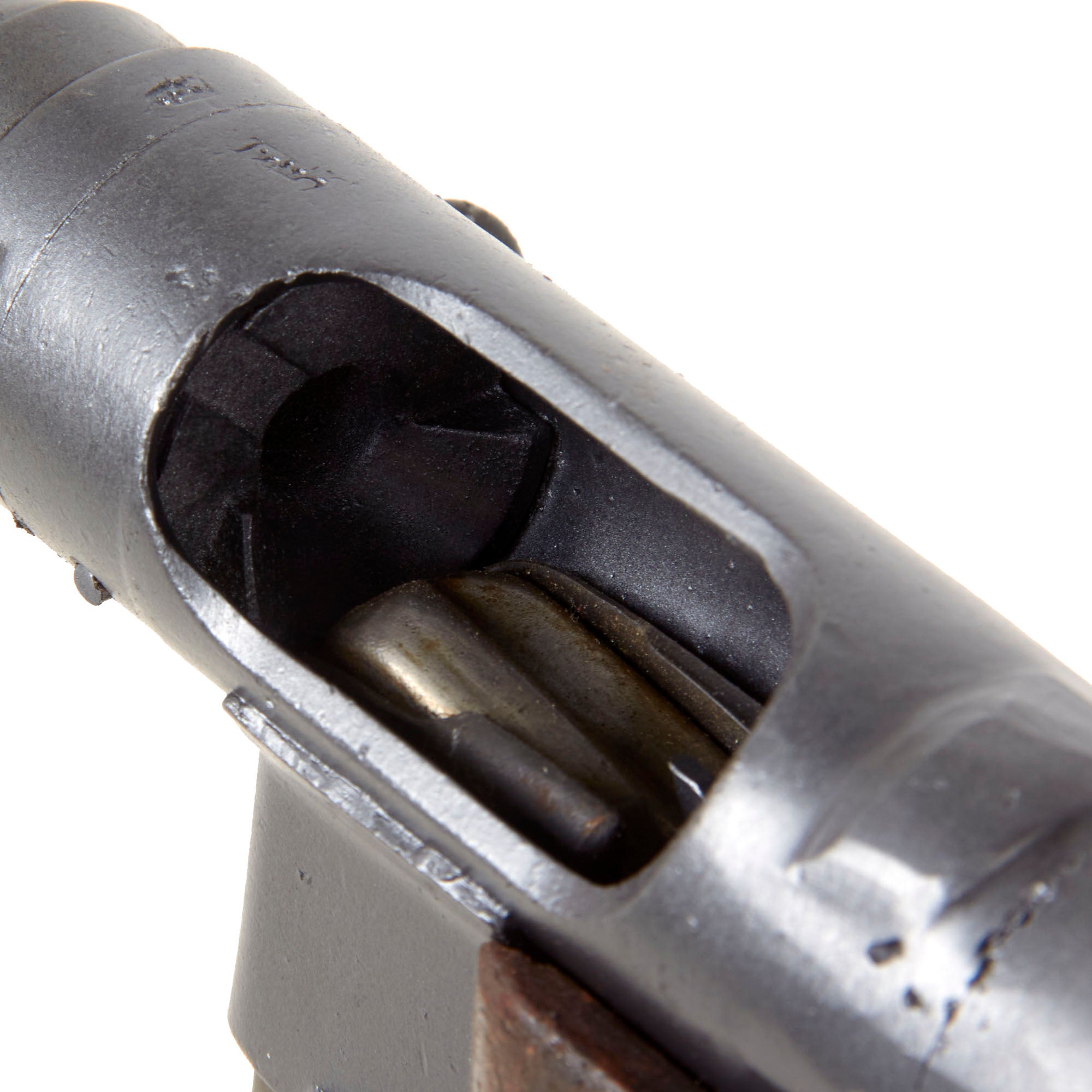 This example comes complete with a display magazine, which was adapted from a German MP34 by Steyr. It is not the correct magazine for this gun, and has had the back modified with the original locking tab pushed in, and another ground above it. Please note that the magazine will be deactivated where required.