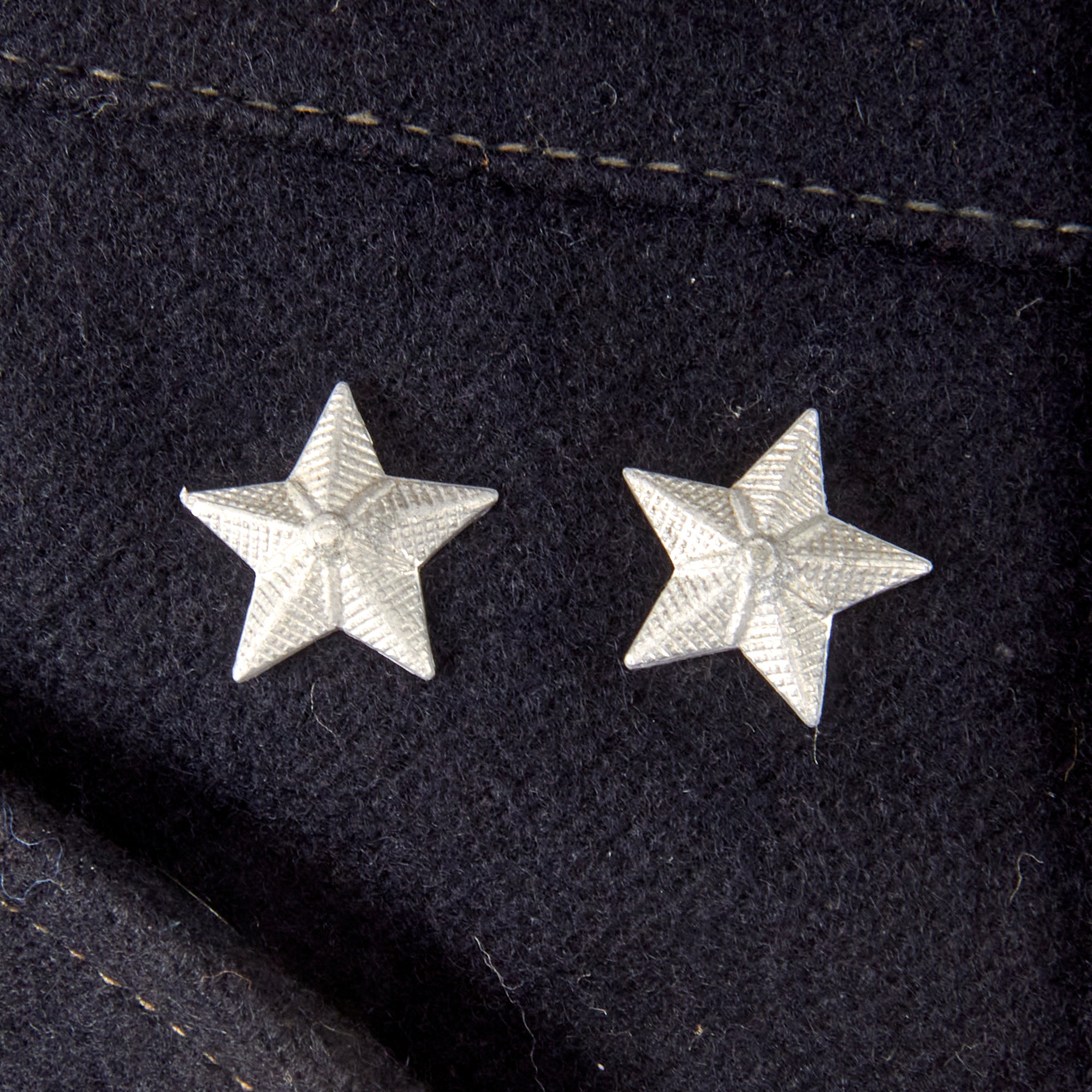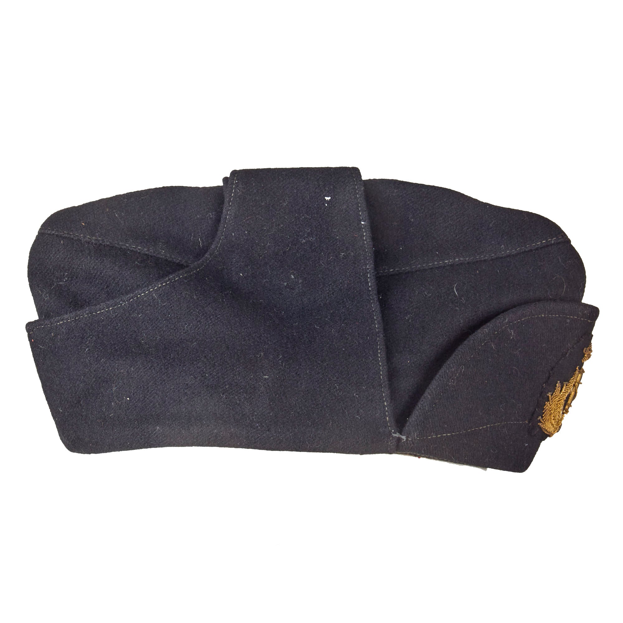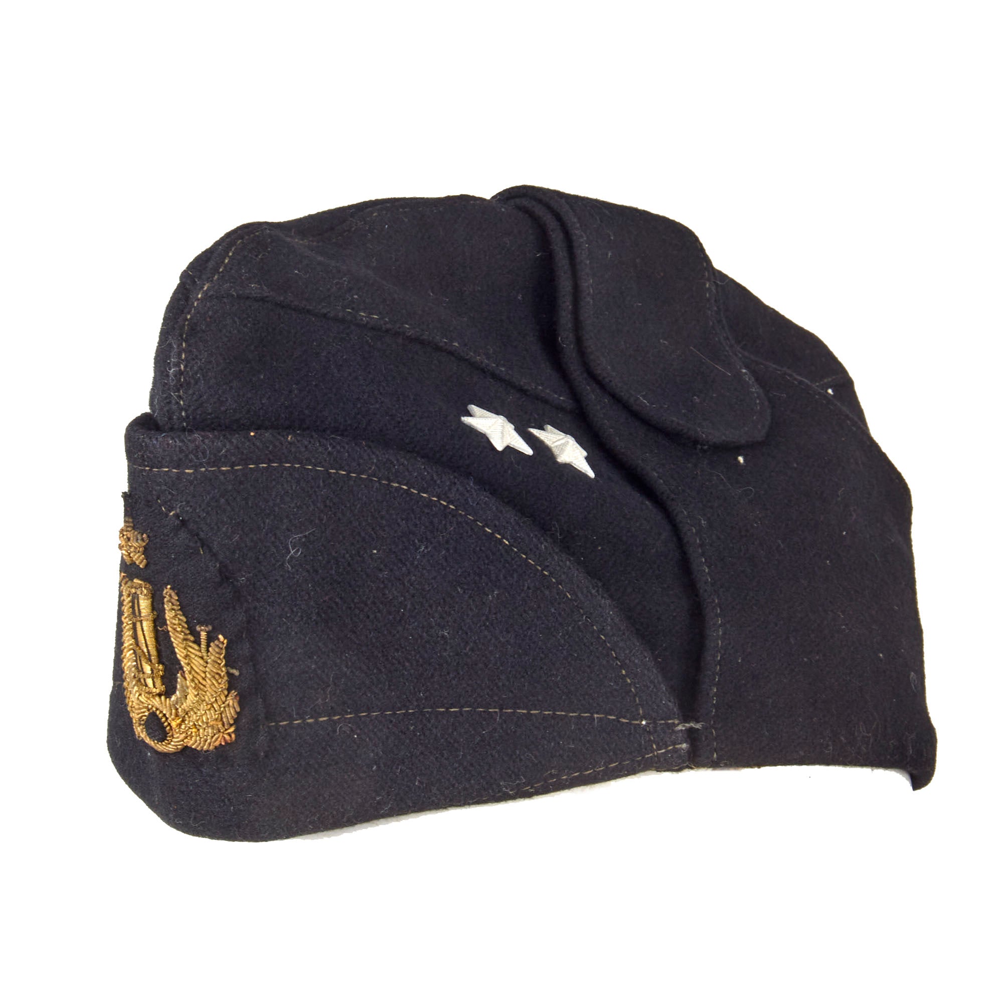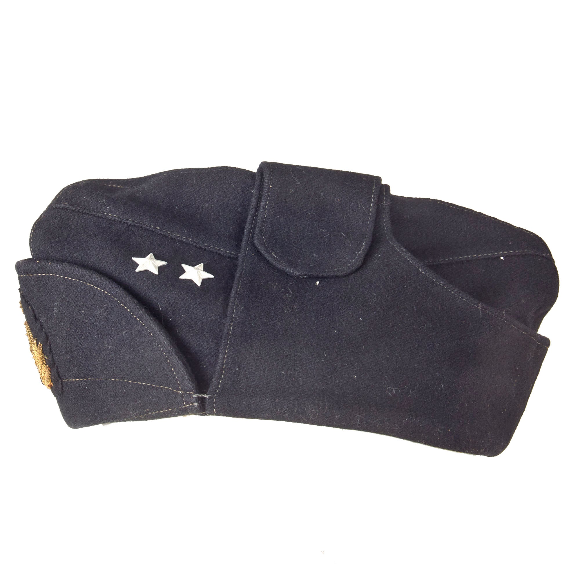 This black cotton field cap features fold down side panels that are held together over the crown of the cap by hidden stitches. The front visor is in the upright position. To the front is a bullion fascist wheat symbol which has retained much of its color but does have thread loss present. There are two metal star devices to the left denoting the rank of Captain.