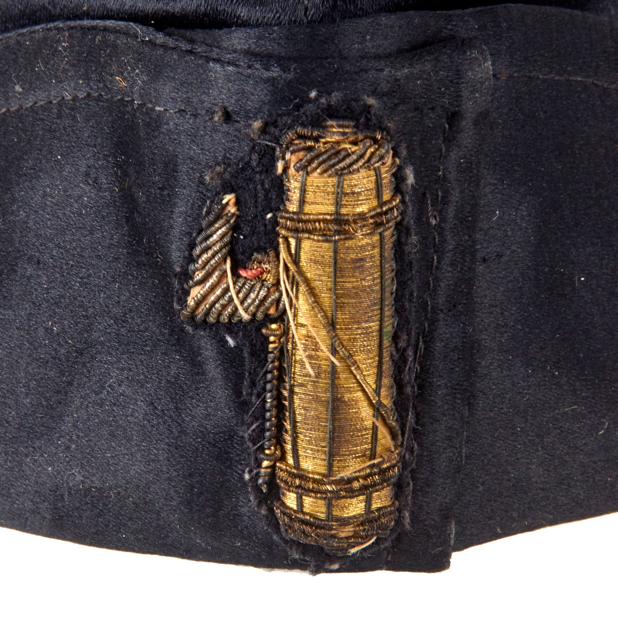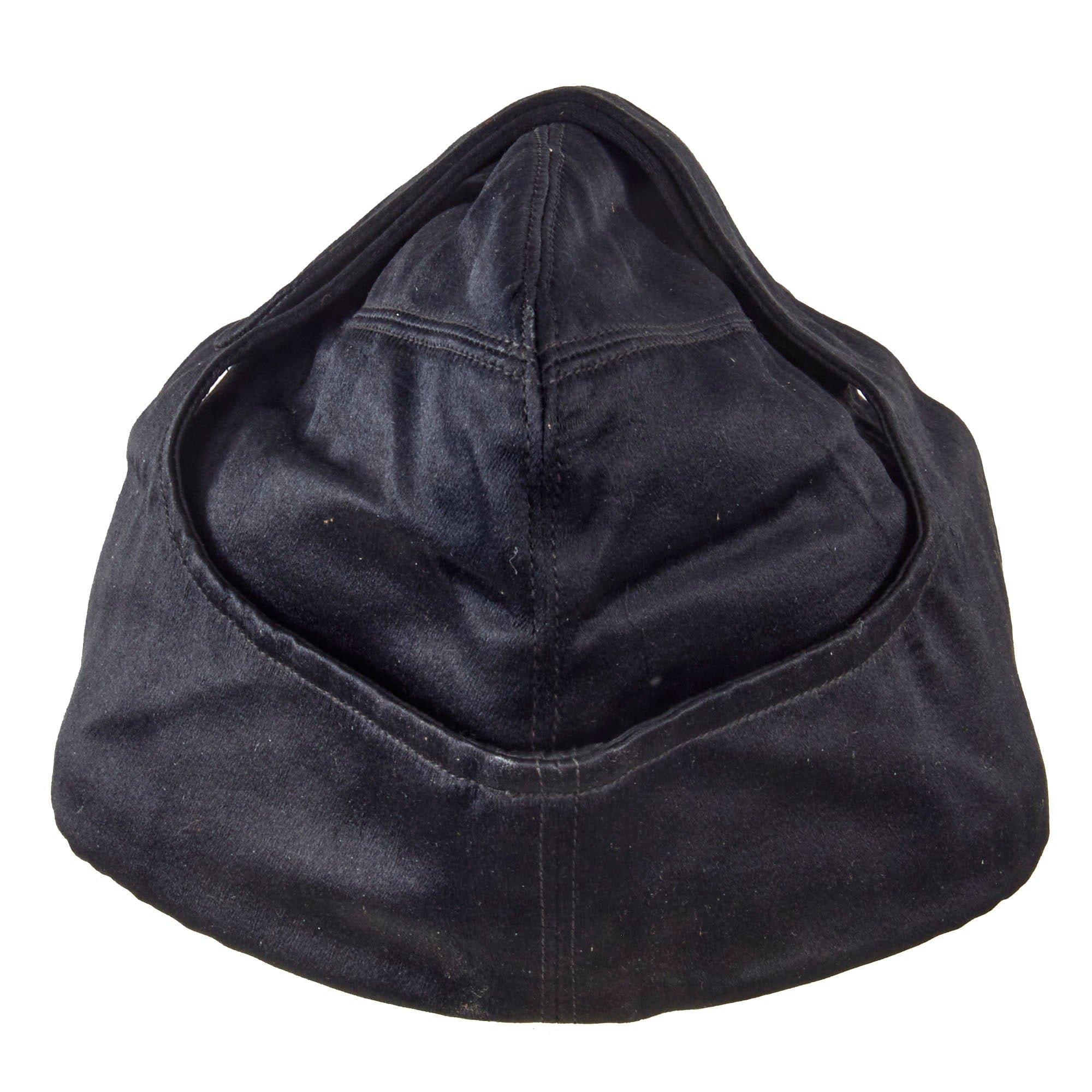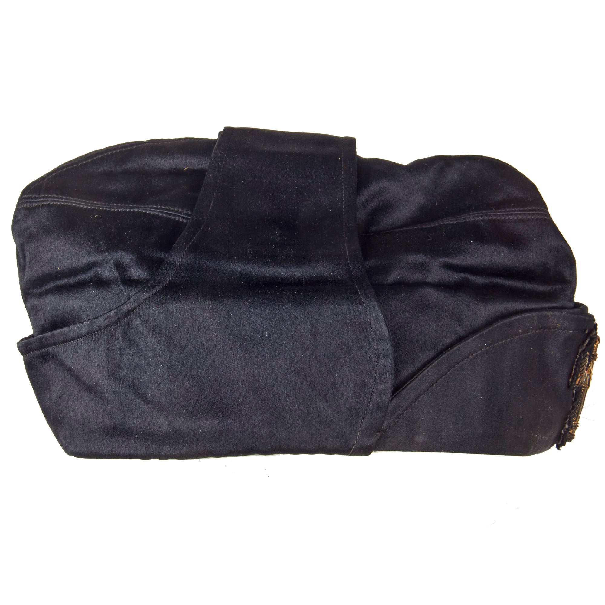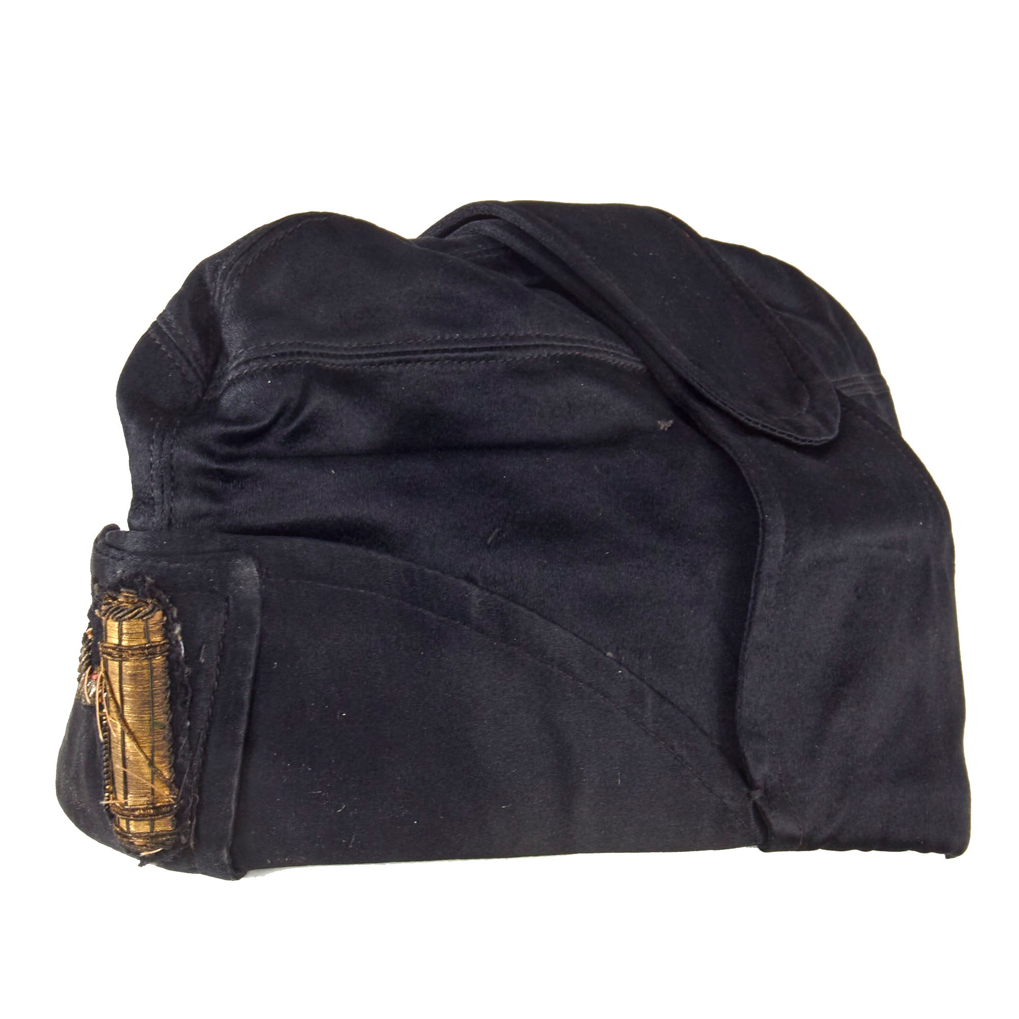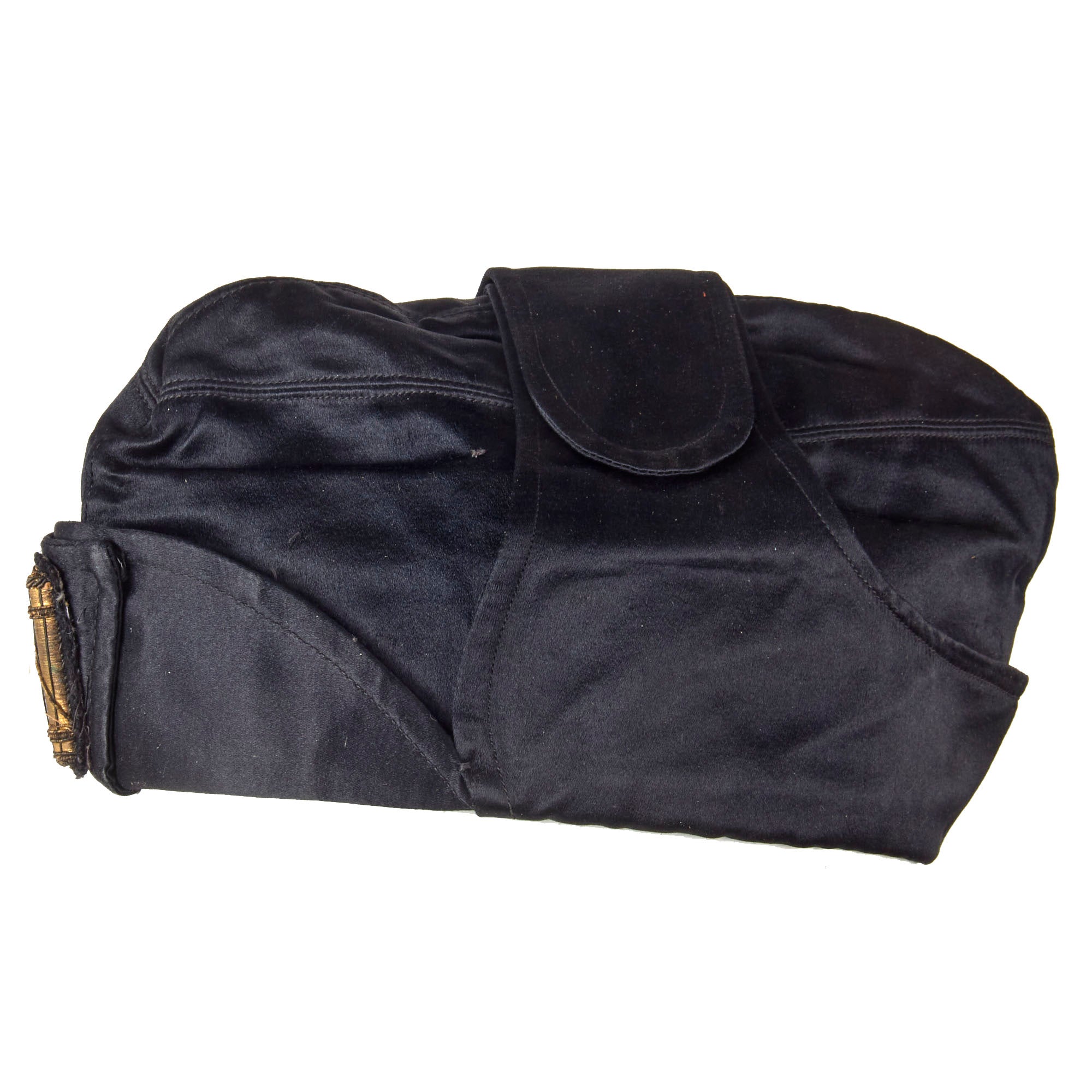 This gorgeous black silk field cap features fold down side panels that are held together over the crown of the cap by hidden stitches. The snaps for the flaps are intact but the stitching is rather weak, so be careful when removing them. The front visor is in the upright position. To the front is a bullion fascist wheat symbol which has retained much of its color but does have thread loss present.