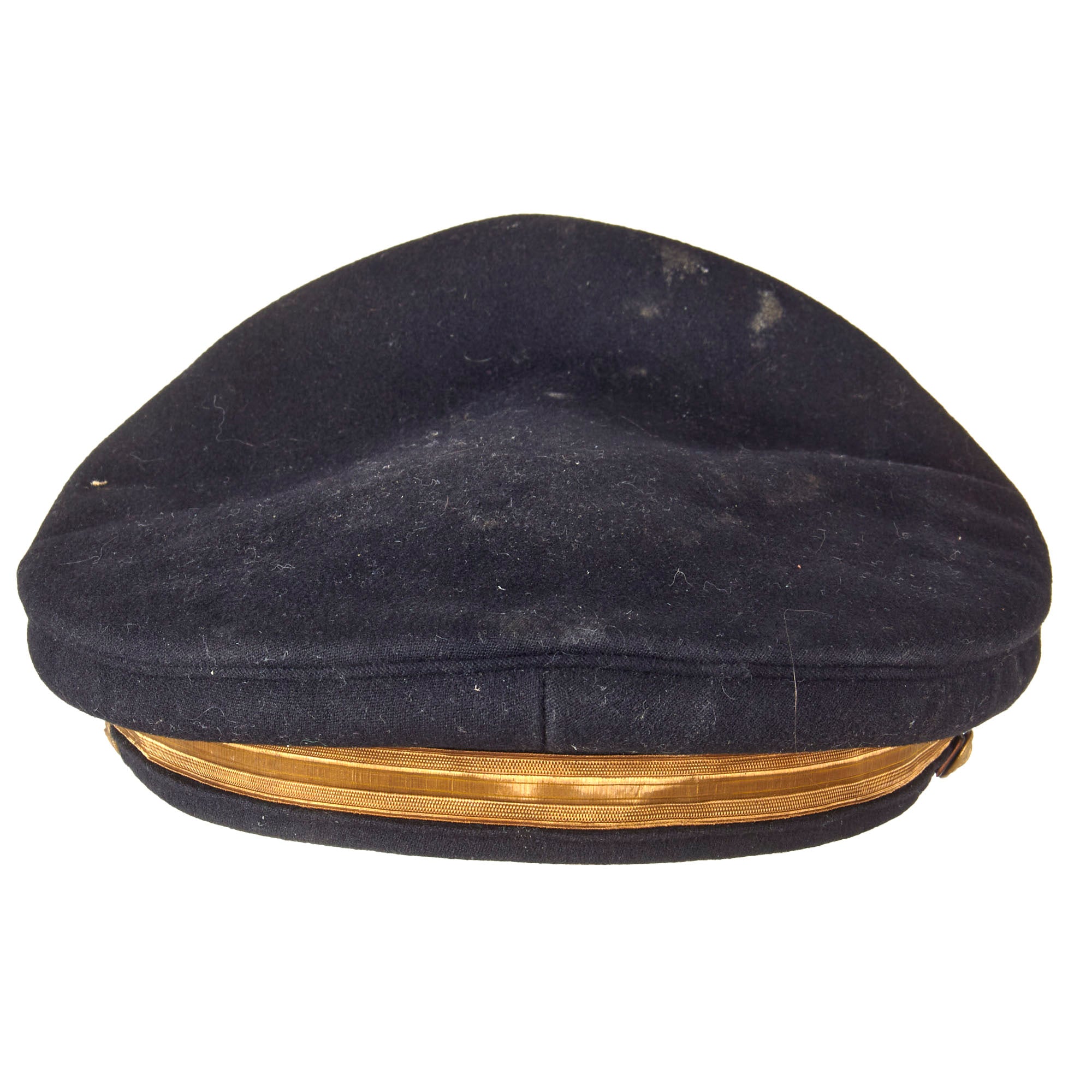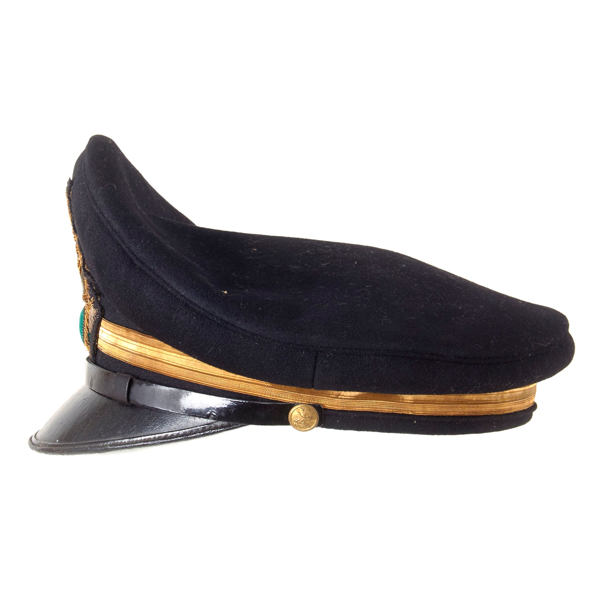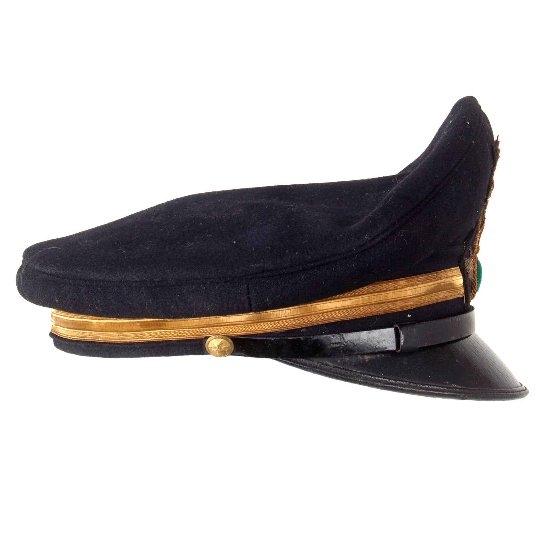 Original Item: Only One Available: This is an excellent condition genuine WWII Italian one bronze band strap visor hat, indicating the rank of Sottotenente or 2nd Lieutenant. The front of the cap has a lovely hand-embroidered bullion badge, showing an Eagle perched on a fasces over two crossed axes with a green circle in the center. This is the insignia of the Engineers.