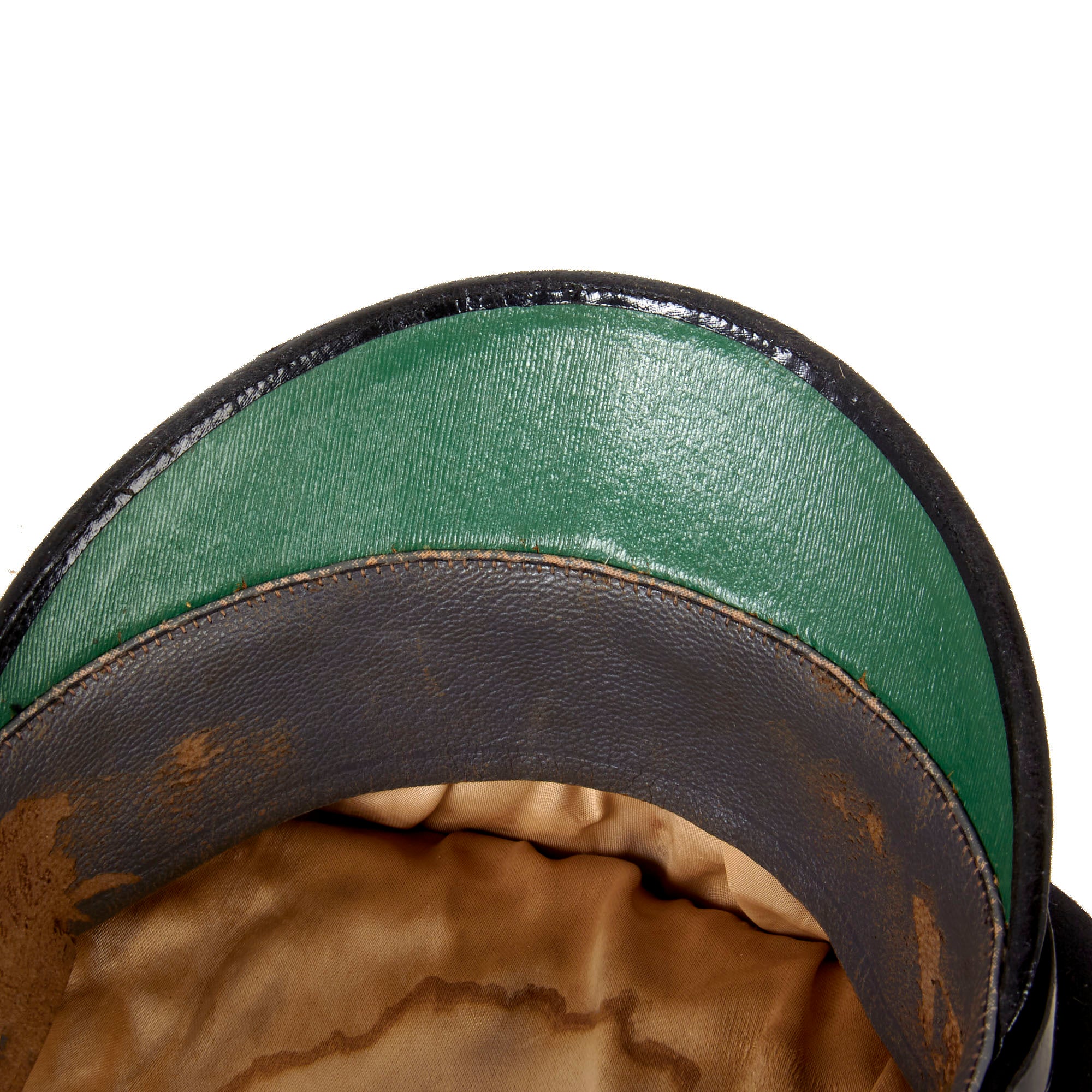 The interior shows heavy wear but the grey leather sweatband is in good shape overall with heavy staining to one side. The cap is roughly size 55. The maker’s tag is gone, torn away long ago along with the celluloid sweatband. The lining is heavily stained and worn.
