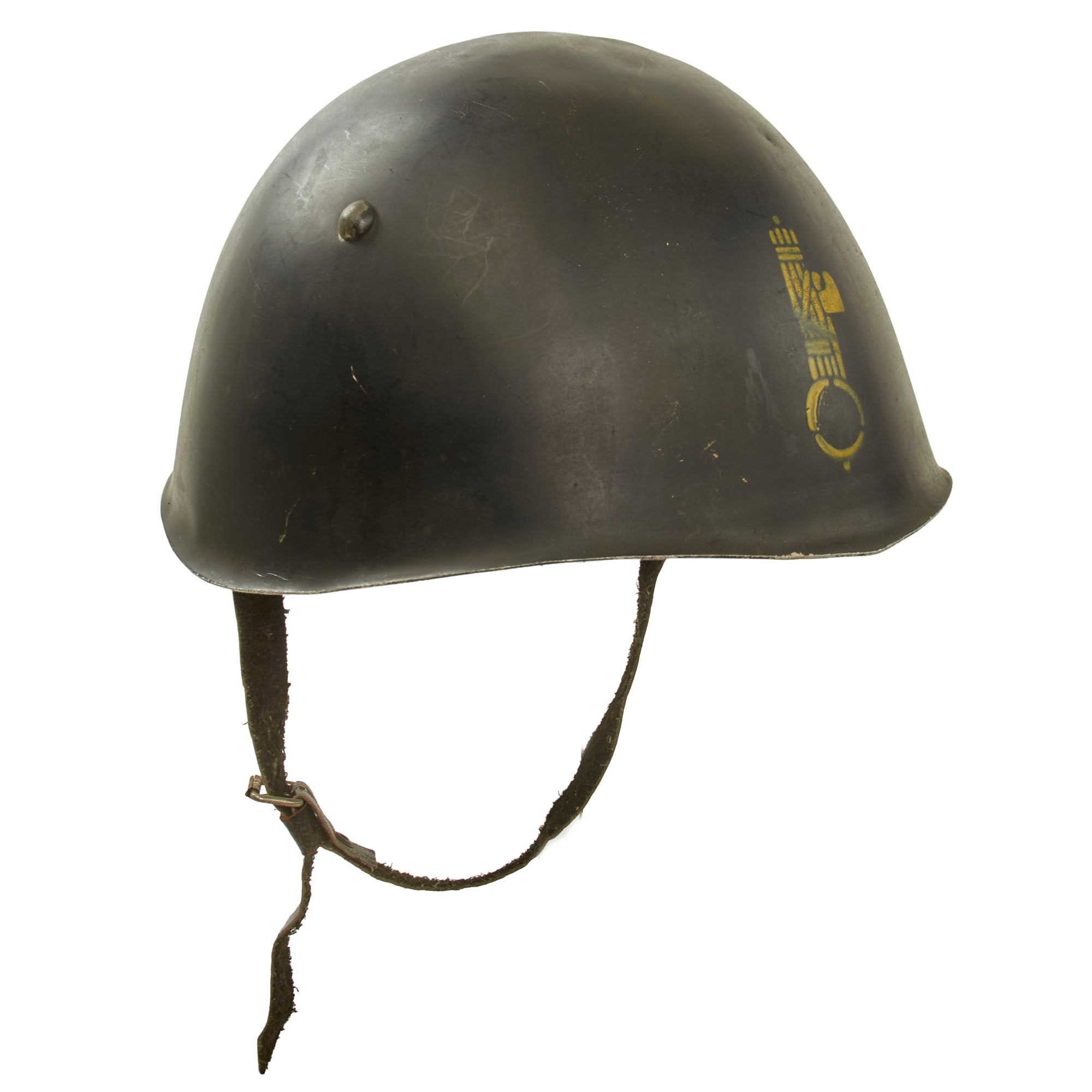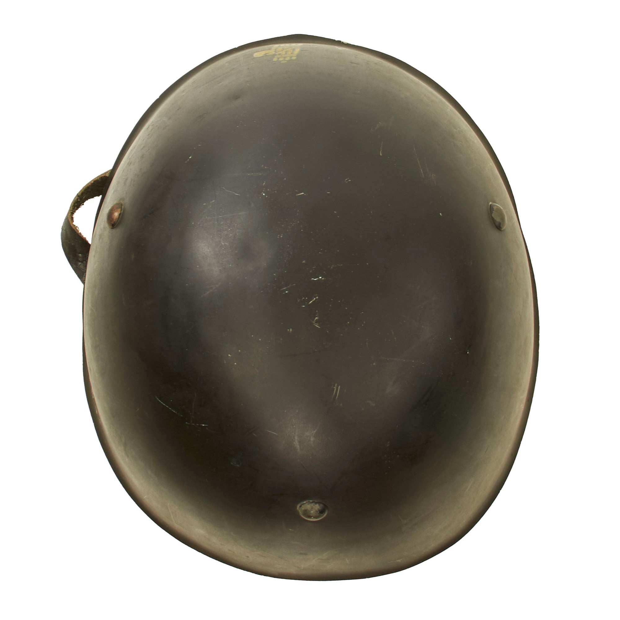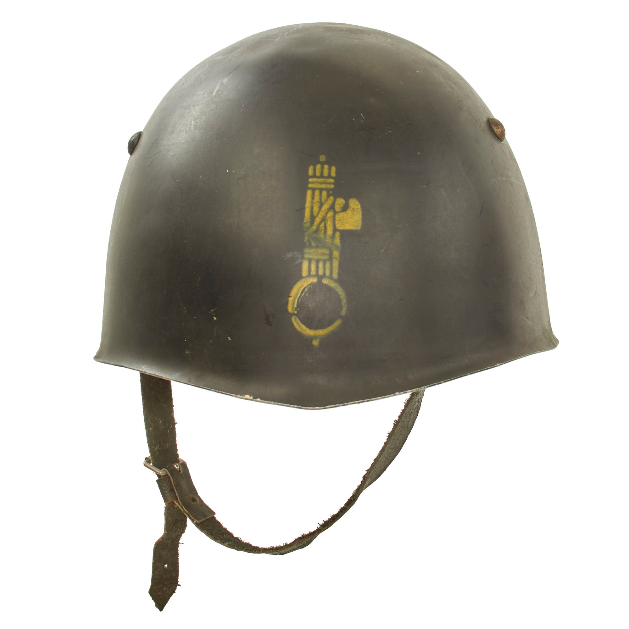 This is a very interesting lightweight variation of the Italian M33 helmet, meant for parade wear. It is not protective in the same way as a normal M33, and is likely made from aluminum. The shell was painted black with a yellow MVSN militia stencil to the front. The three rounded rivets are meant to resemble the ventilation holes, but they are not holes on this variant.
