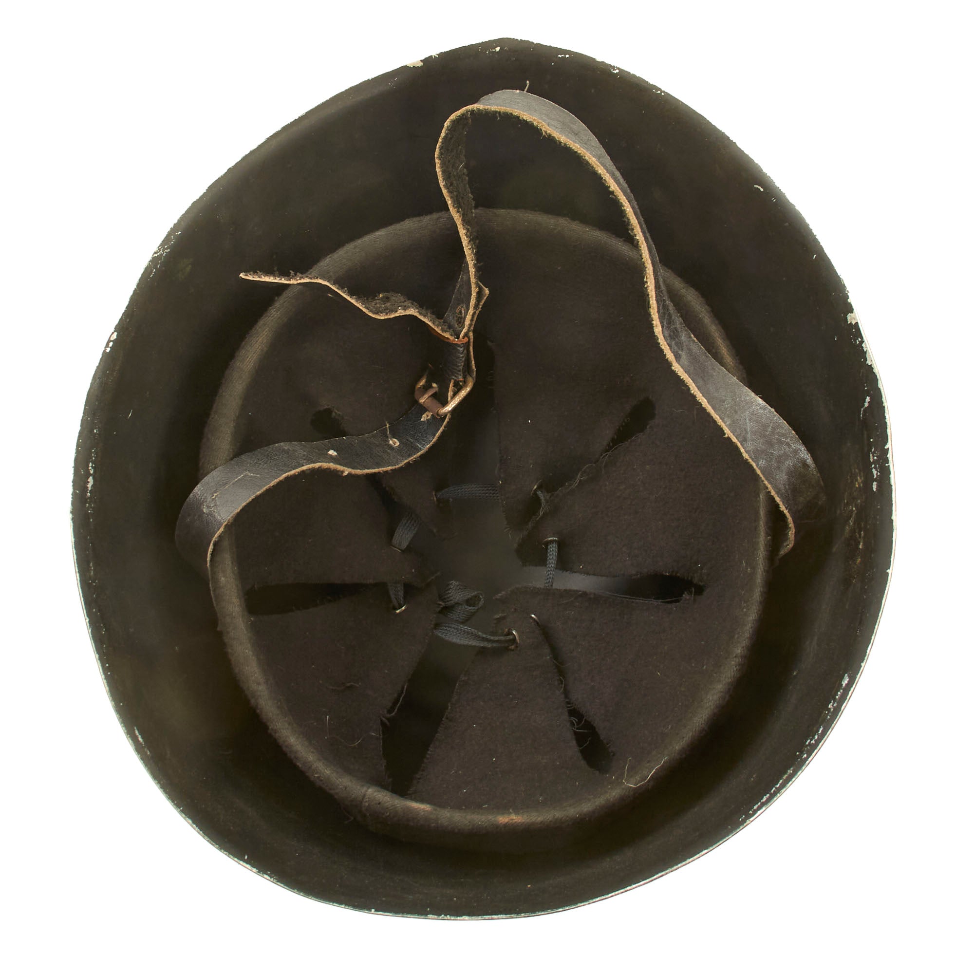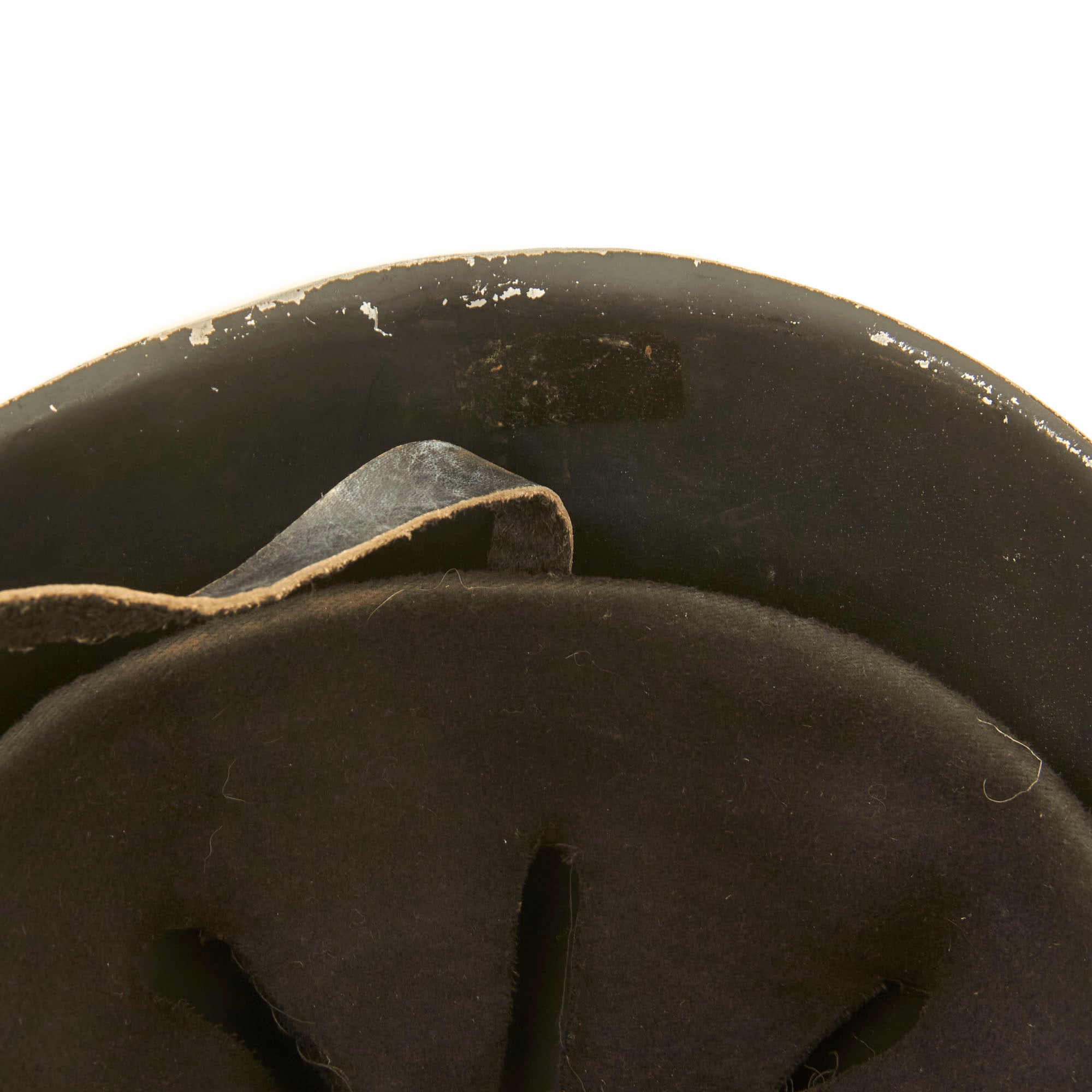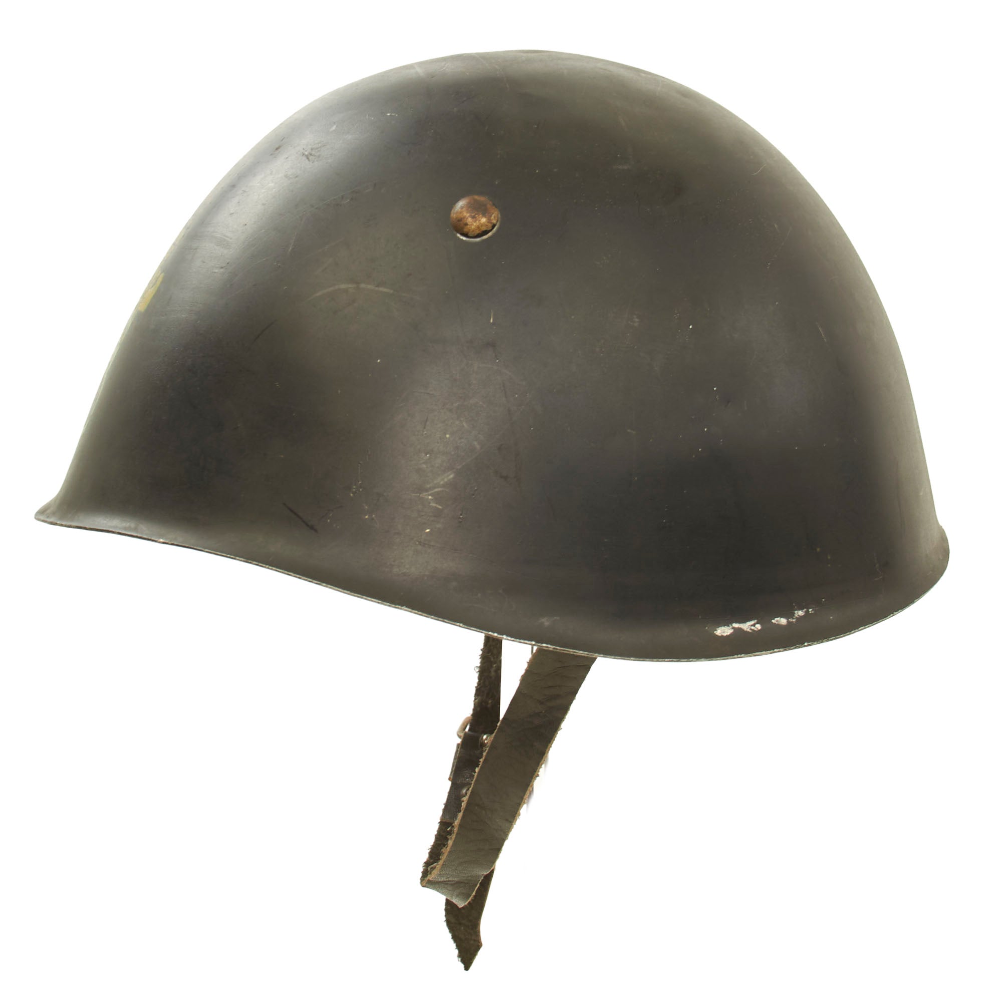 This is a very interesting lightweight variation of the Italian M33 helmet, meant for parade wear. It is not protective in the same way as a normal M33, and is likely made from aluminum. The shell was painted black with a yellow MVSN militia stencil to the front. The three rounded rivets are meant to resemble the ventilation holes, but they are not holes on this variant.