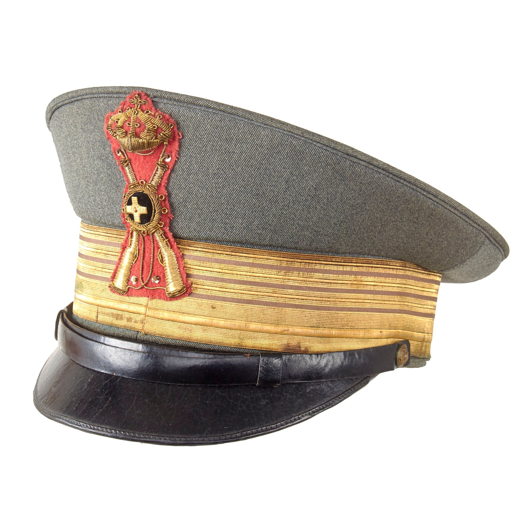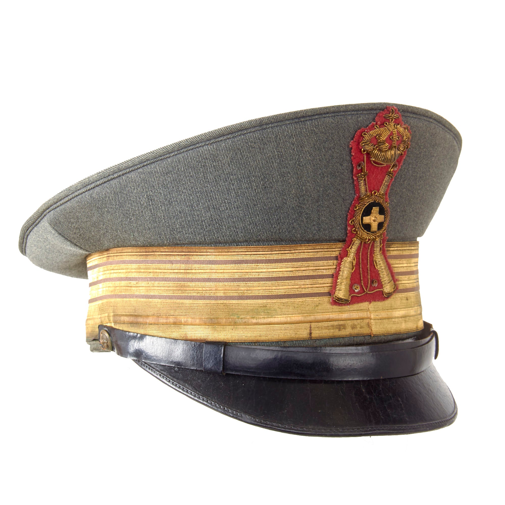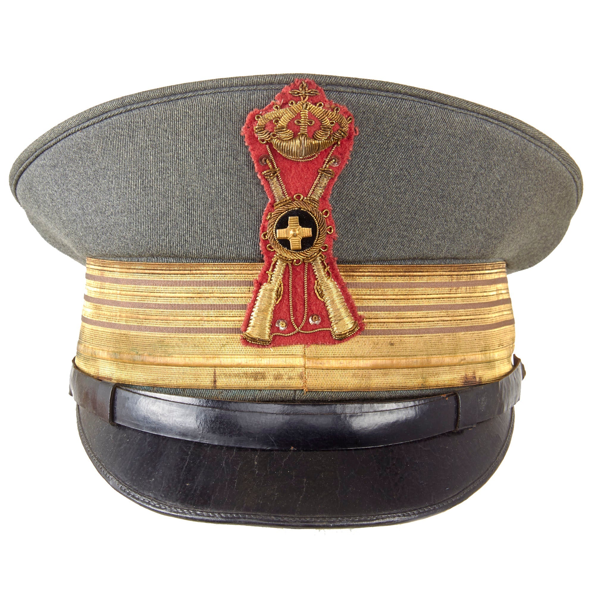 • Original Item: Only One Available: This is an excellent condition genuine WWII Italian 5 bronze band strap visor hat, indicating the rank of Colonel. The front of the cap has a lovely hand-embroidered bullion badge, showing a crown over crossed rifles with a cross device in the center, the insignia of the Italian Infantry.