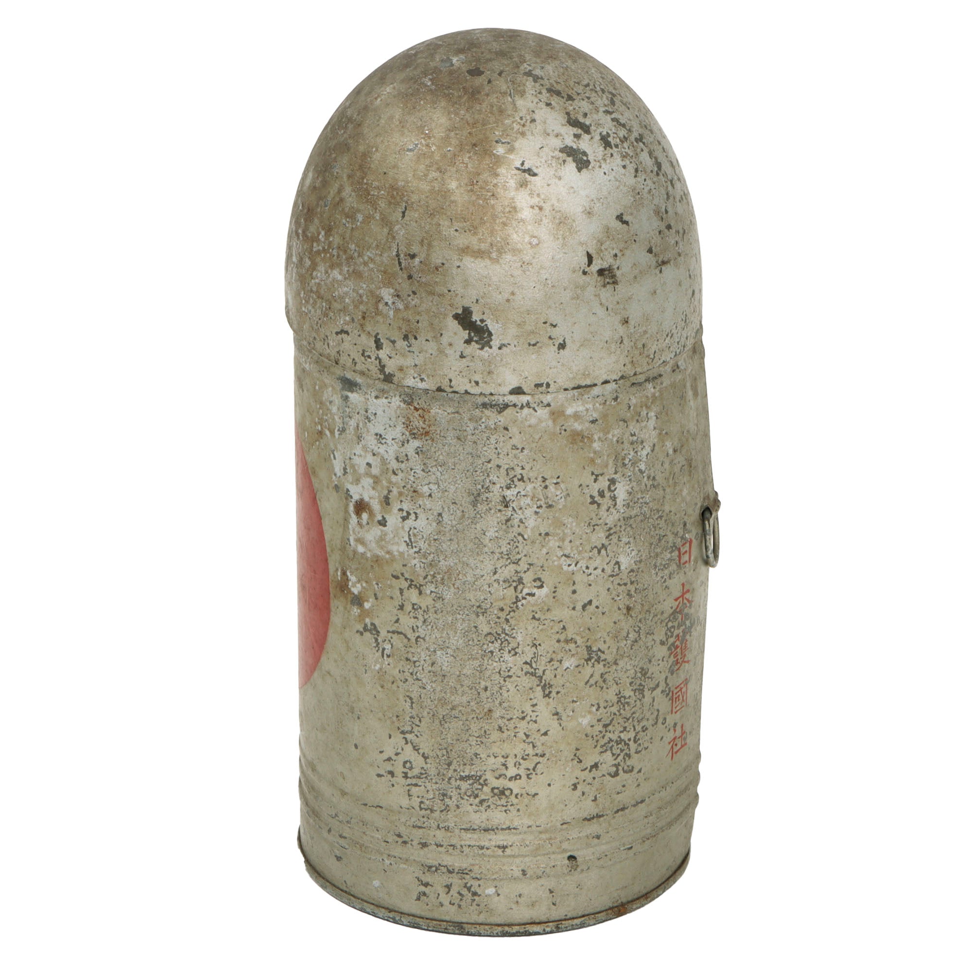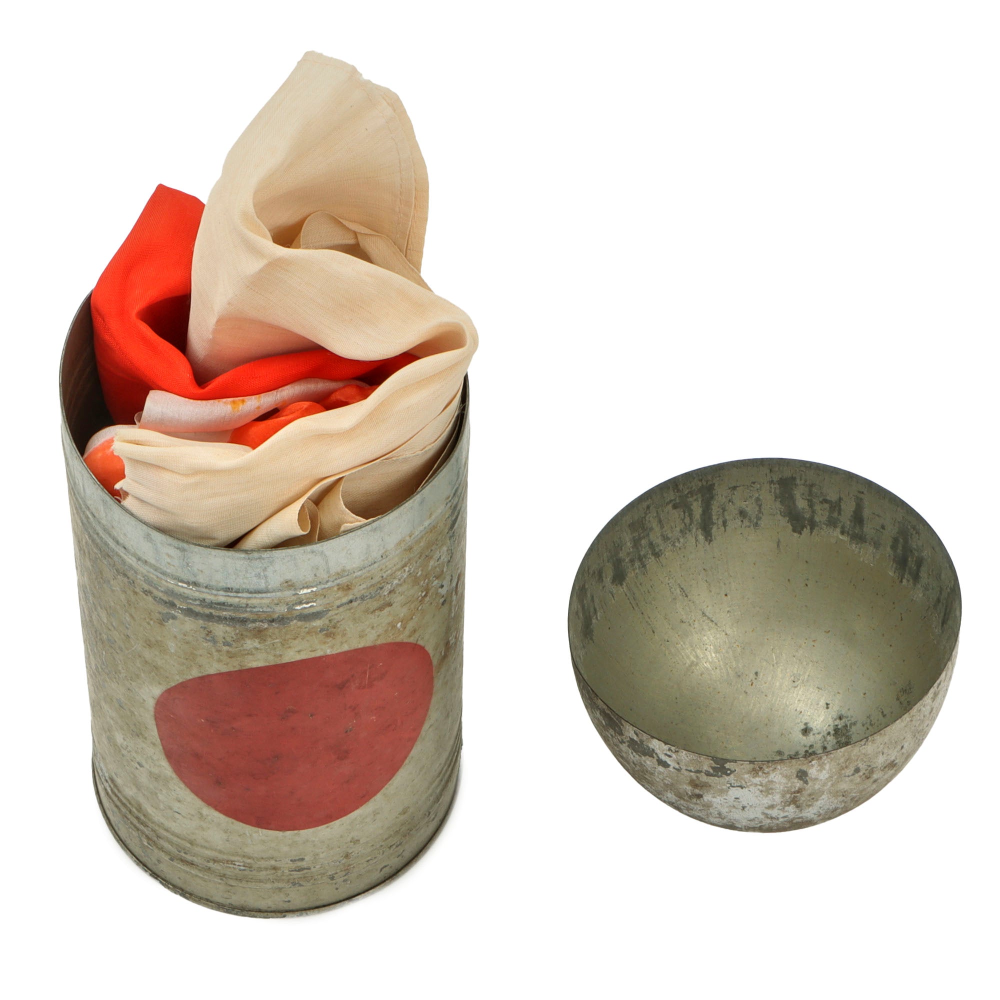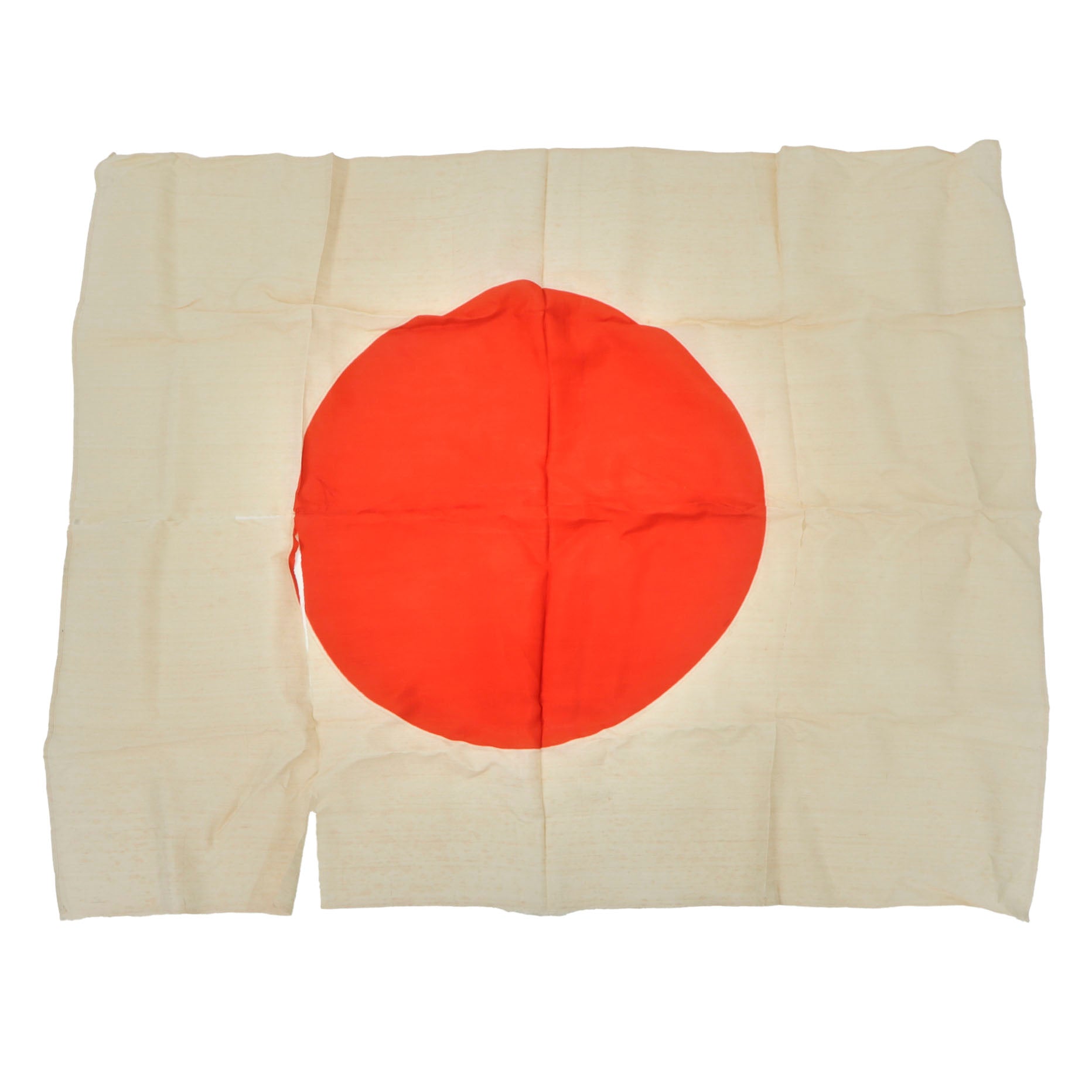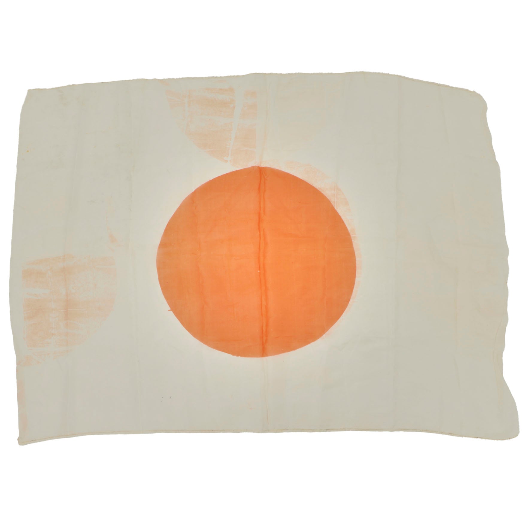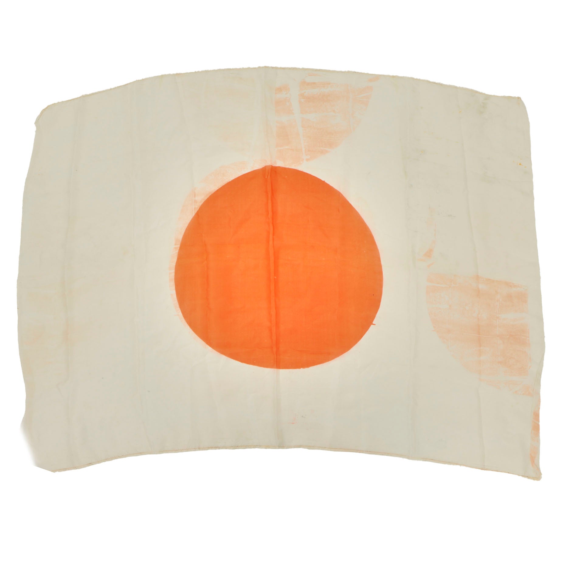 Original Item: Only One Set Available. Brought back from the Pacific Theater of WWII, this is a very interesting Japanese Army WWII Flag set! It consists of a pair of National "Meatball" flags. One flag is silk/rayon while the other is a thin cotton which is tearing heavily. Both flags have the designs dyed onto them. They come contained in a very interesting case with the red “Meatball” painted on the side.